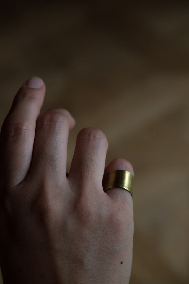 あえて傷やなまし跡(バーナーで炙った跡)を残すような加工で仕上げております。 ◯厚さ 0.6ミリ ○幅 1.2cm ◯内径 1.3cm 〇サイズフリー 0〜5号 ご希望のサイズに合わせてお送りします。 備考欄にご記入ください。 記入がない場合は、約2号です。 ※大きいサイズにも調整できますが、アームの端と端の間が開きますのでご注意ください。(5号だと間は約8ミリほど開きます)小さいサイズの場合は(0〜1号)、端をカットし、端と端が重ならないよう調整します。 発送まで3週間かかる場合があります。お急ぎの方は備考欄でお伝えください。 ※真鍮素材にメッキなどのコーティングはしておりませんので、素材の経年変化により色が変わります。 月日が経ち、真鍮のヴィンテージ感のある風合いになりますことをご了承頂いたうえご購入をお願いいたします。 クエン酸水に5分浸していただくと最初の色に戻ります。 ※下記のABOUTに注意事項を記載しておりますので、必ずお読みください。 https://fog.base.ec/about aftermaintenance ◯経験変化によって黒ずんだリングをのくすみを綺麗にします。 行きの送料のみのご負担で承ります。 ◯リングの歪み直し 行きの送料のみのご負担で承ります。