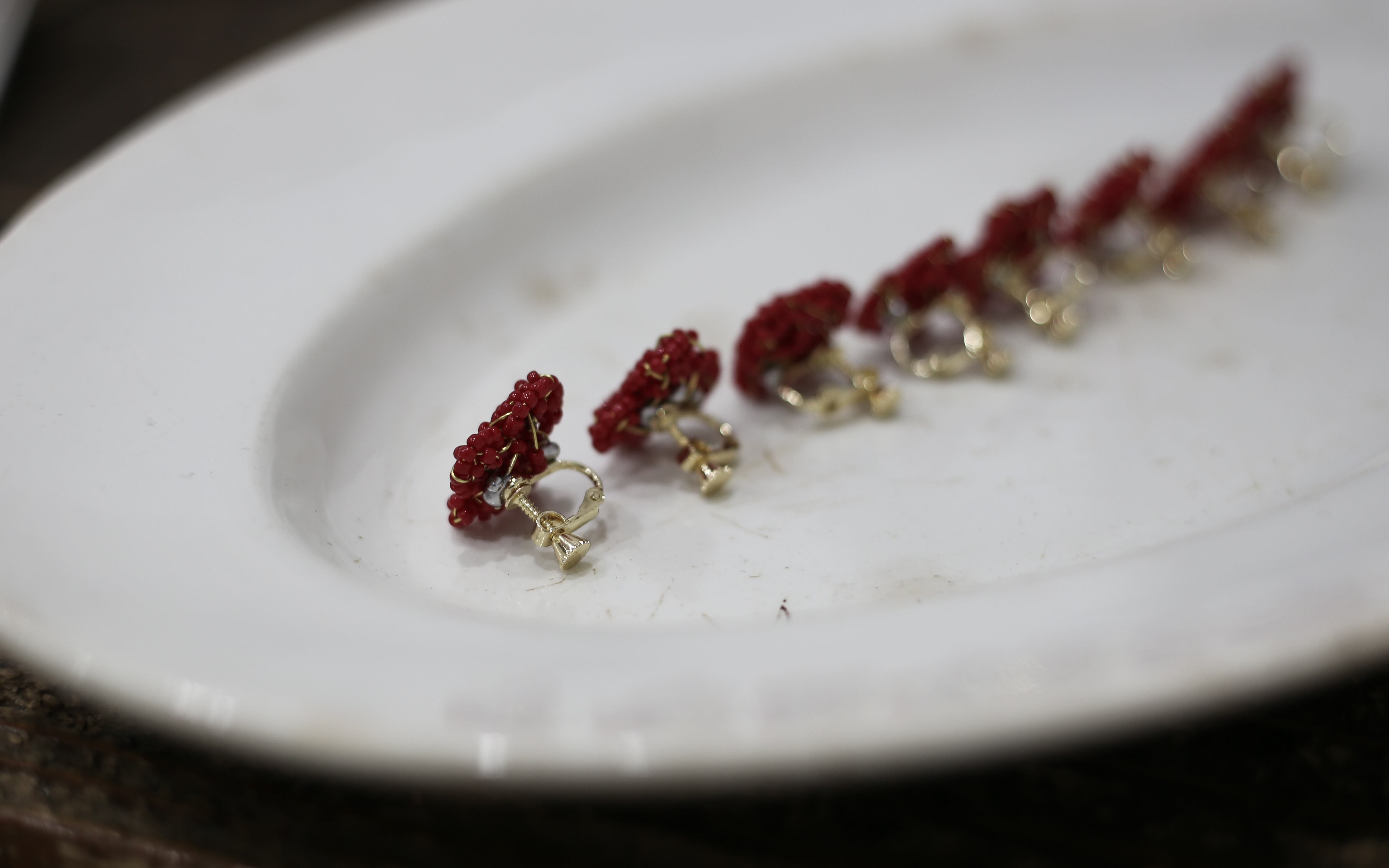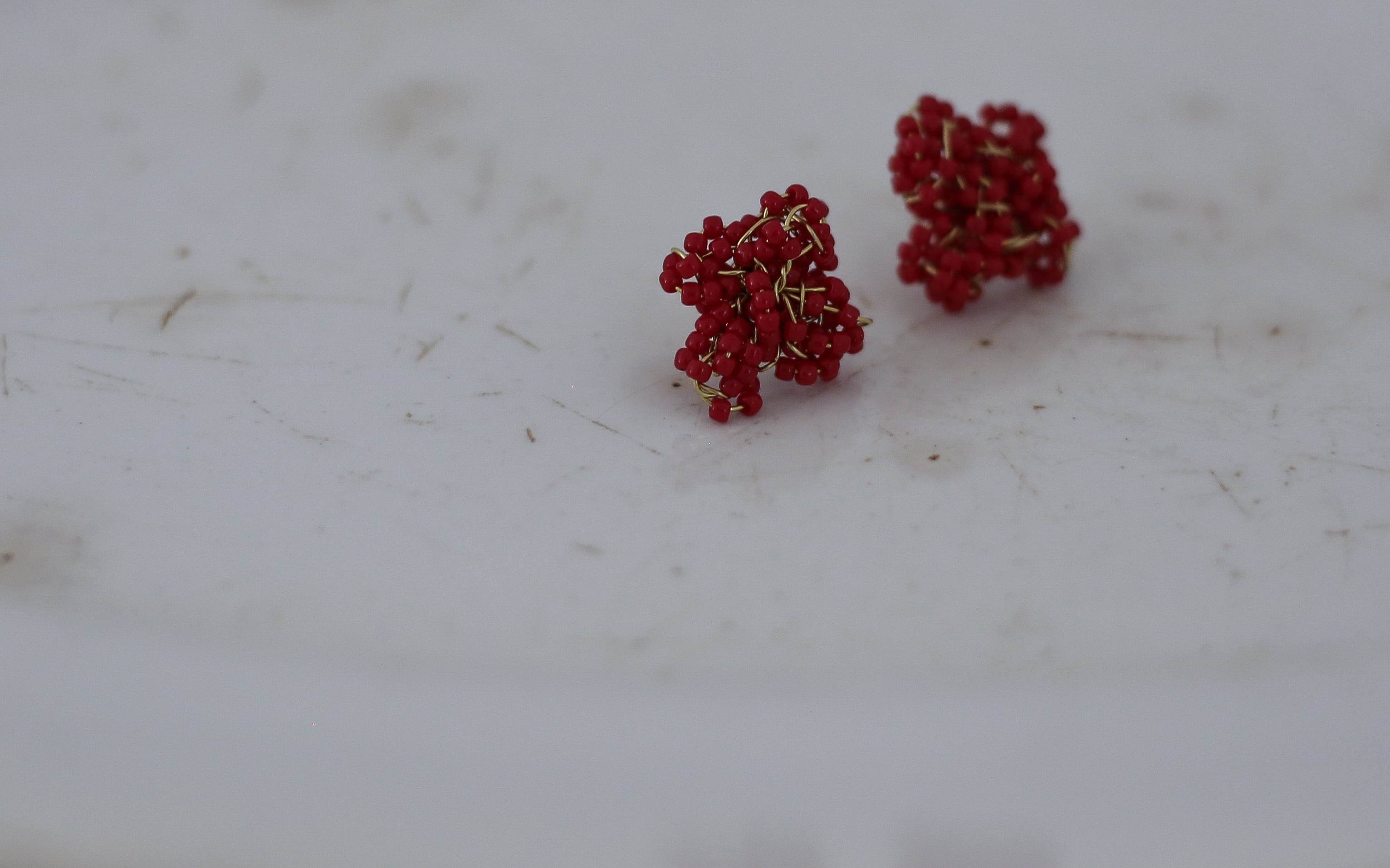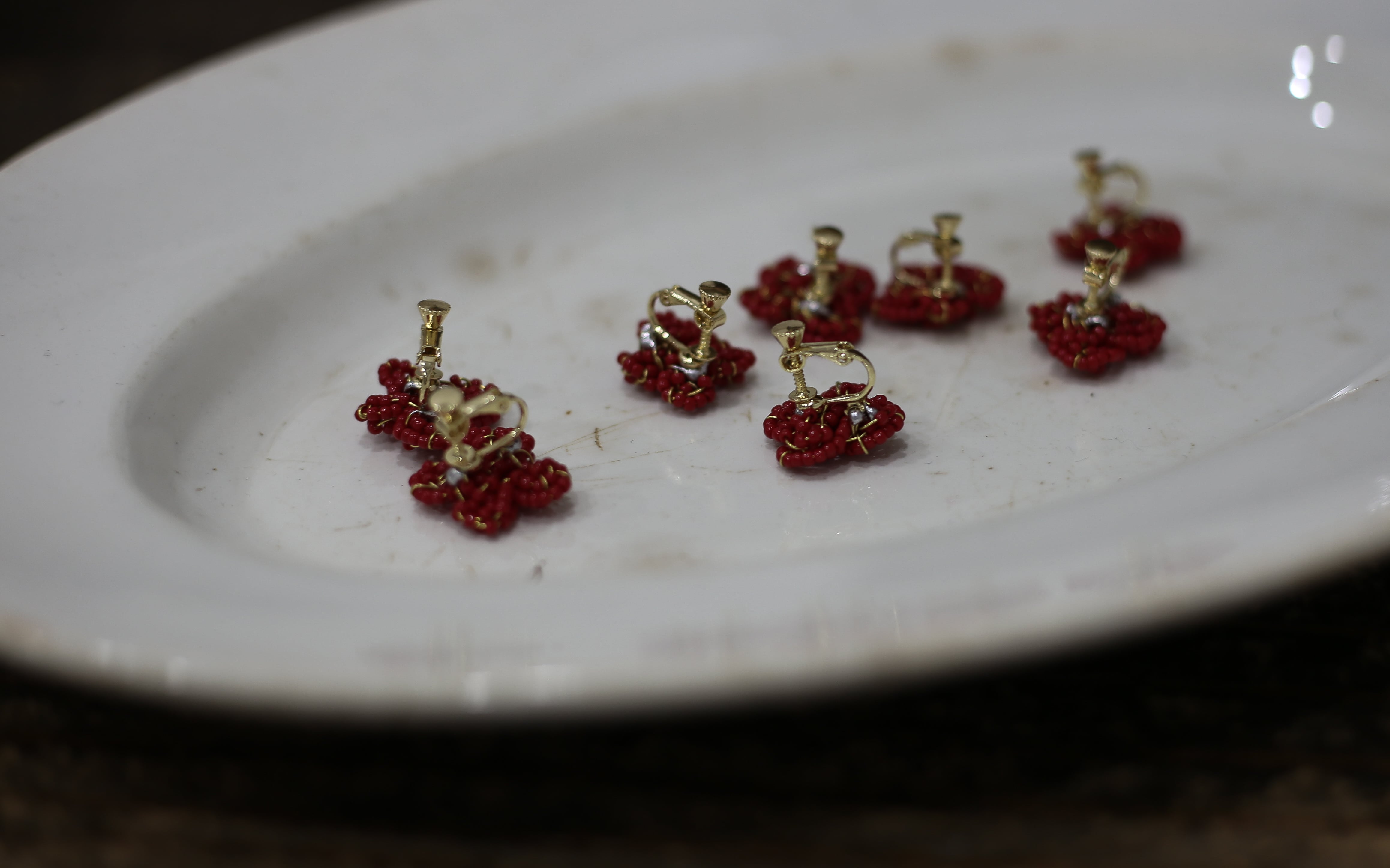 赤のビーズに真鍮のワイヤーで仕立ております。