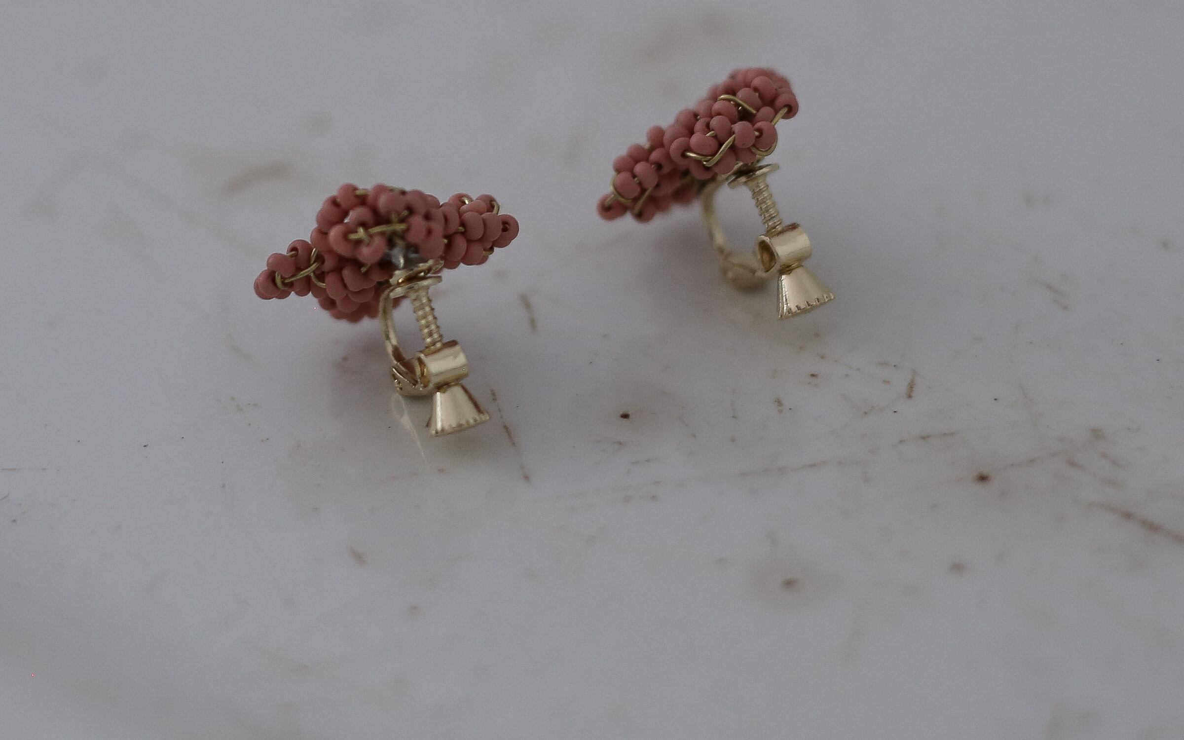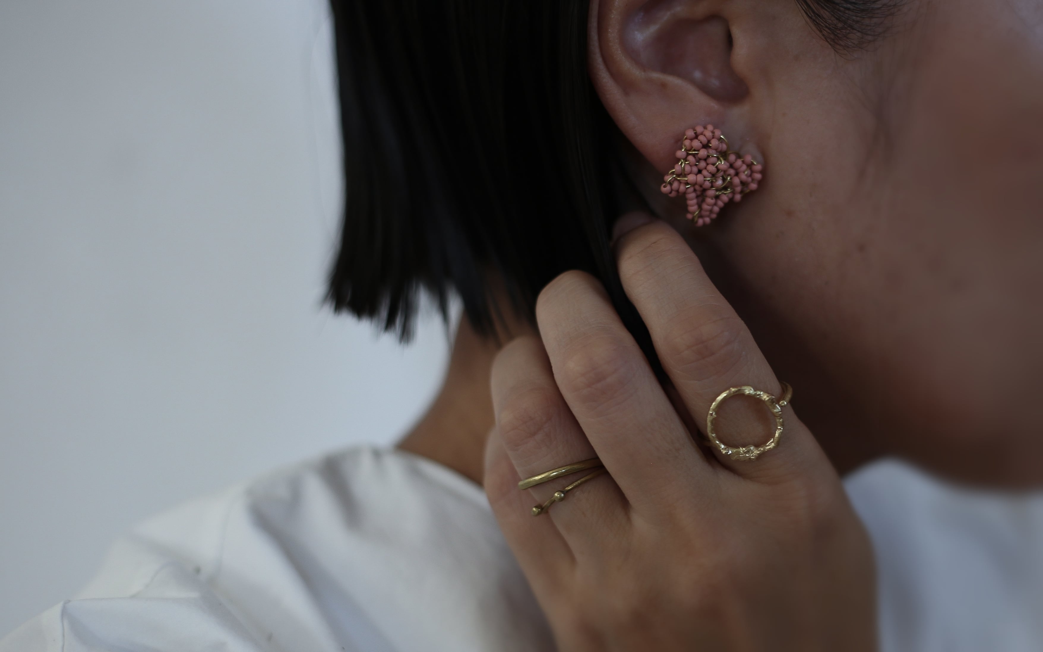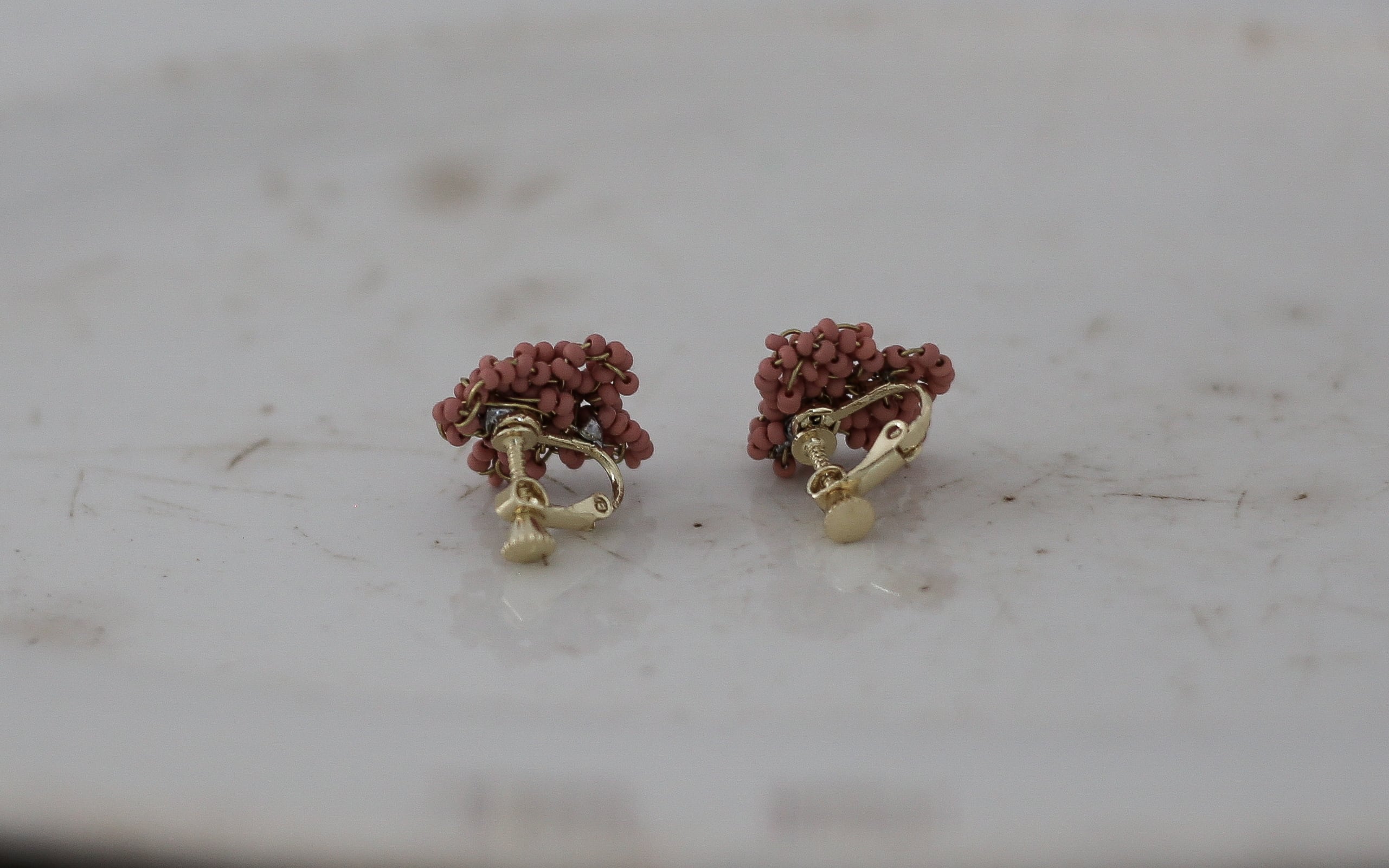 柔らかいトーンのくすんだピンク色のビーズに真鍮ワイヤーで仕立ております。