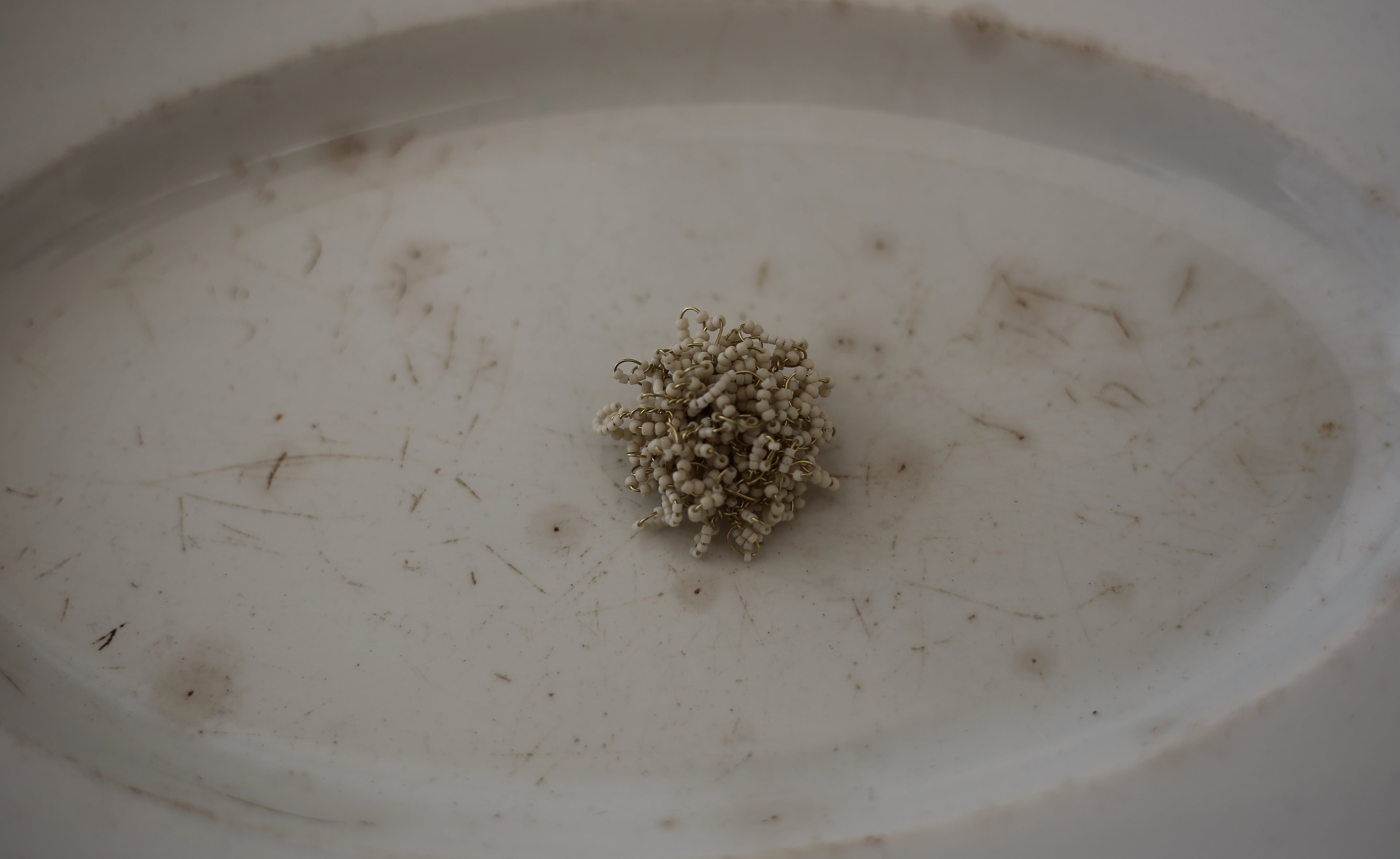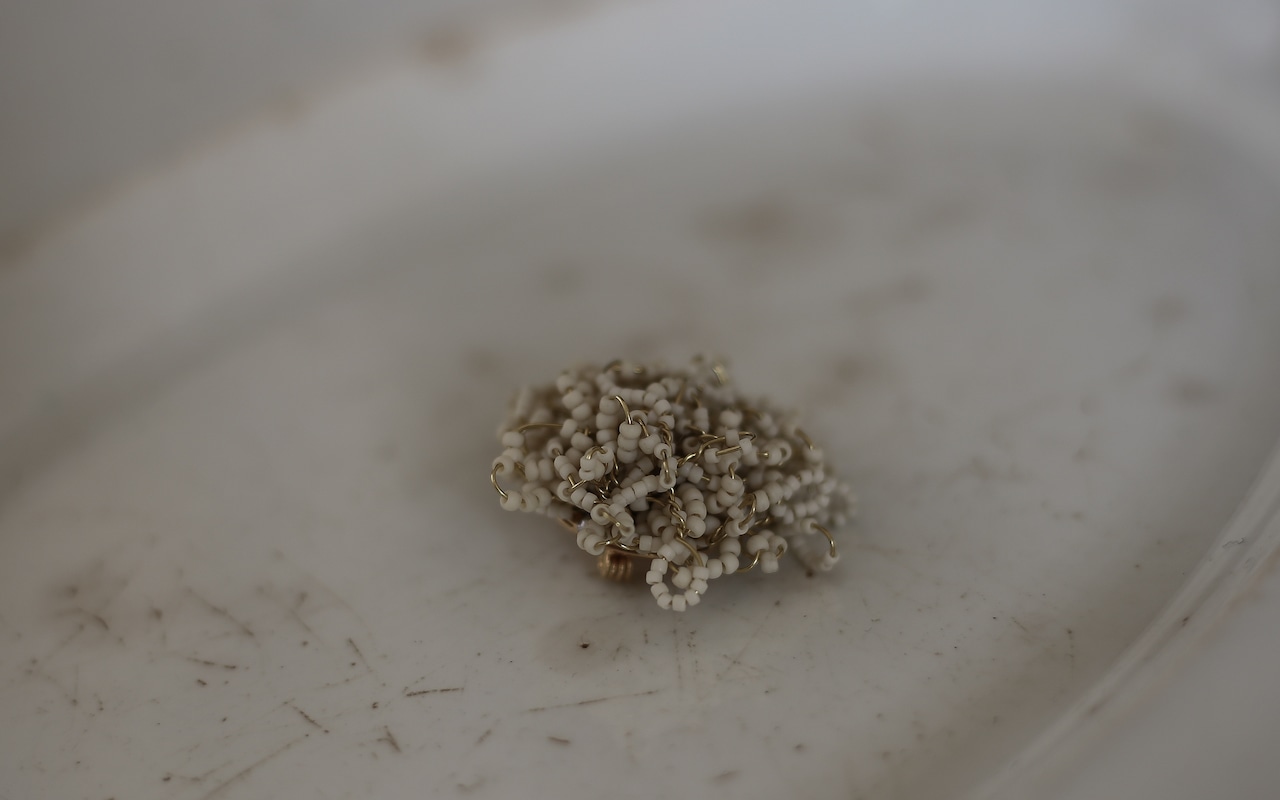 アイボリーのFog定番のビーズと極小1ミリのビーズの2種使用し、ゴールドの真鍮ワイヤーで仕立ております。
