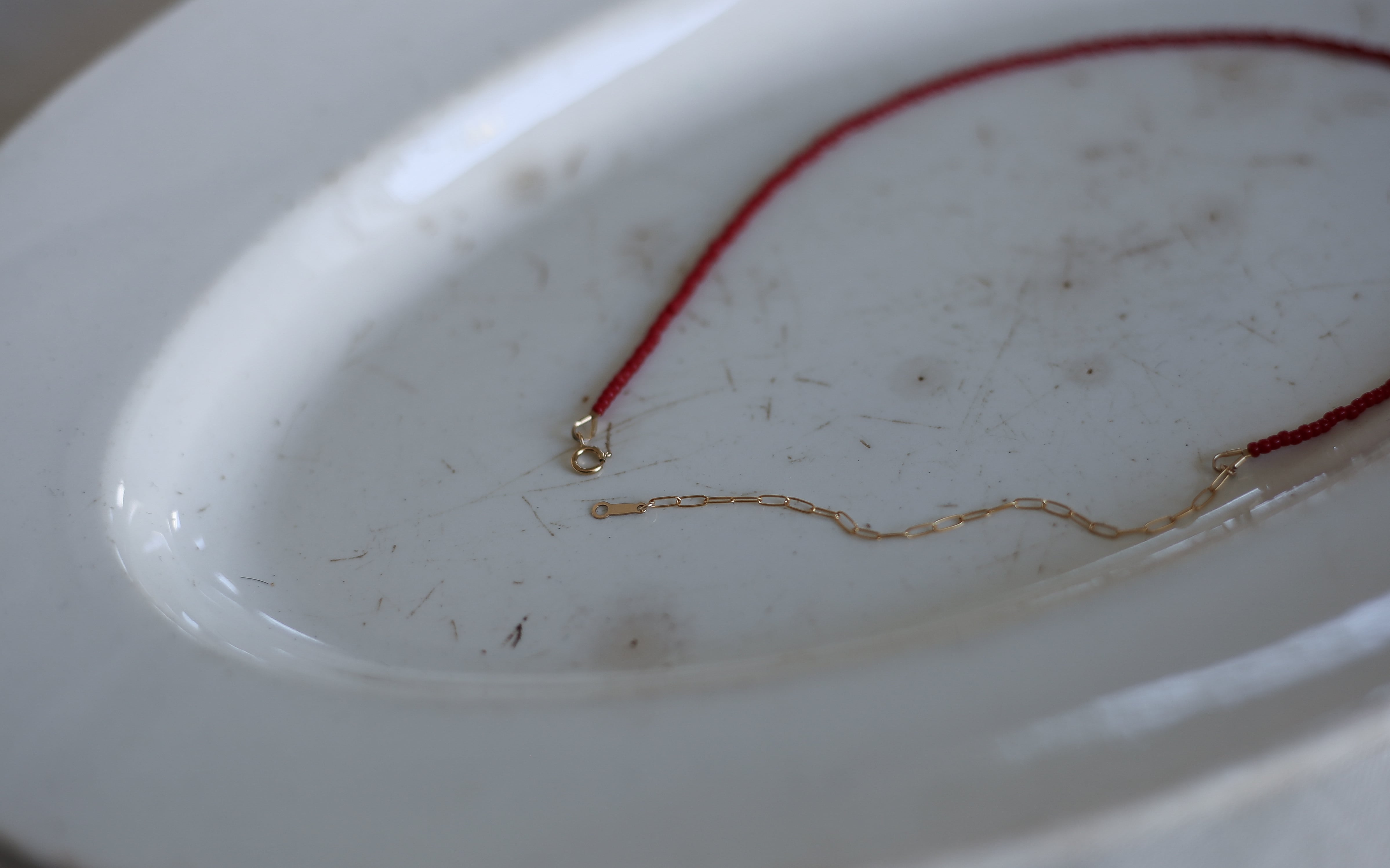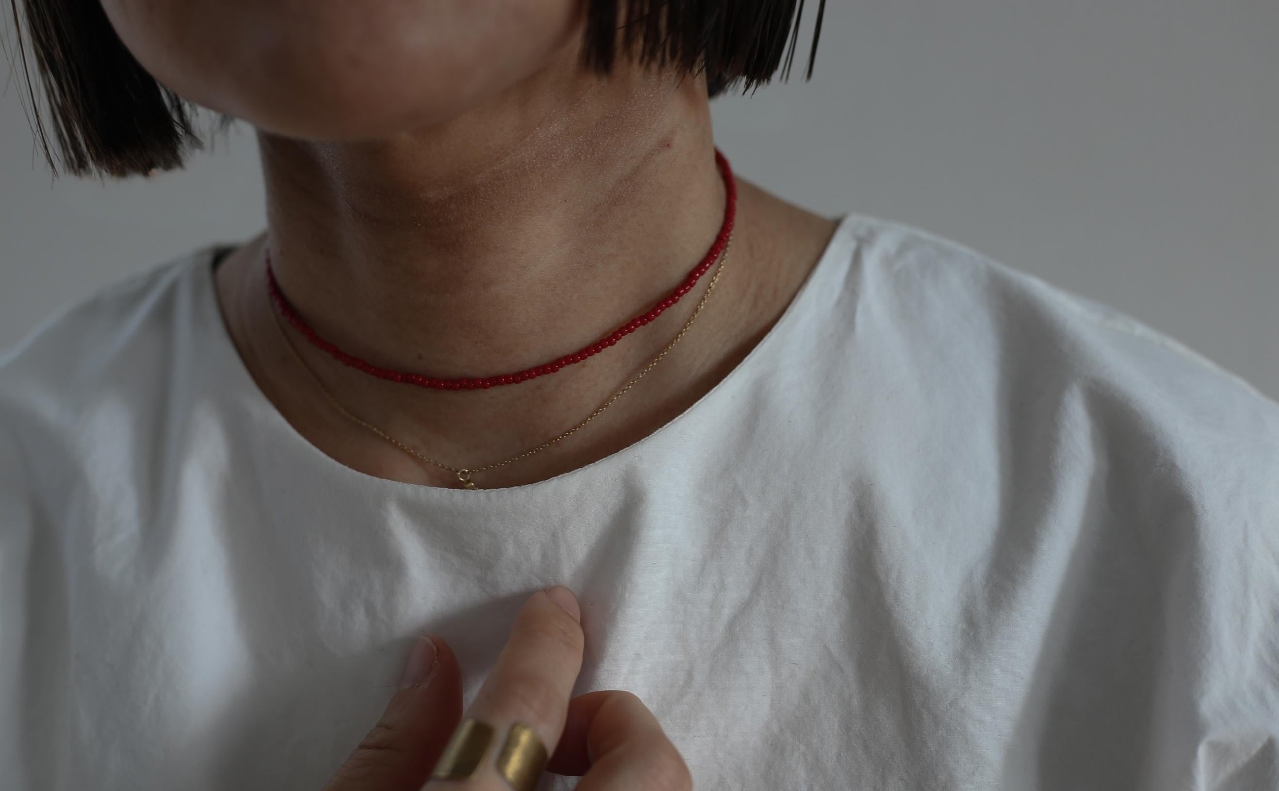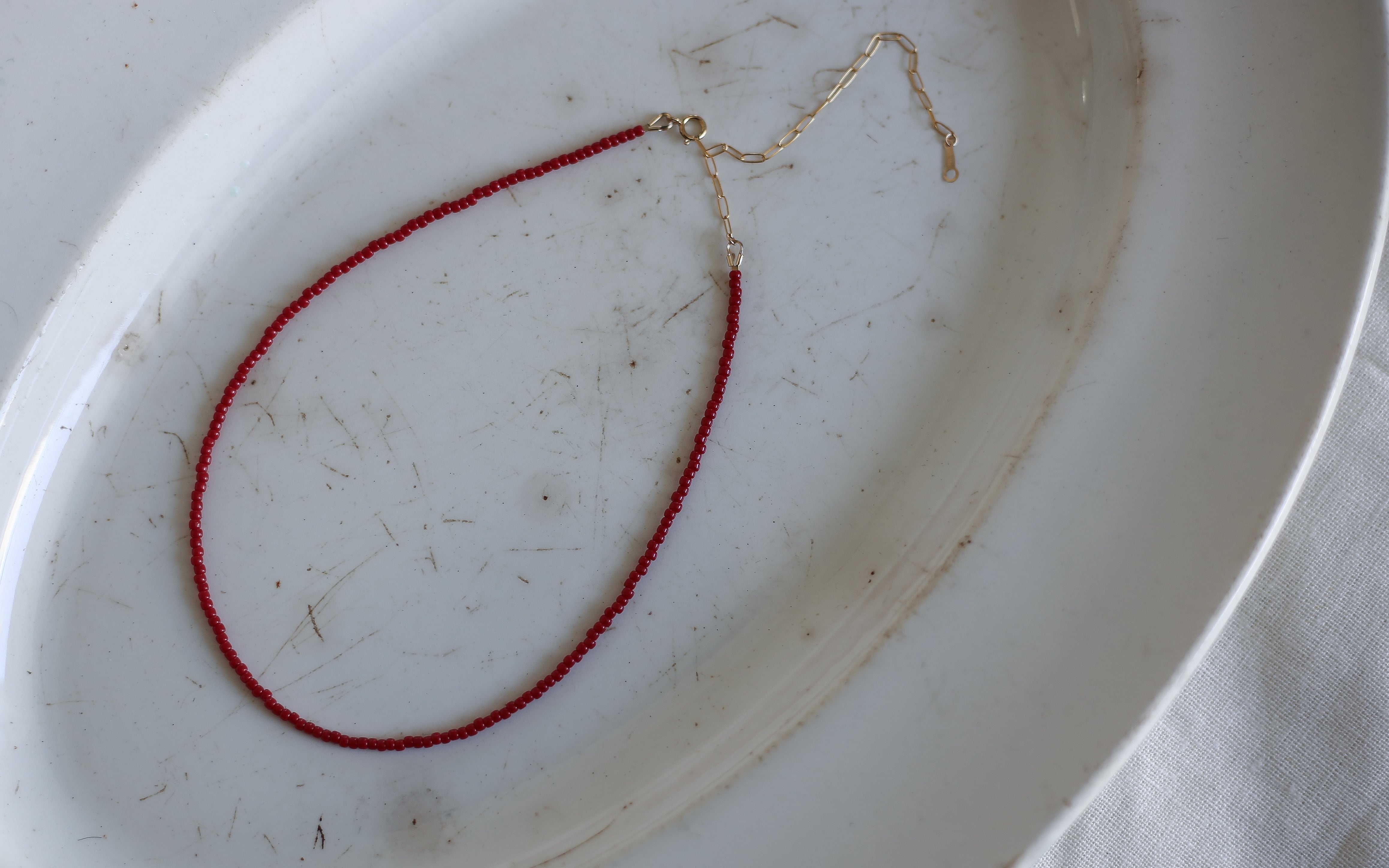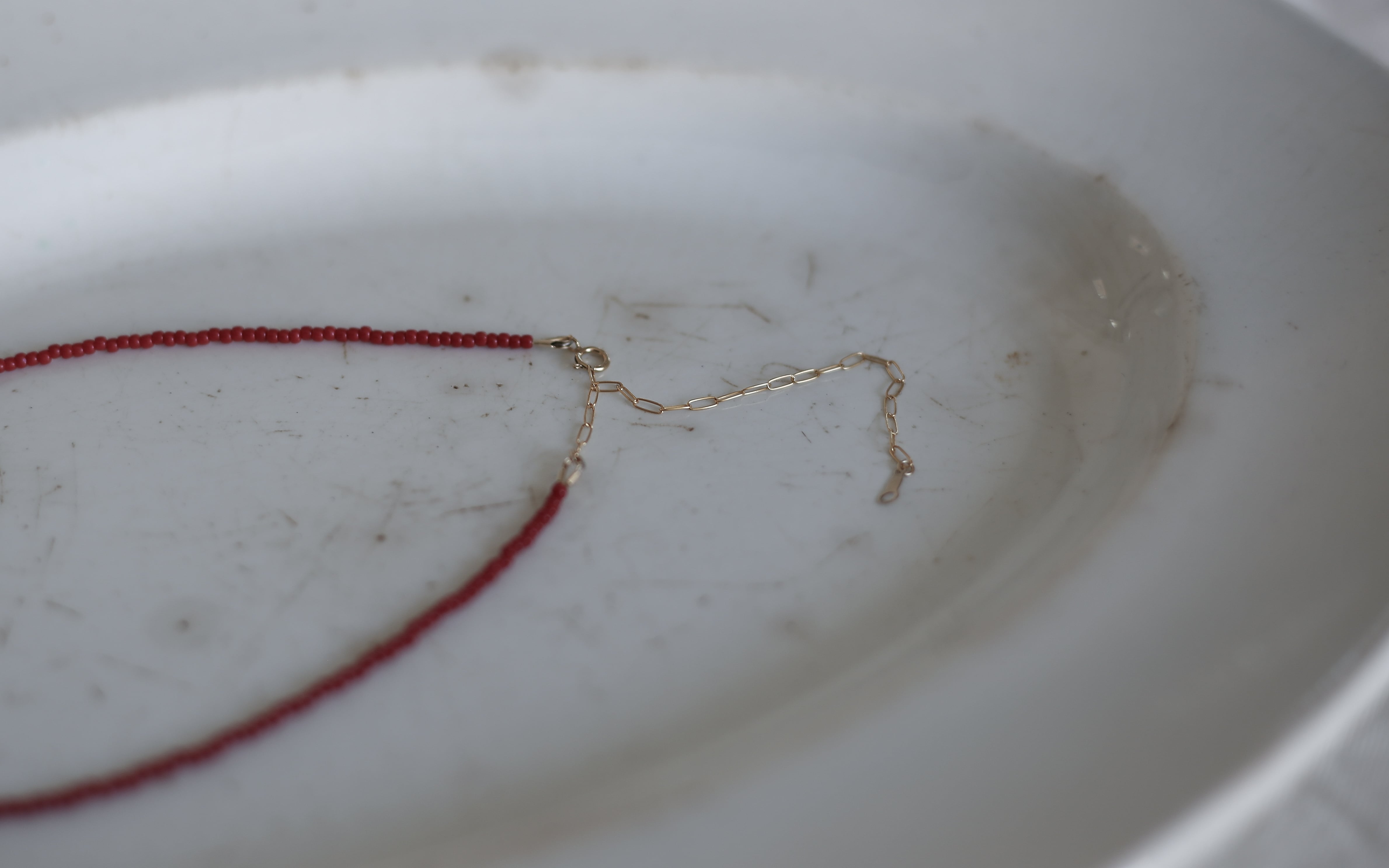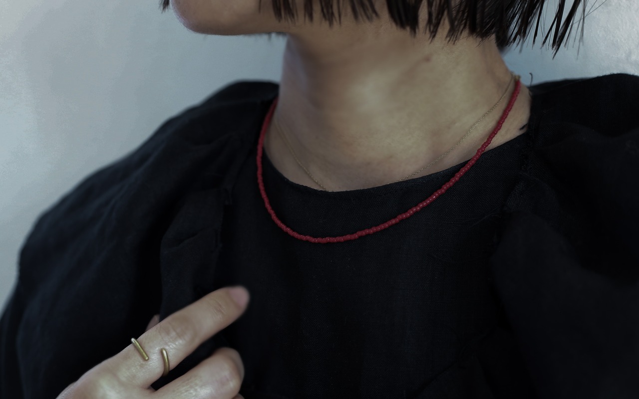赤色のビーズで仕立てた、首元に静かに沿うkubimoto necklace。