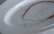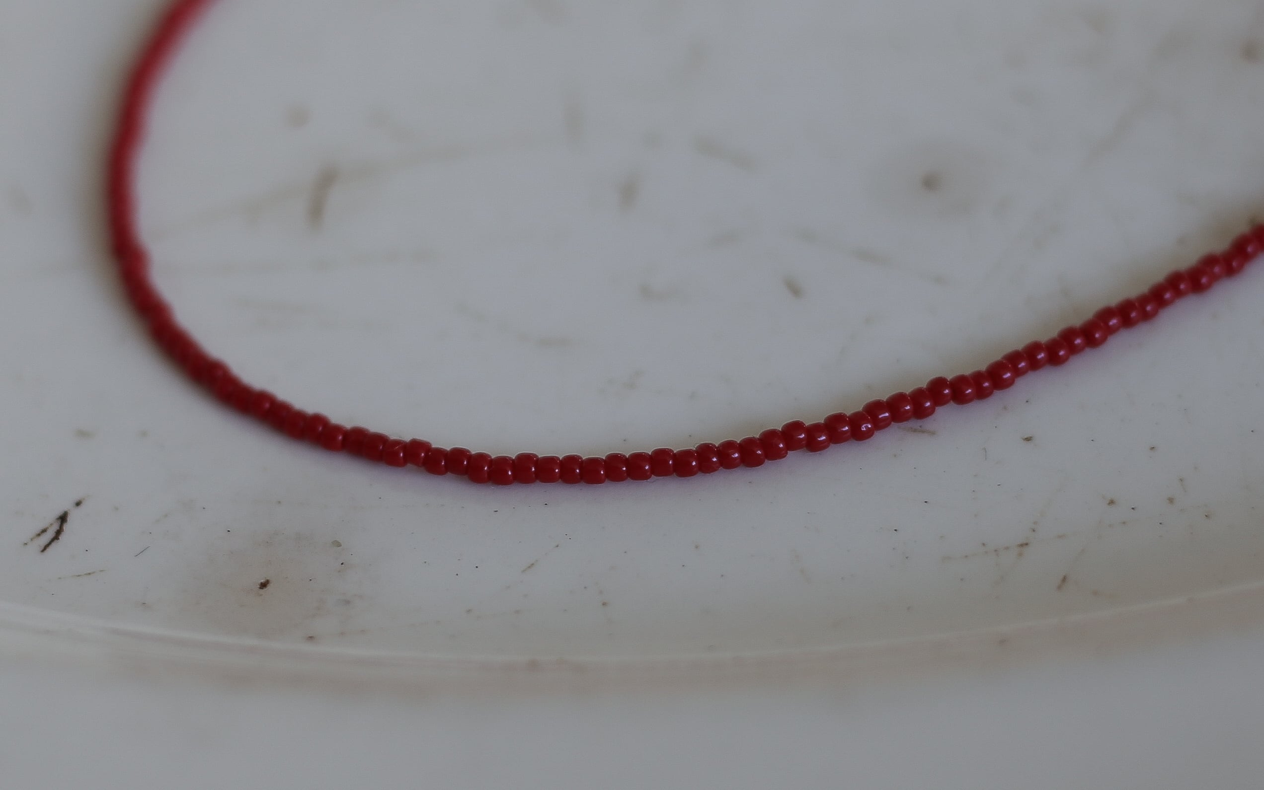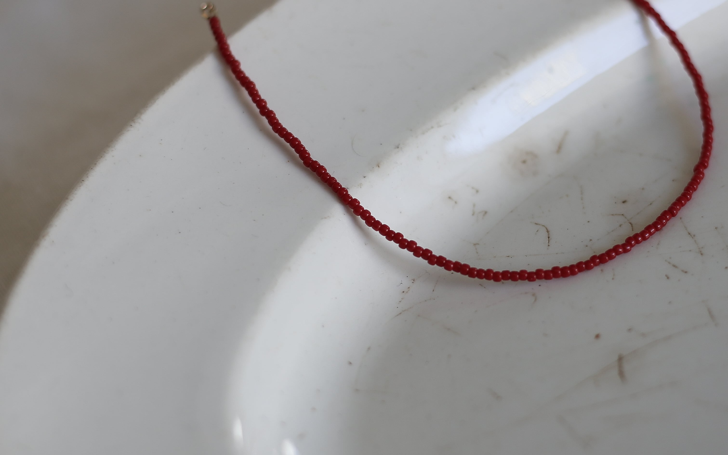 控えめな艶に、深い色合いの赤いビーズ。