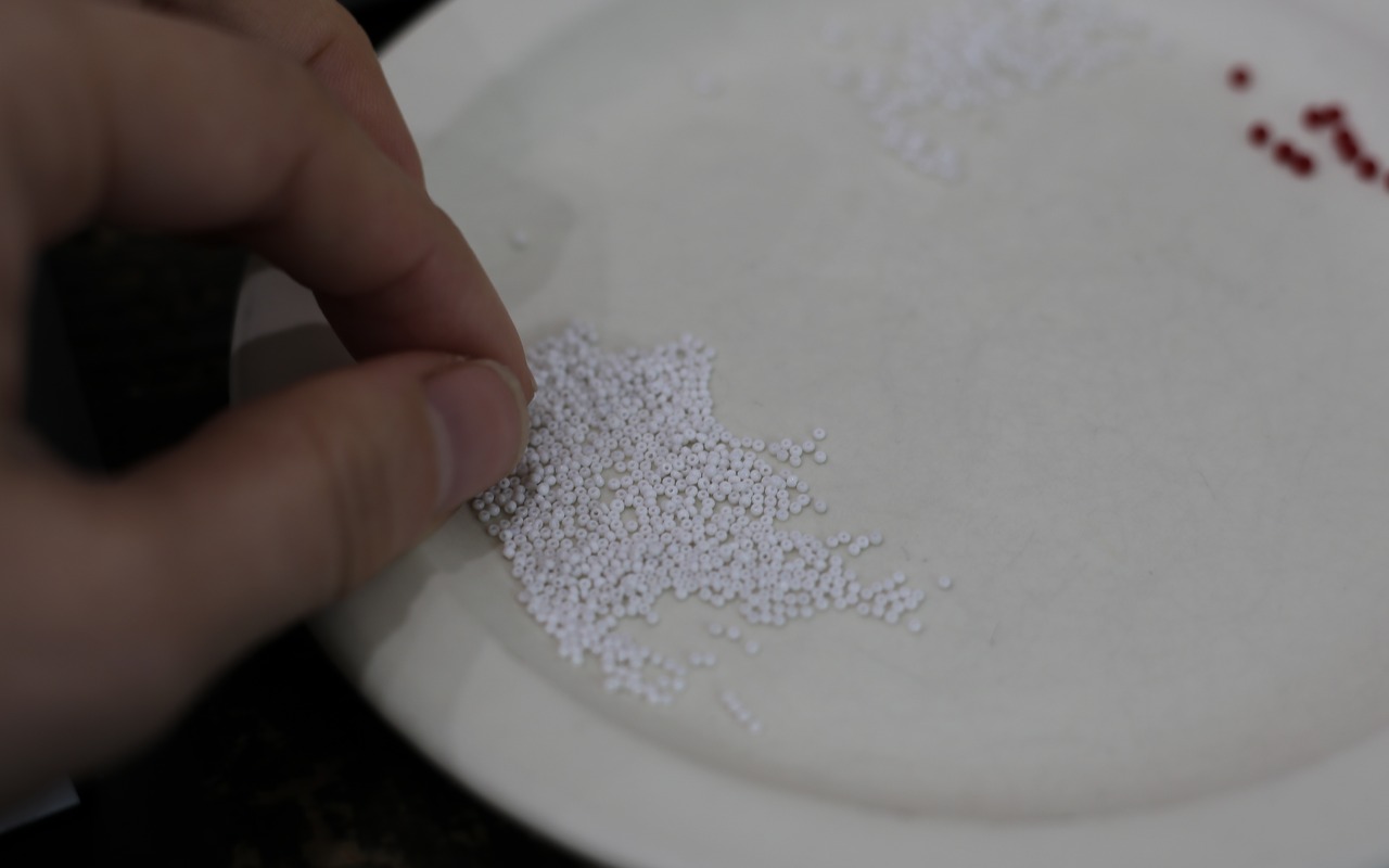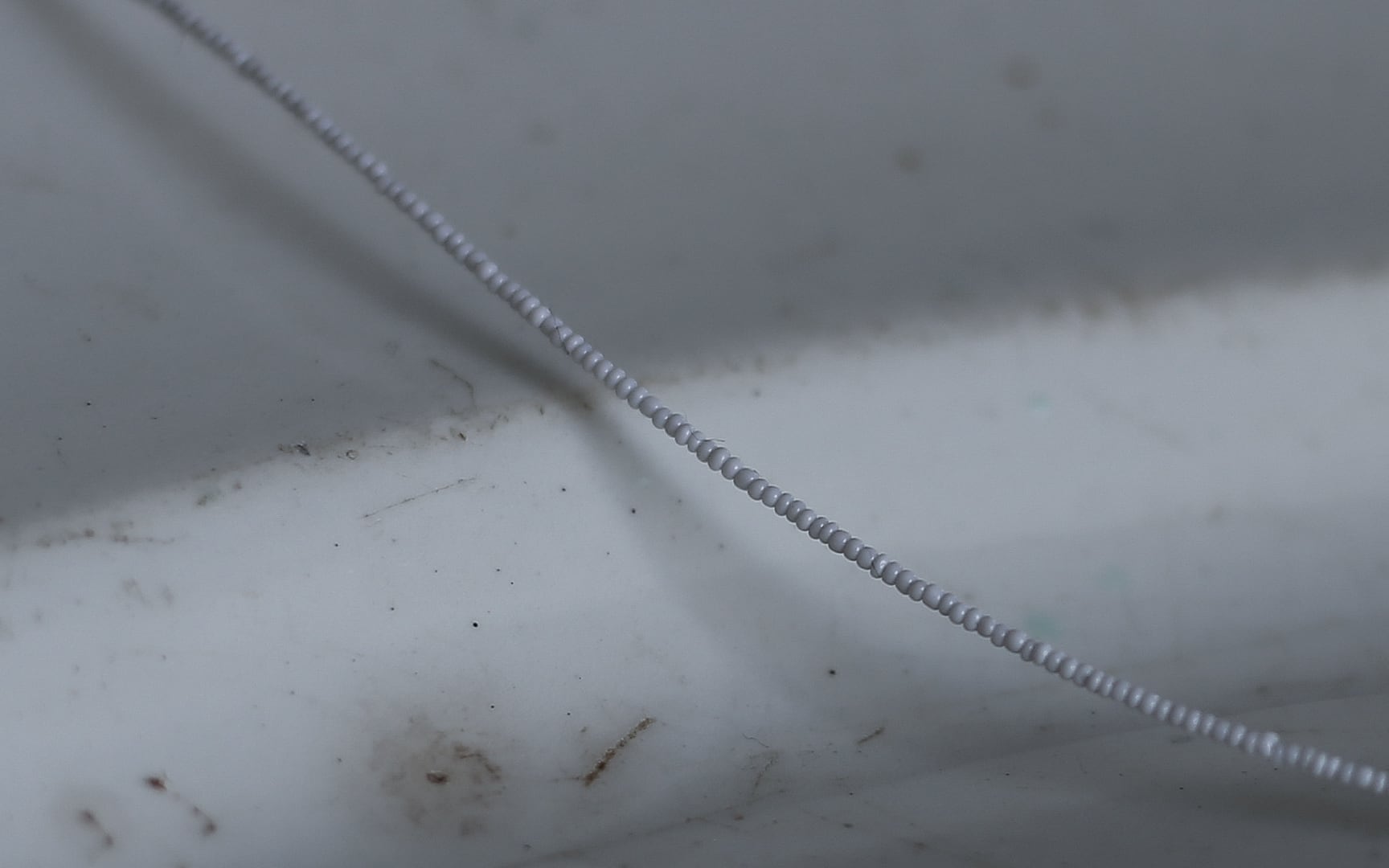 白のビーズは、ケシの実のように小さな、チェコ製の1ミリ超ミクロビーズ。ほんの少しくすんだような白で不揃いです。