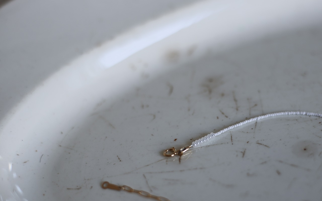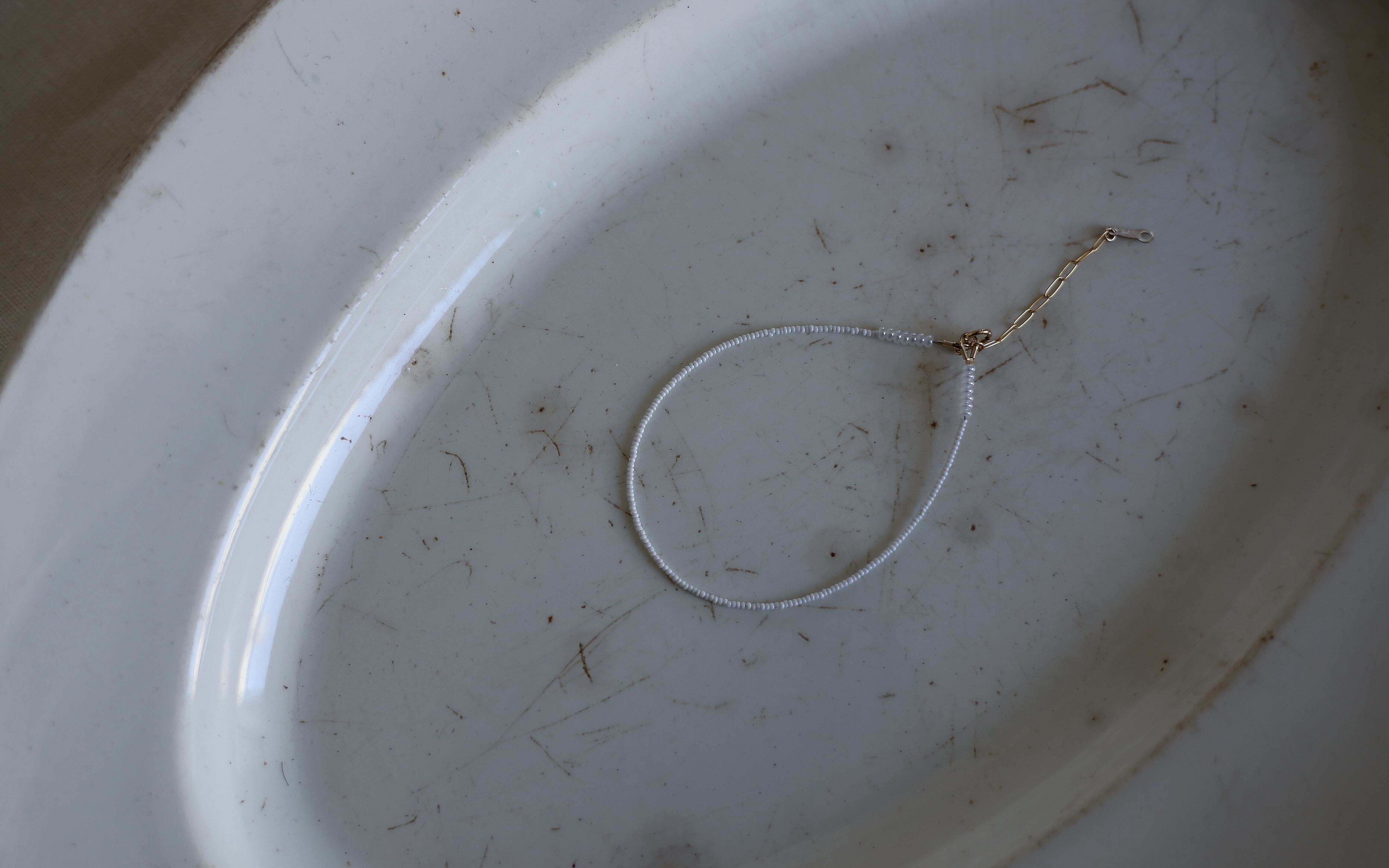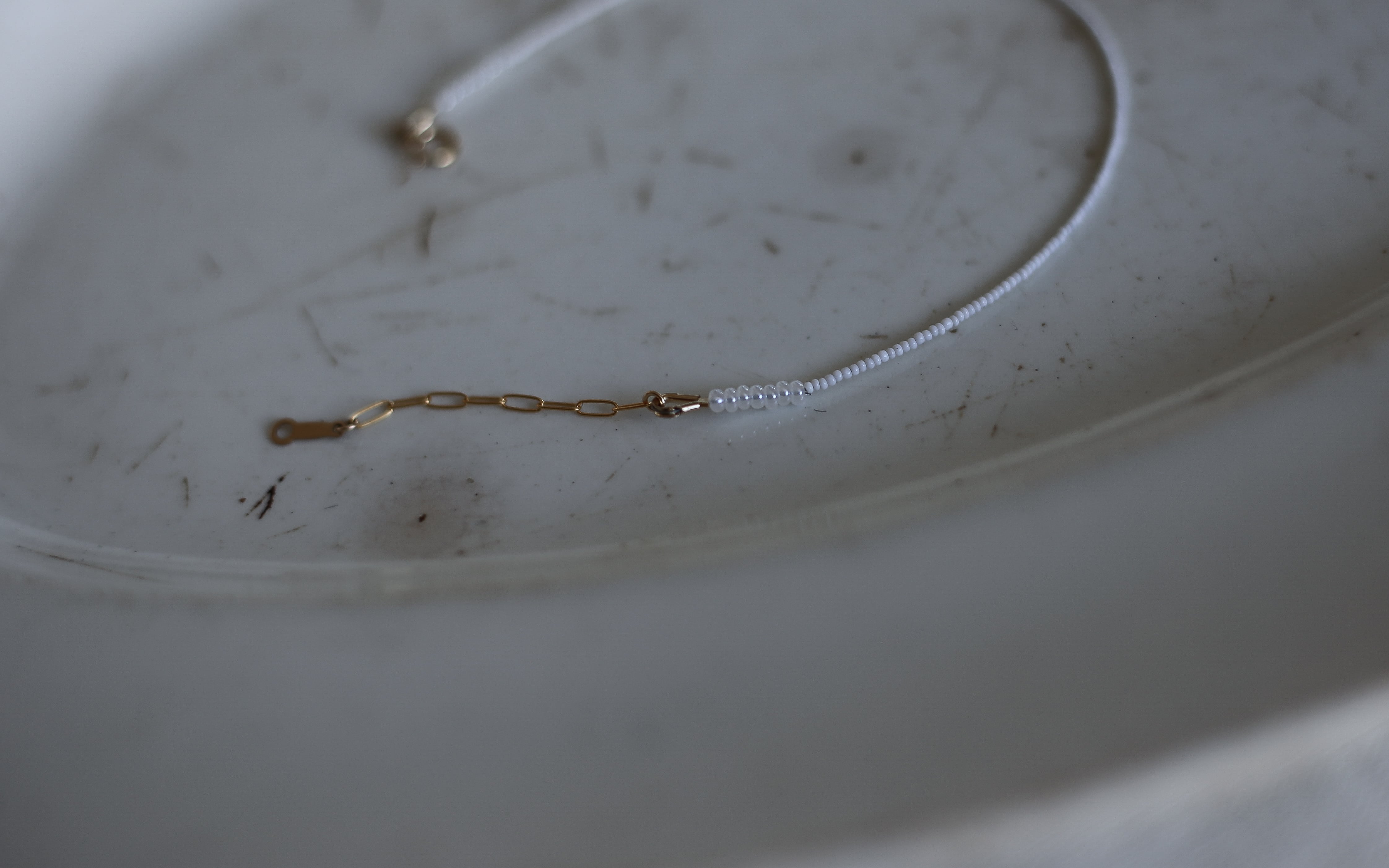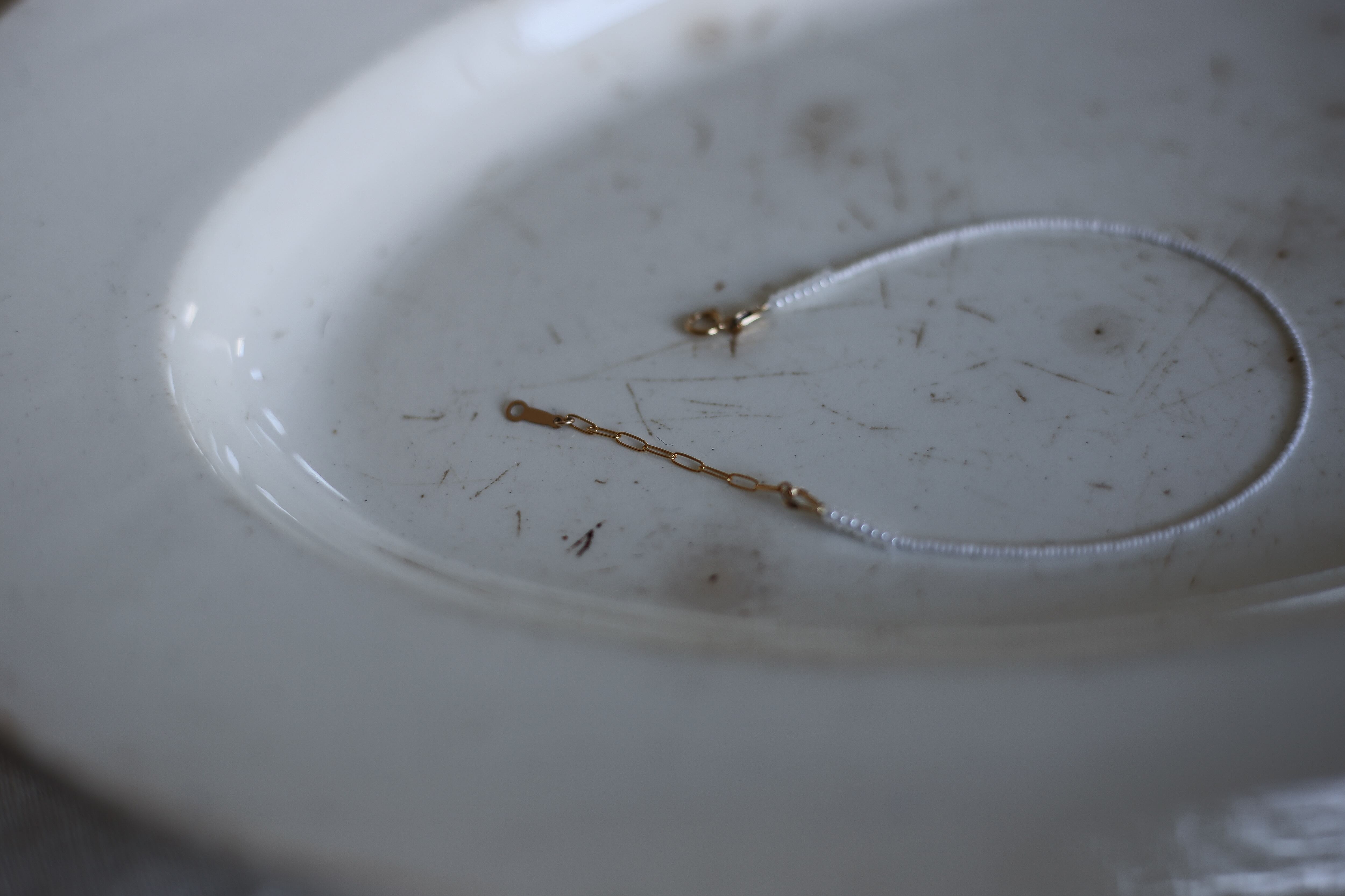 繊細なビーズの連なりと、14KGFが肌に馴染みます。