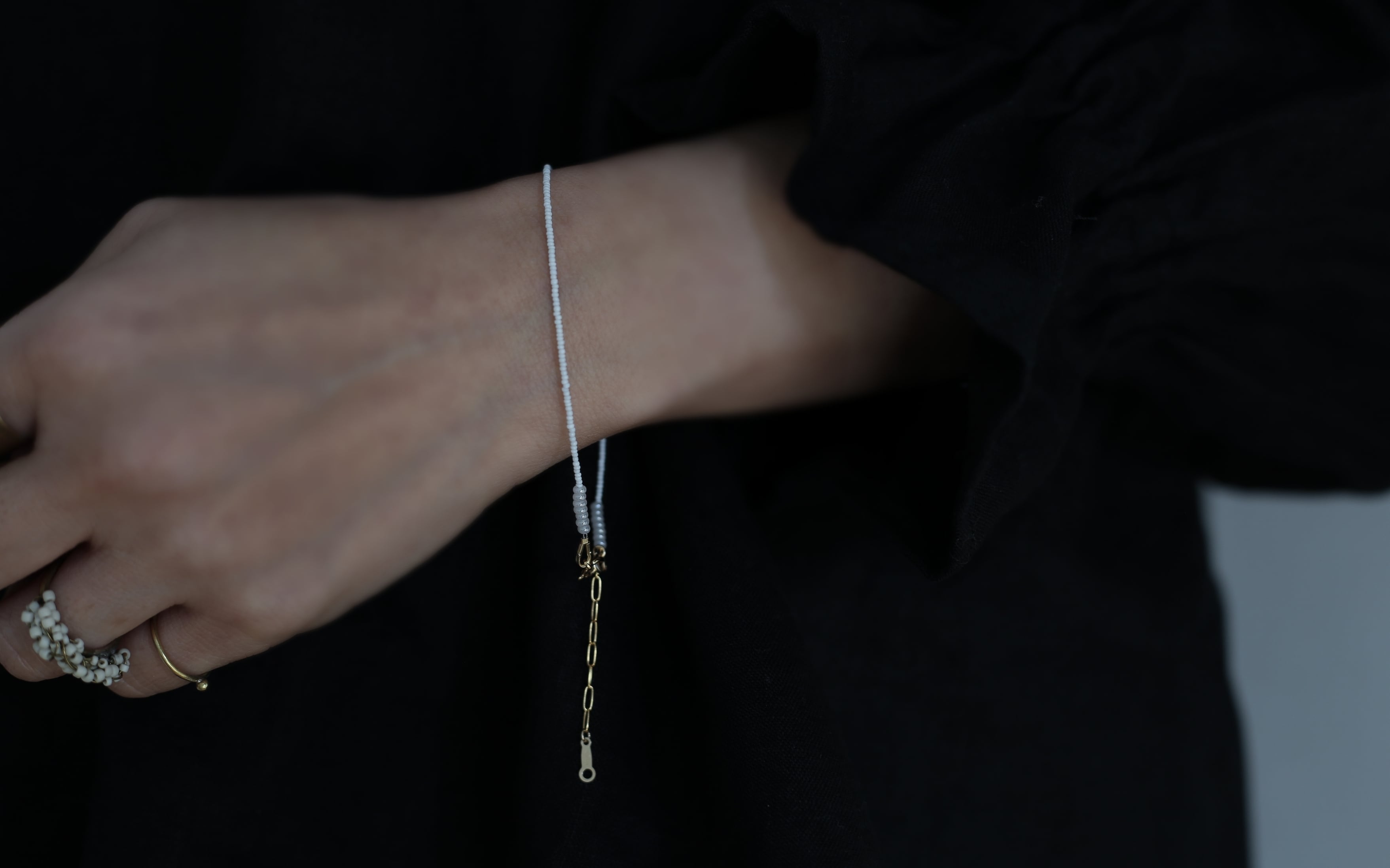 艶消しの白いビーズと両端にジャパンヴィンテージビーズで仕立てた、手元に静かに沿うtemoto bracelet。