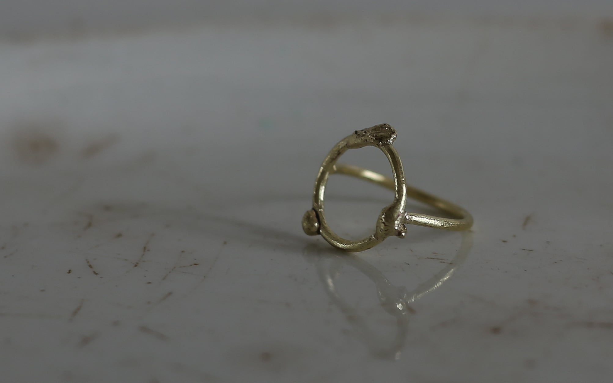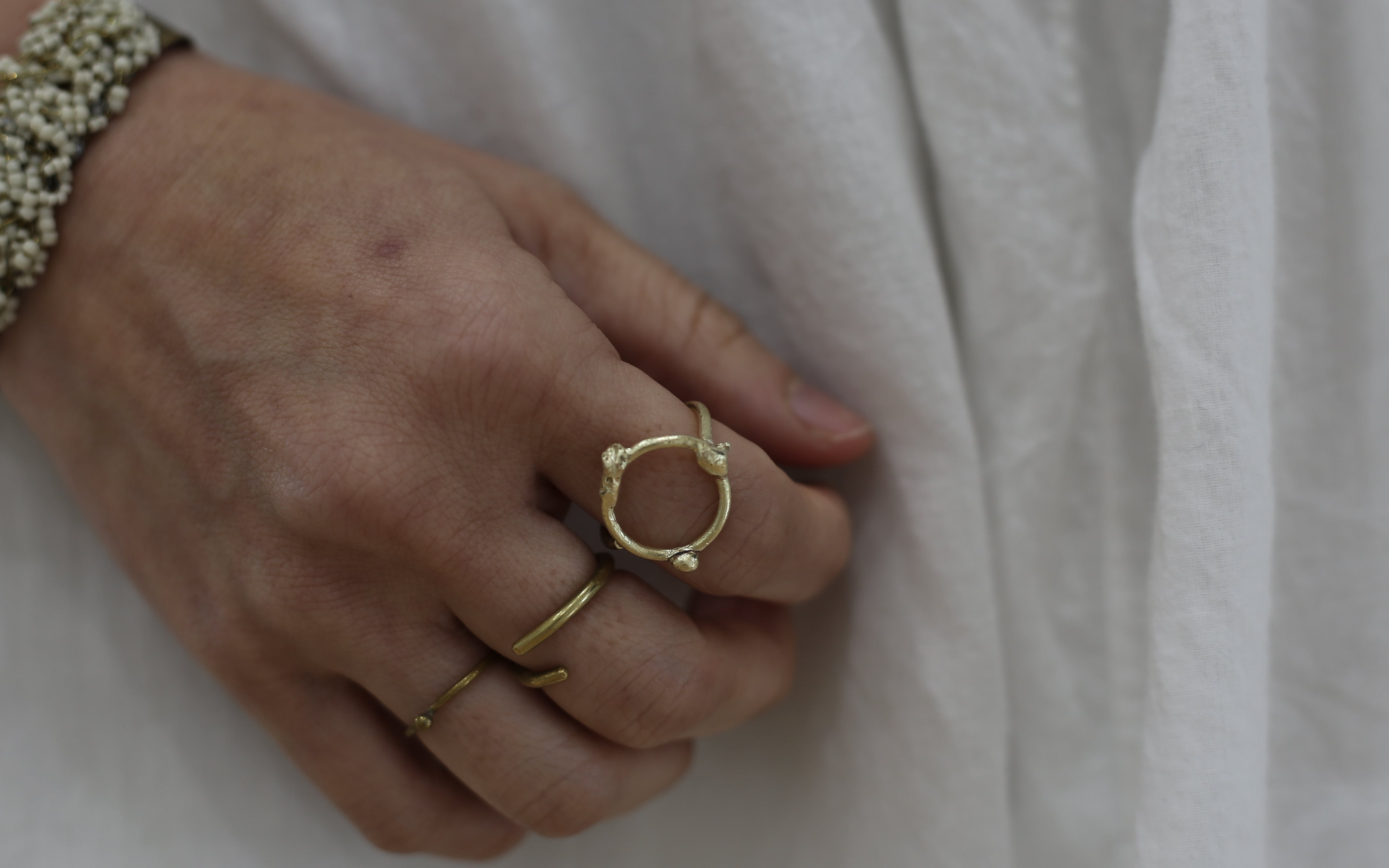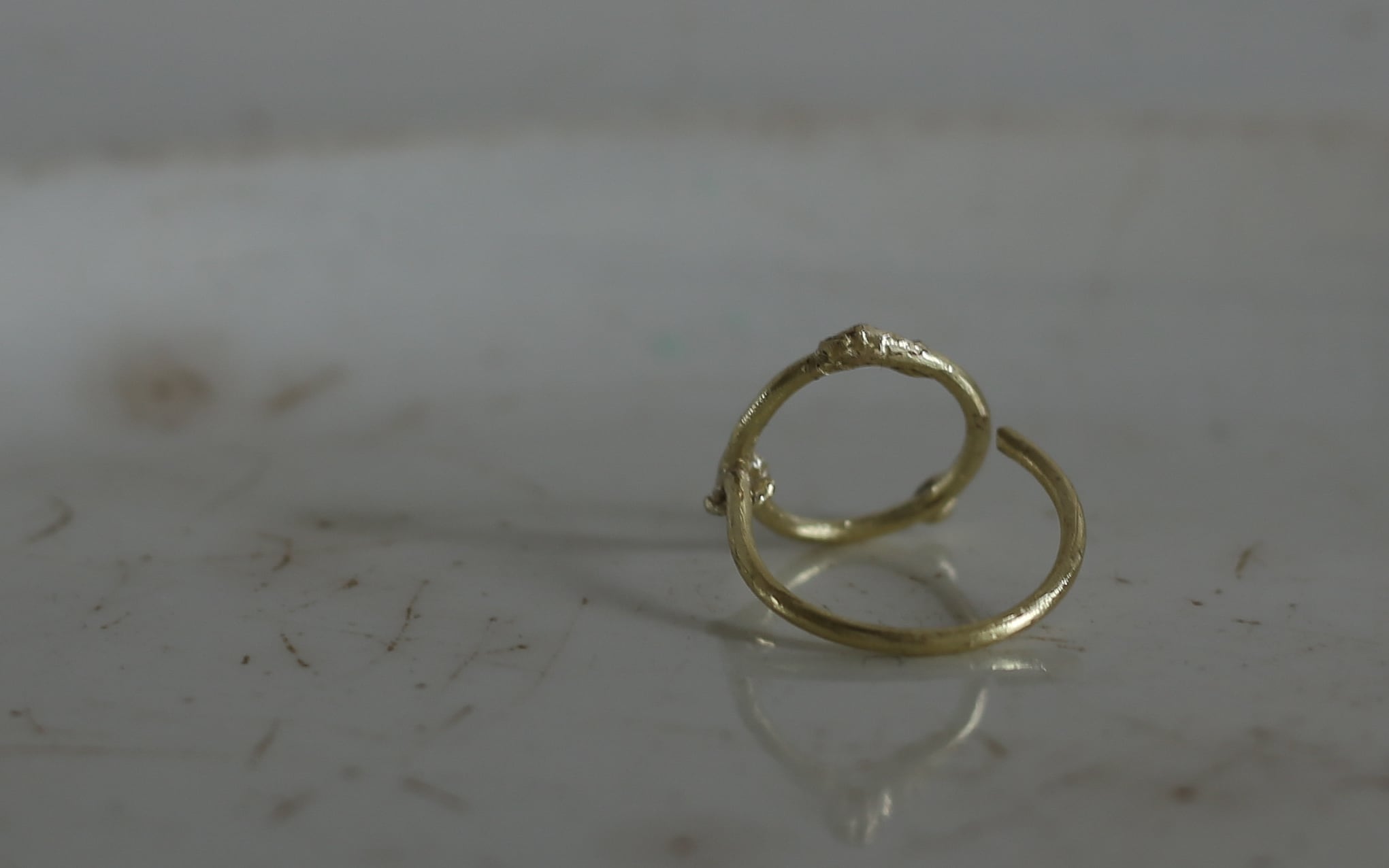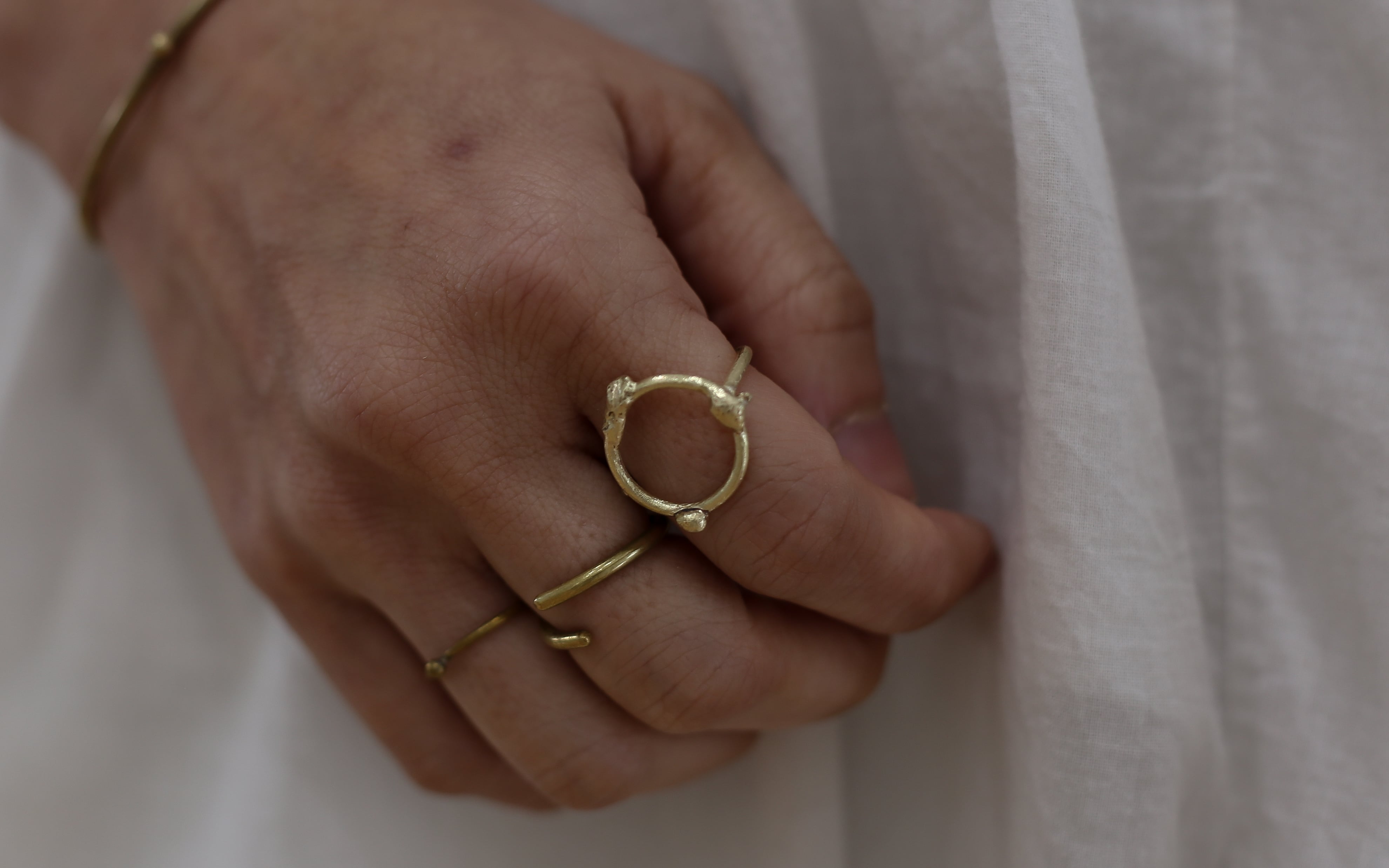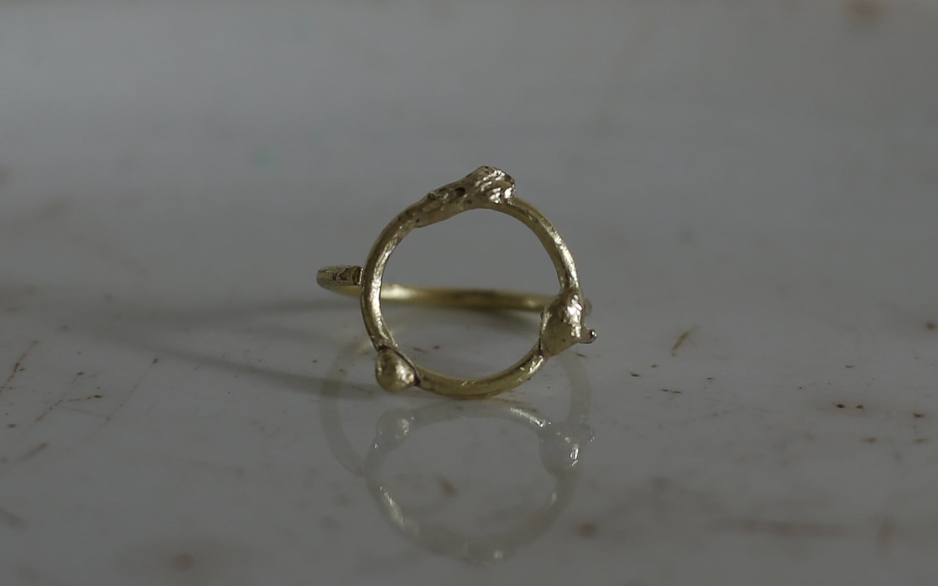 トップのモチーフは熱で真鍮を溶かし途中の一瞬を留めて偶然できた形です。