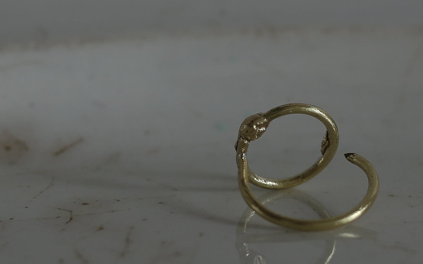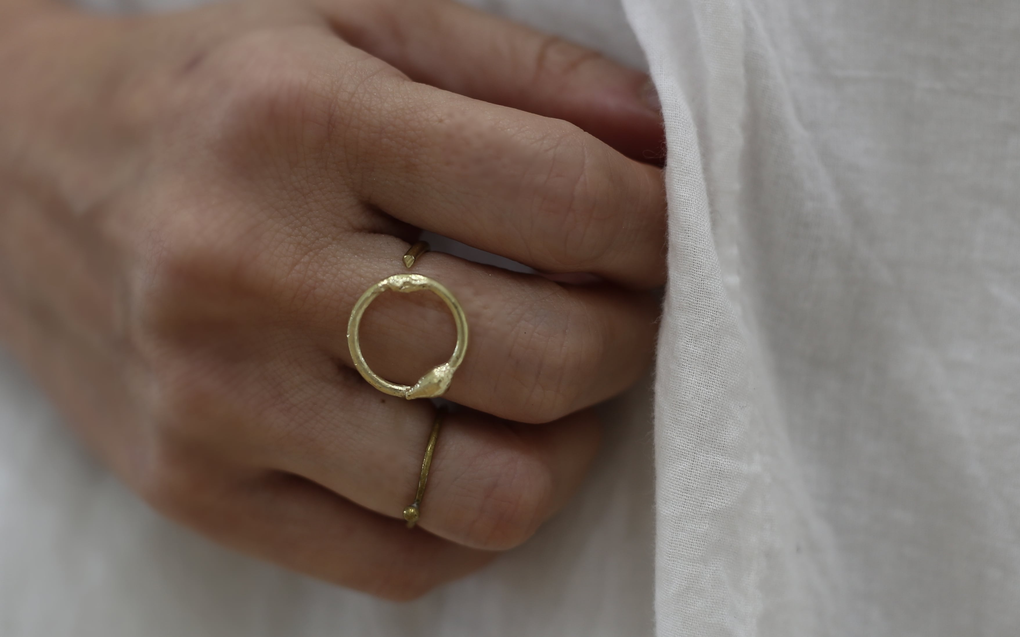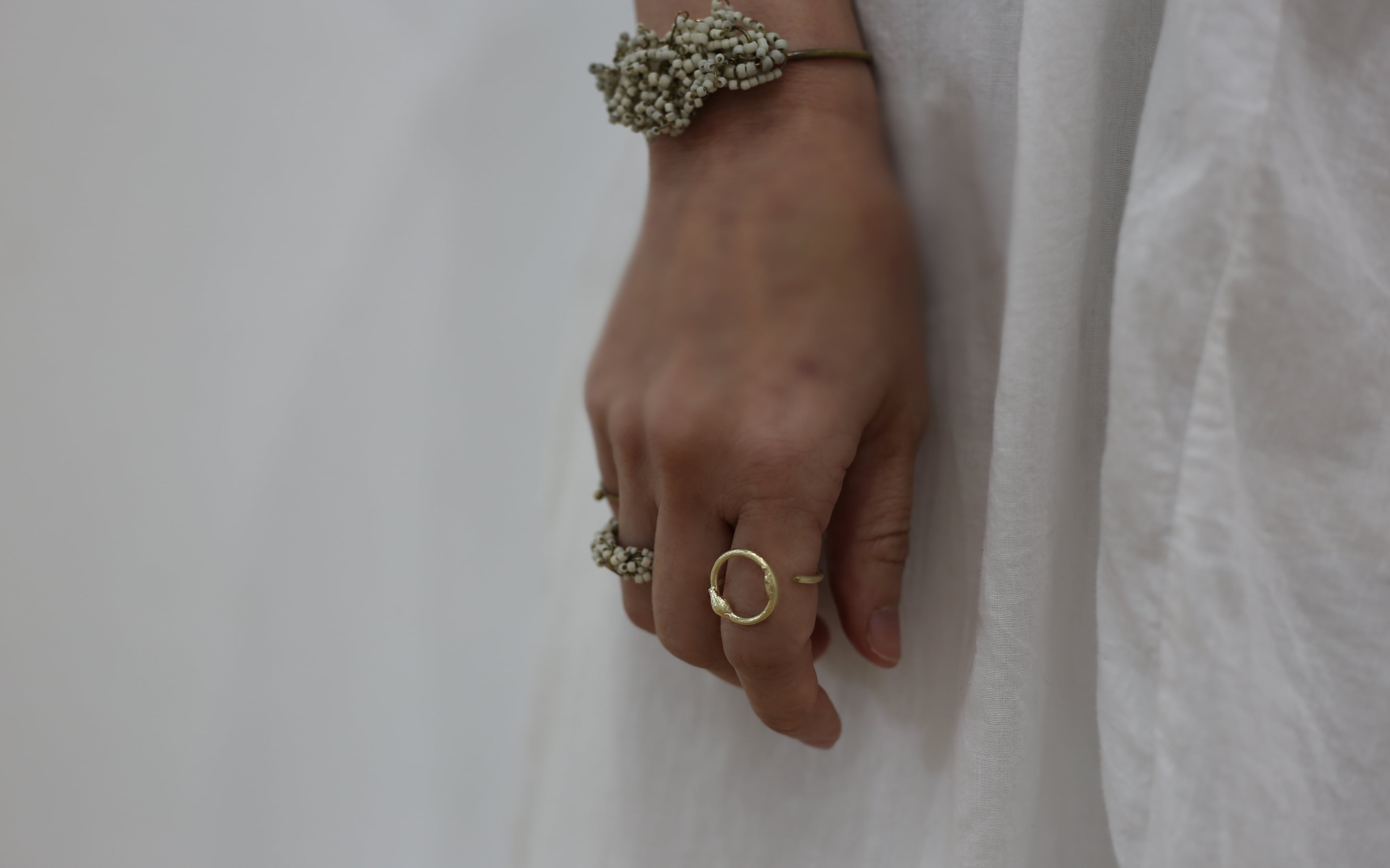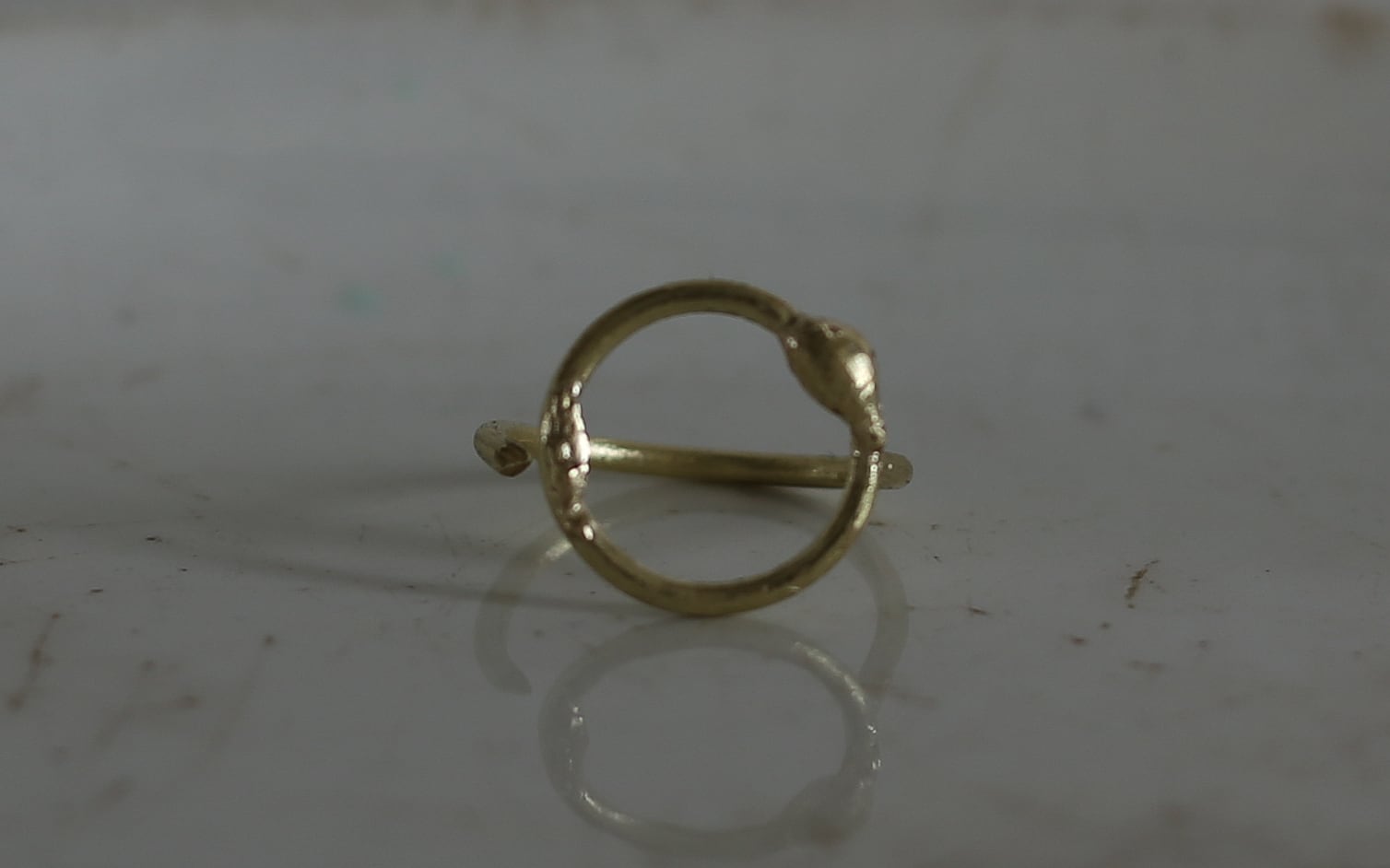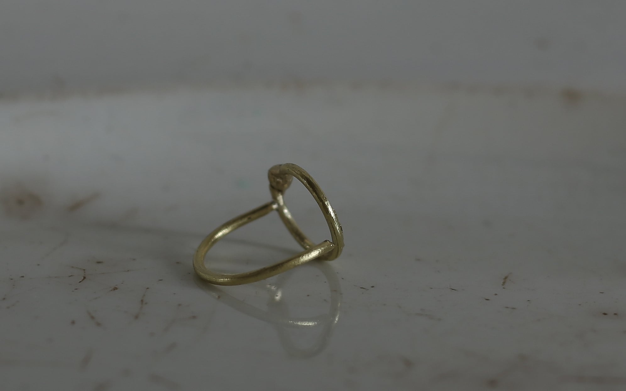 トップのモチーフは熱で真鍮を溶かし途中の一瞬を留めて偶然できた形です。