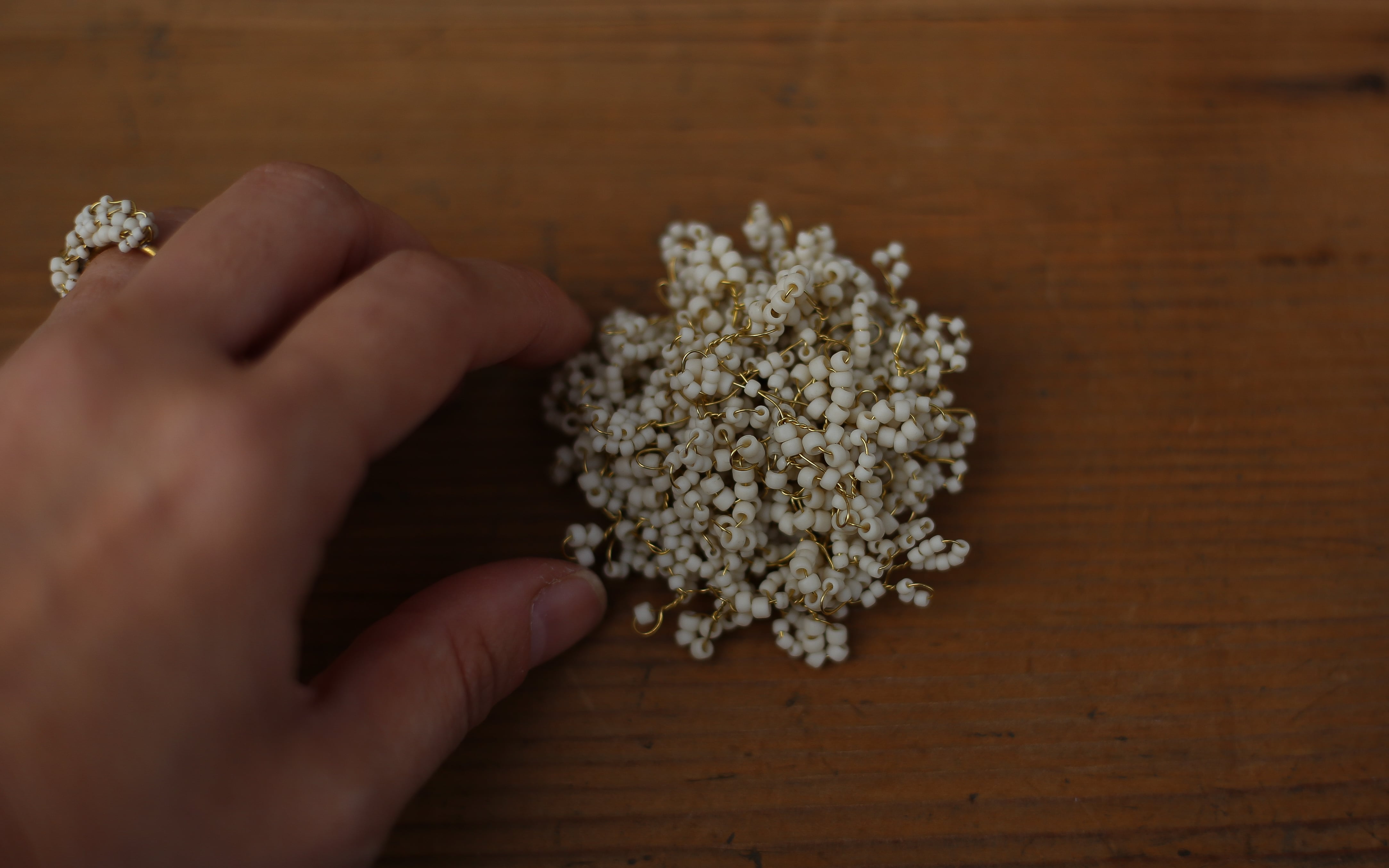 アイボリーの大小のビーズにゴールドの真鍮ワイヤーで仕立ております。