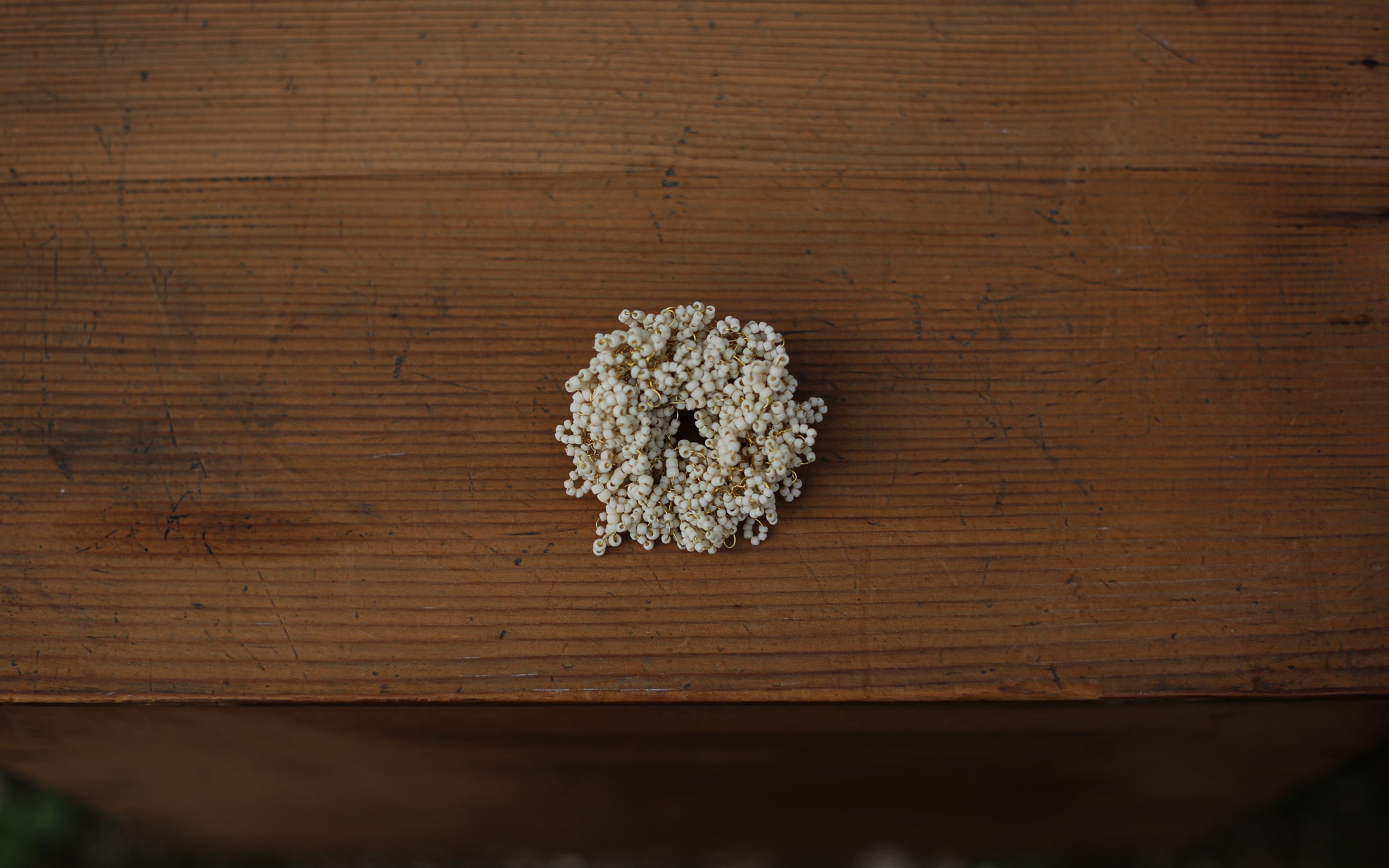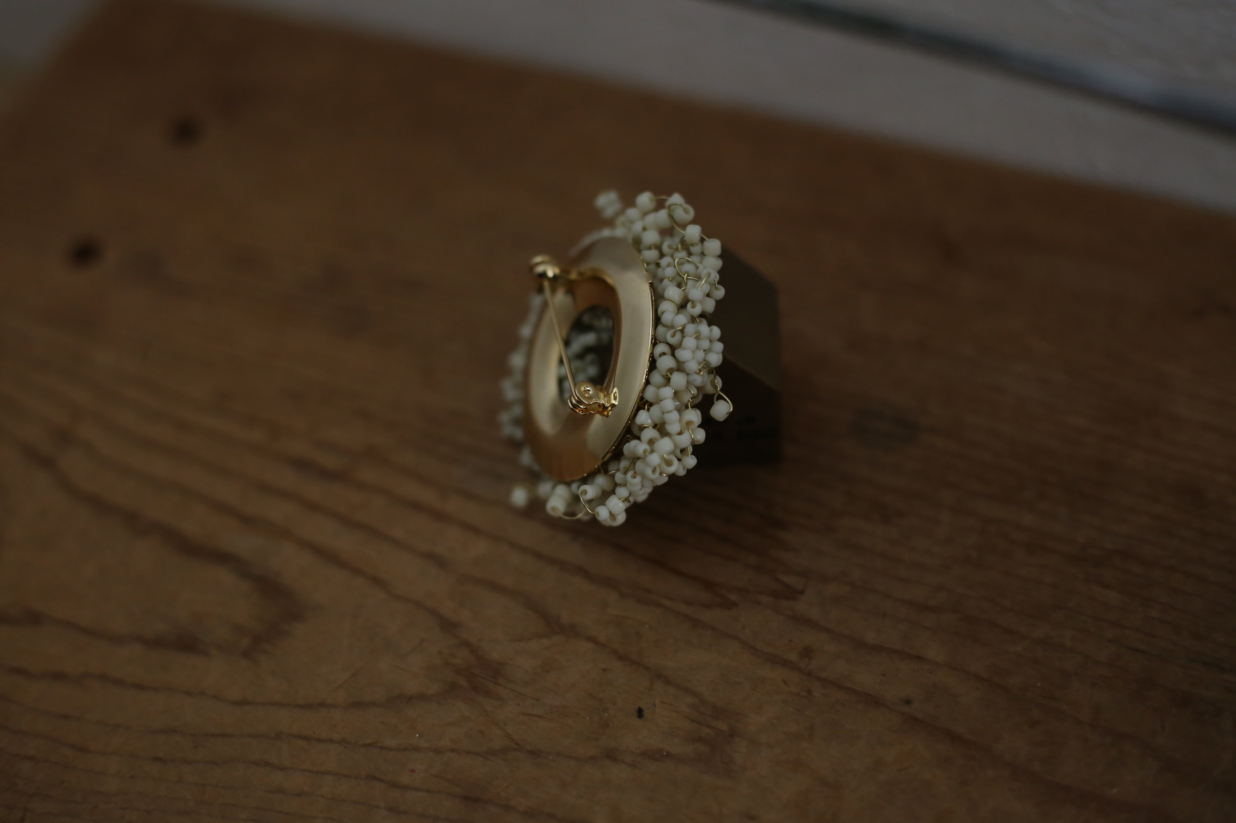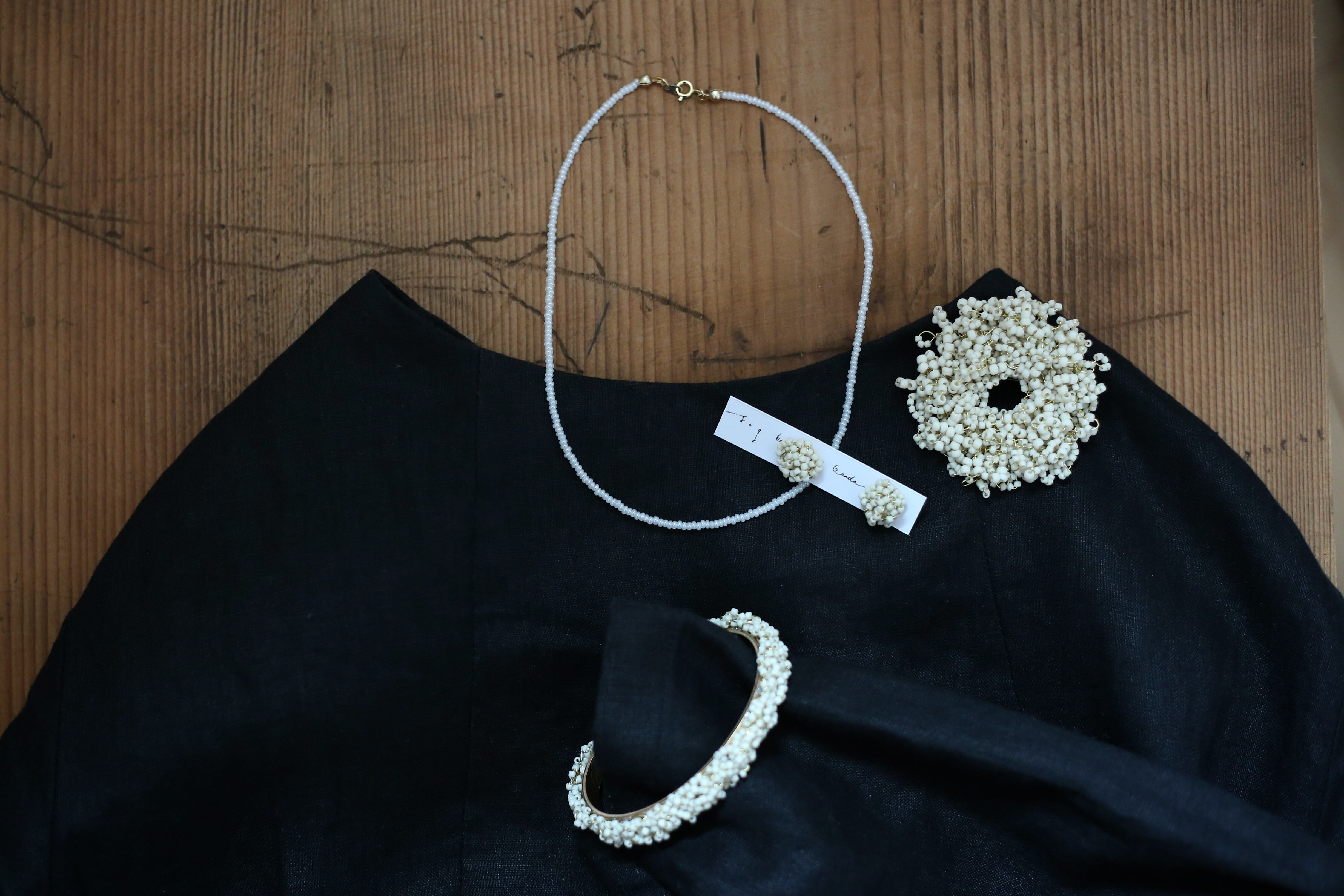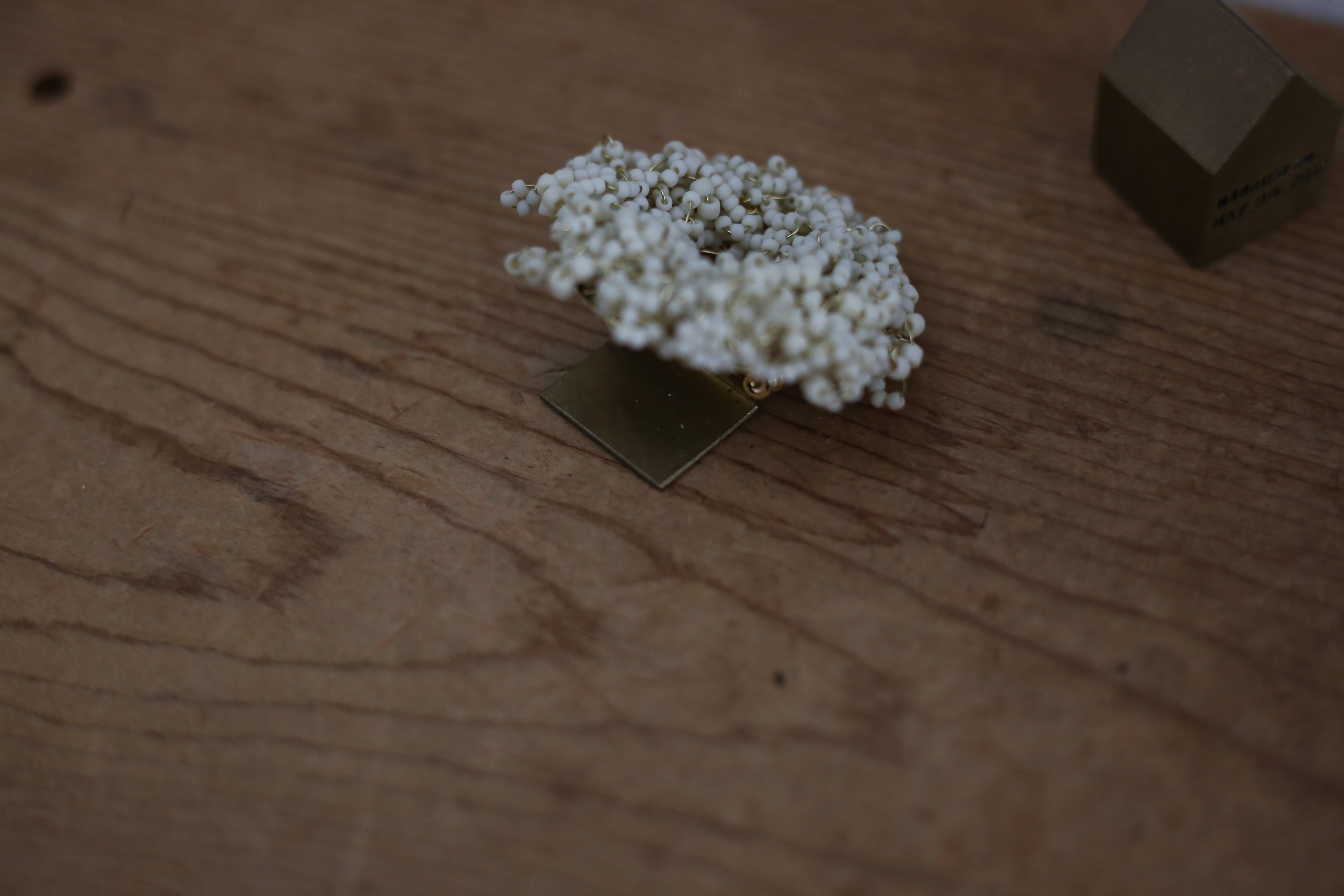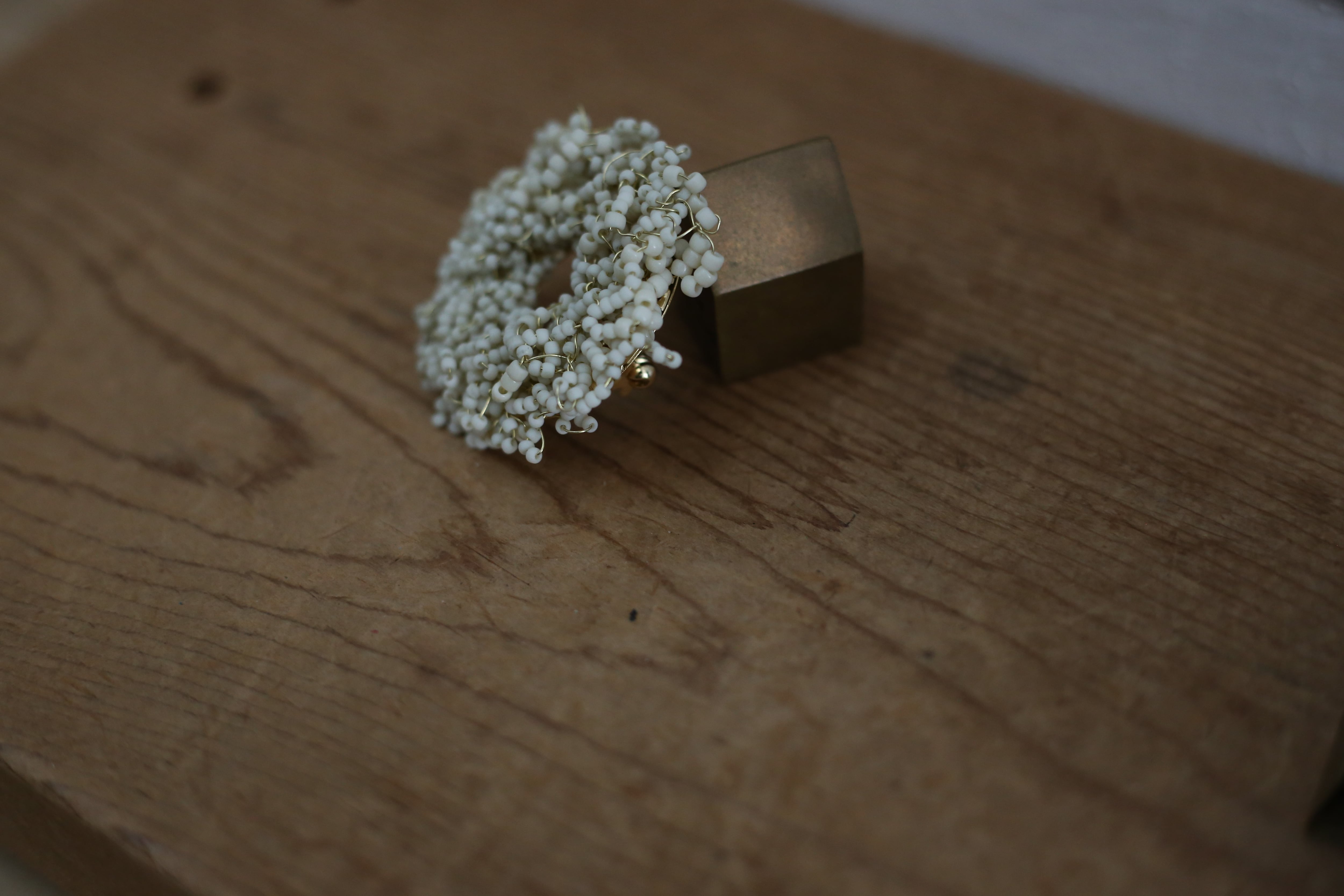 アイボリーの大小のビーズにゴールドの真鍮ワイヤーで仕立ております。