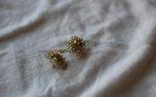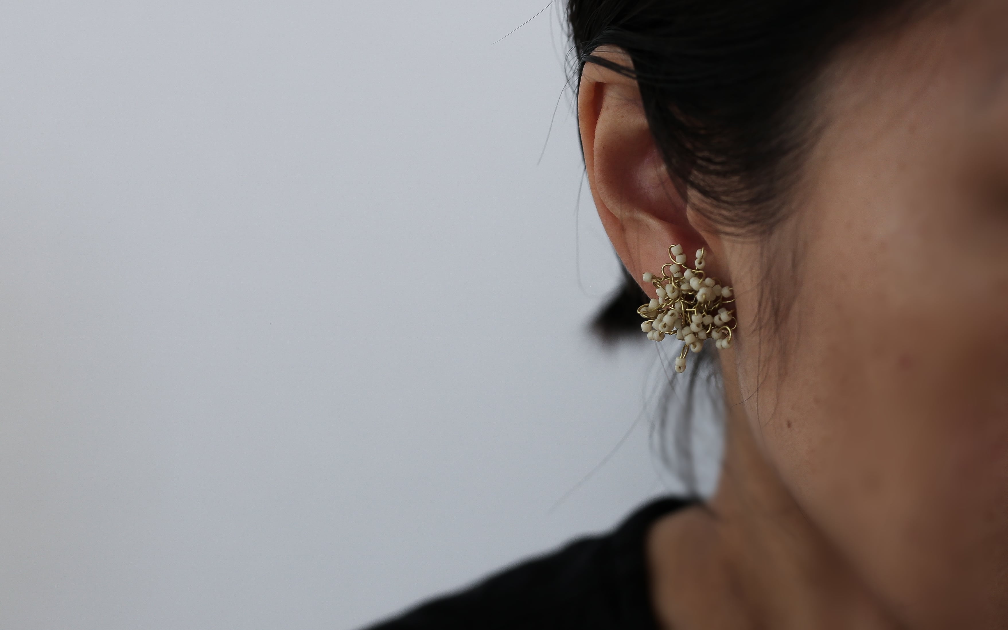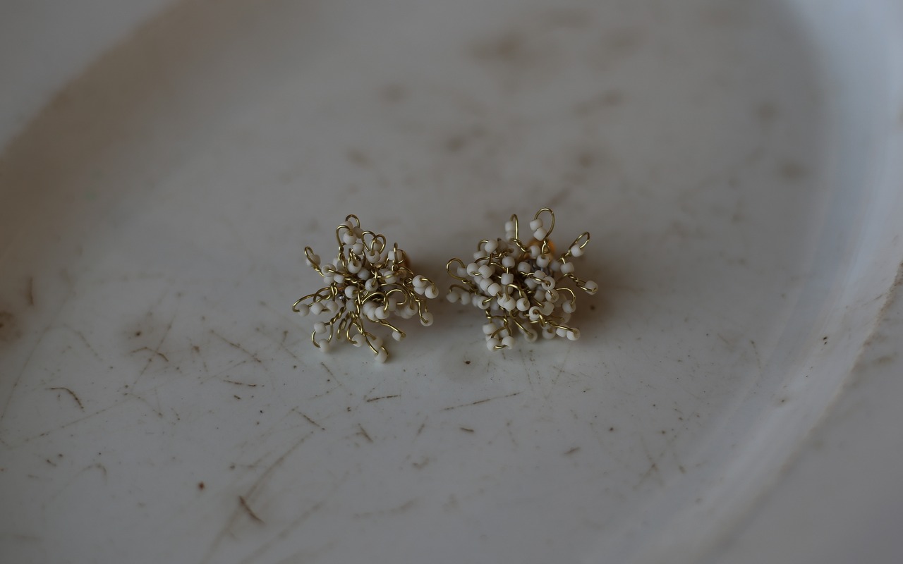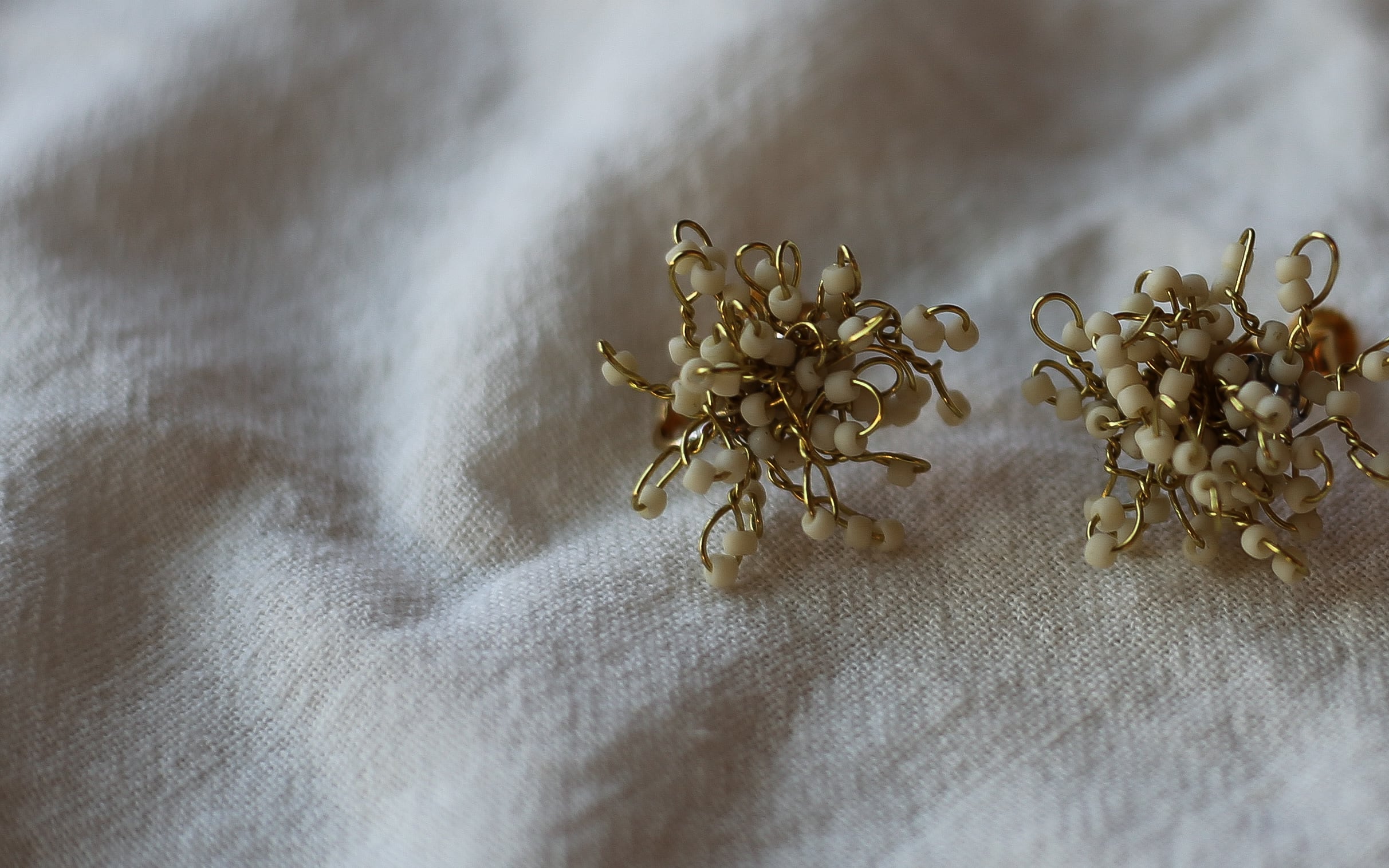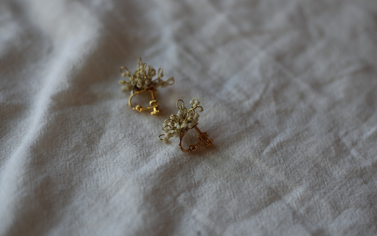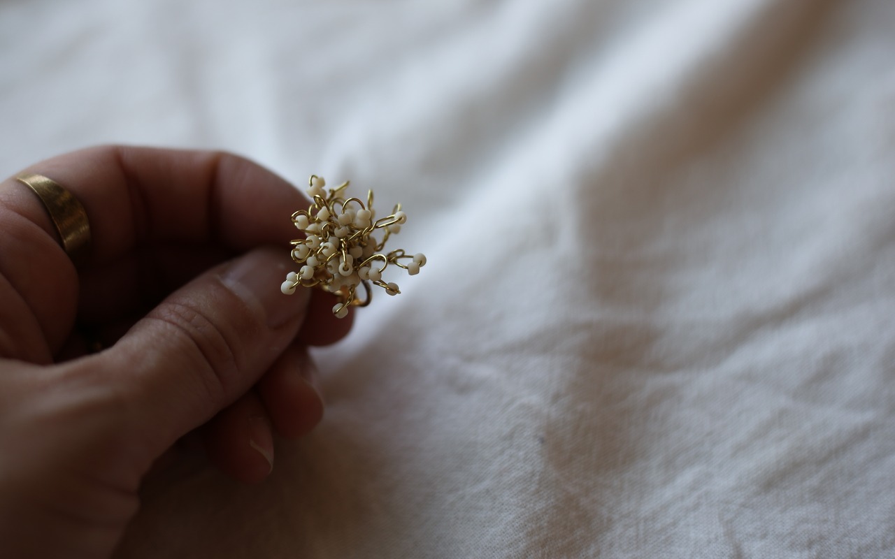 乳白色のビーズにゴールドのワイヤーでパーツを仕立ております。