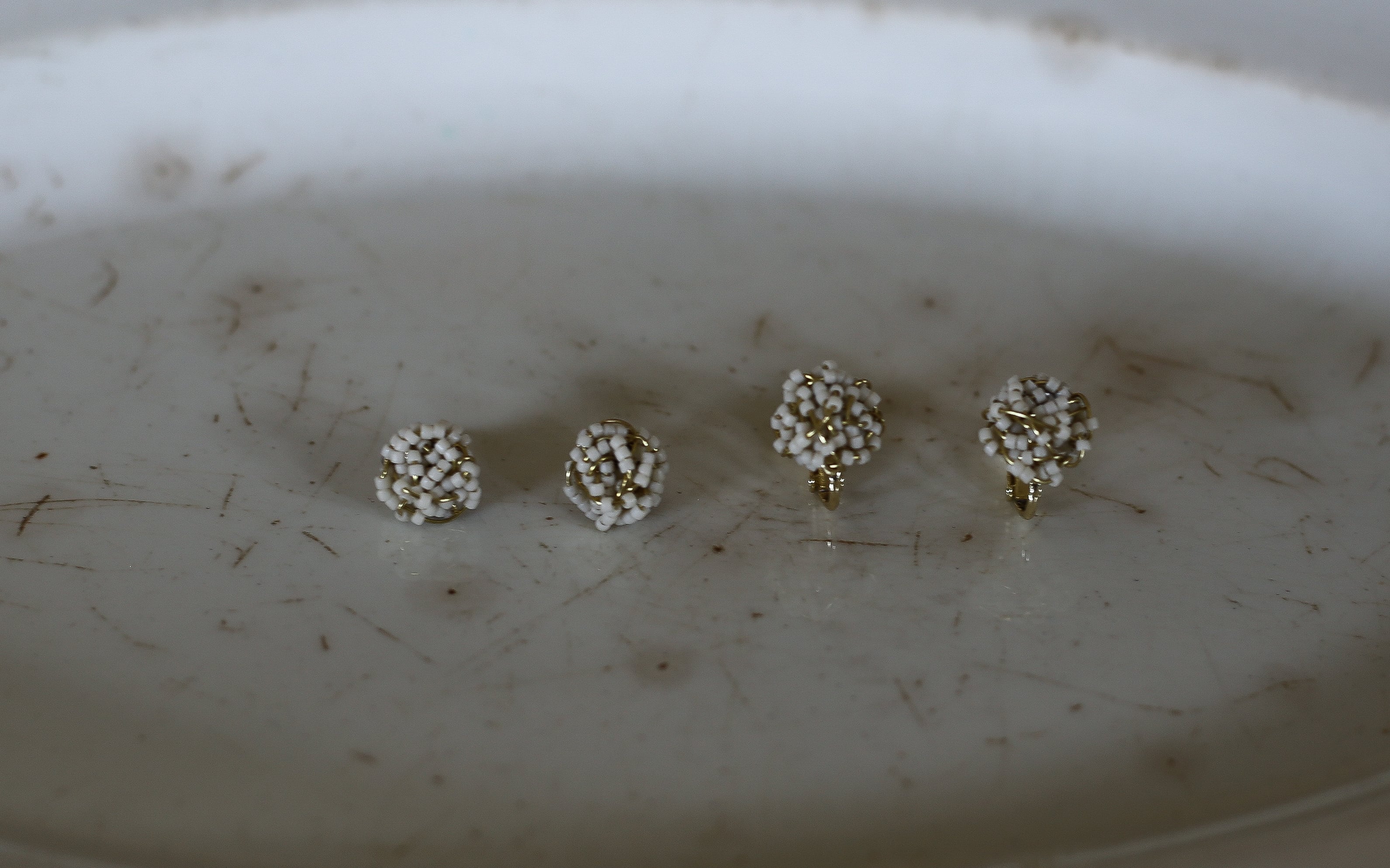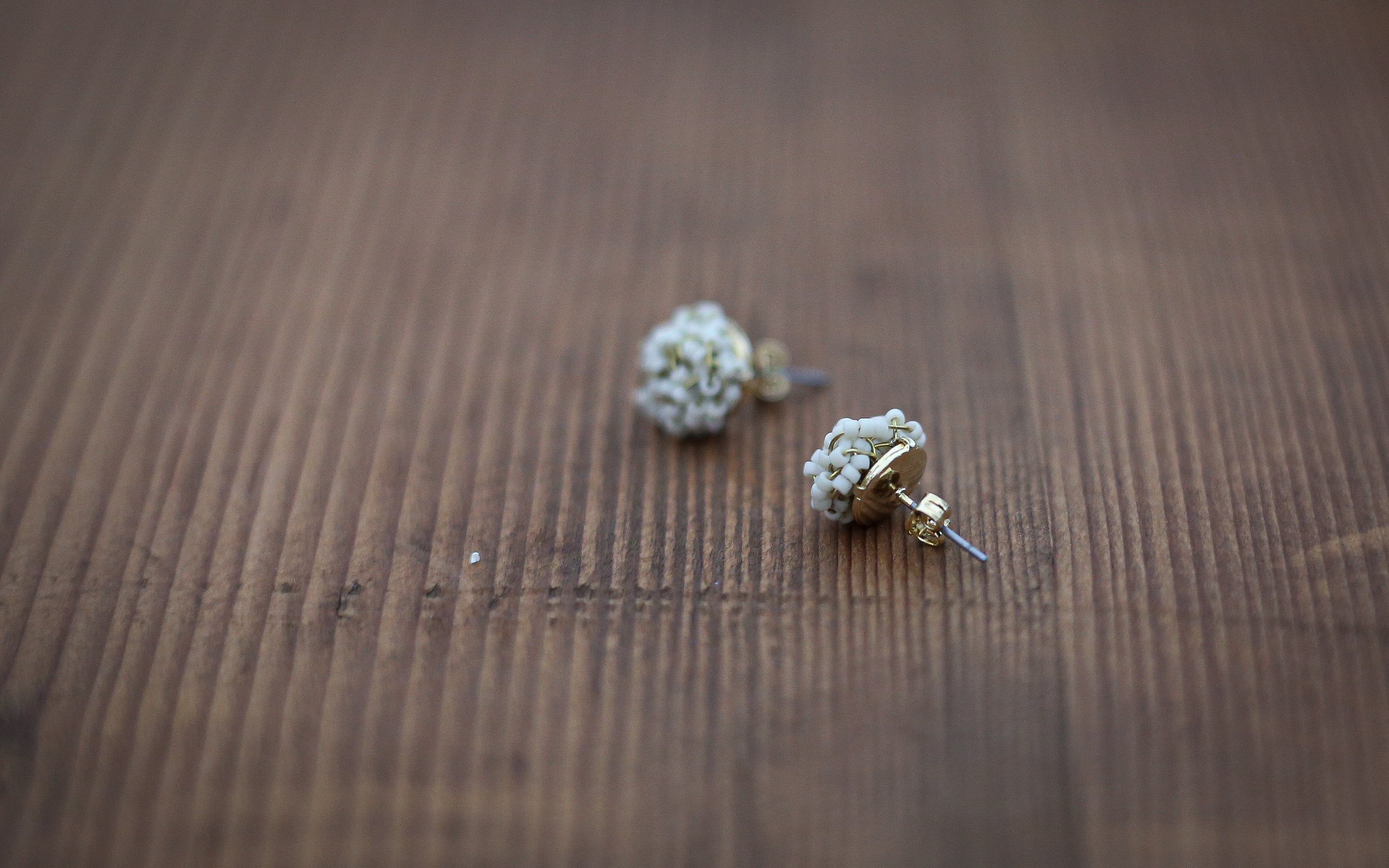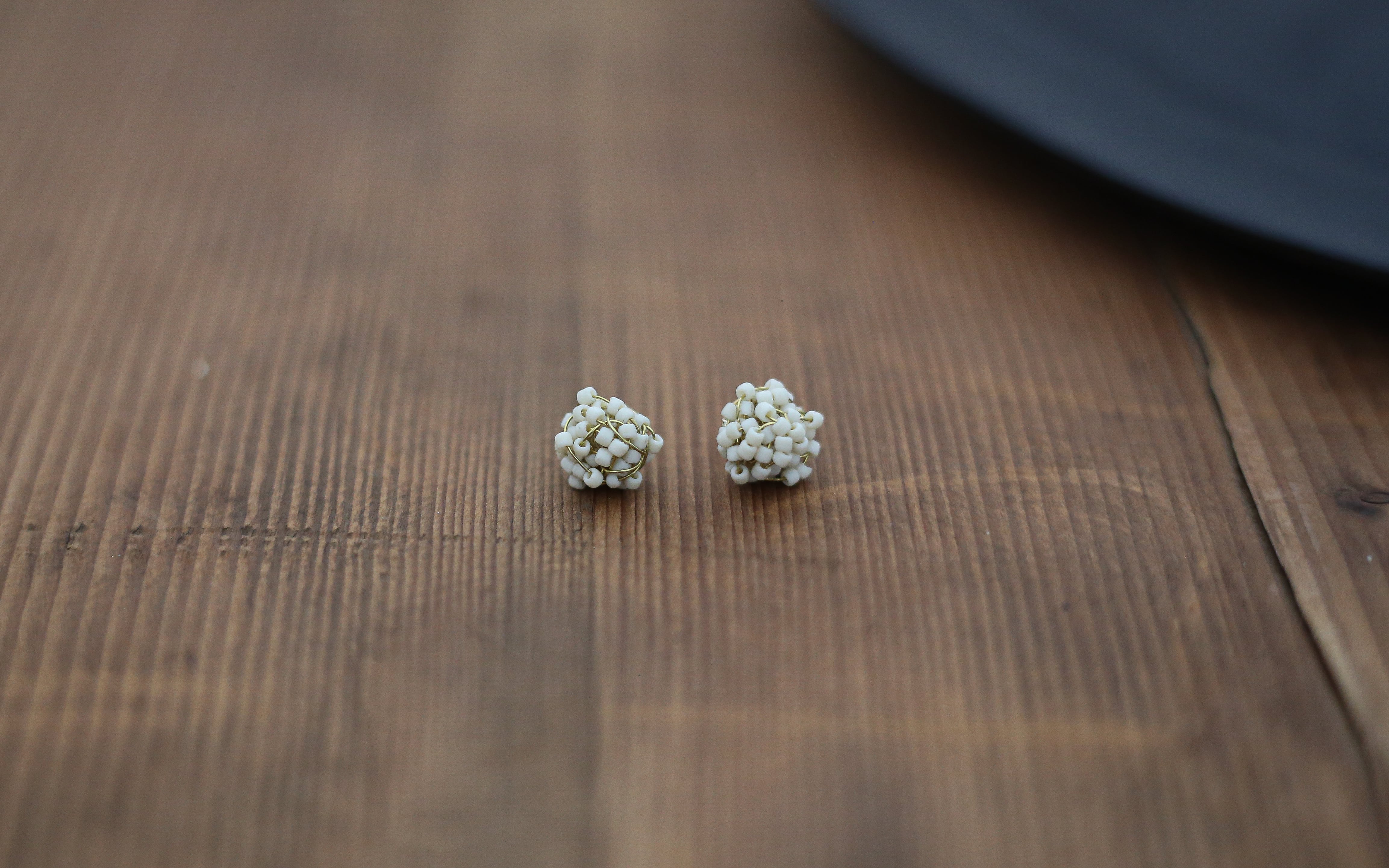 乳白色の極小1ミリのビーズにゴールドのワイヤーでパーツを仕立ております。
