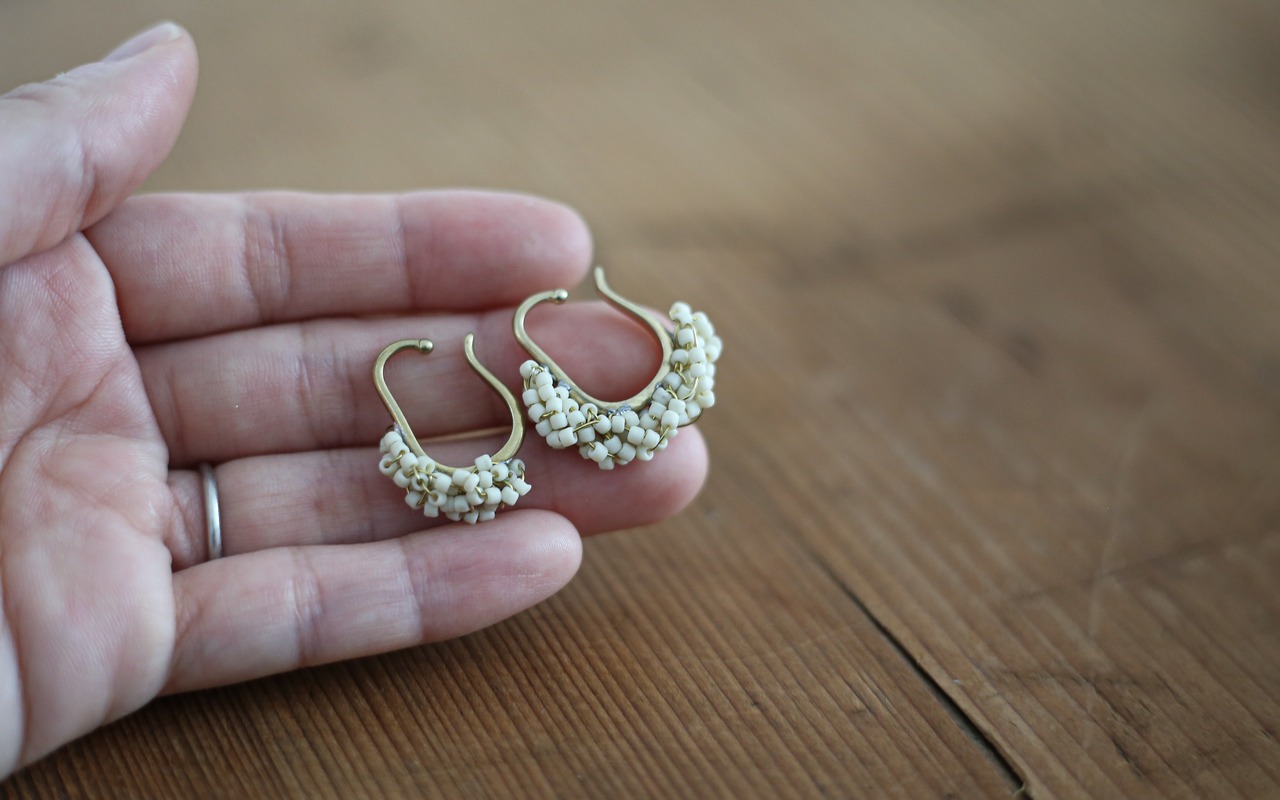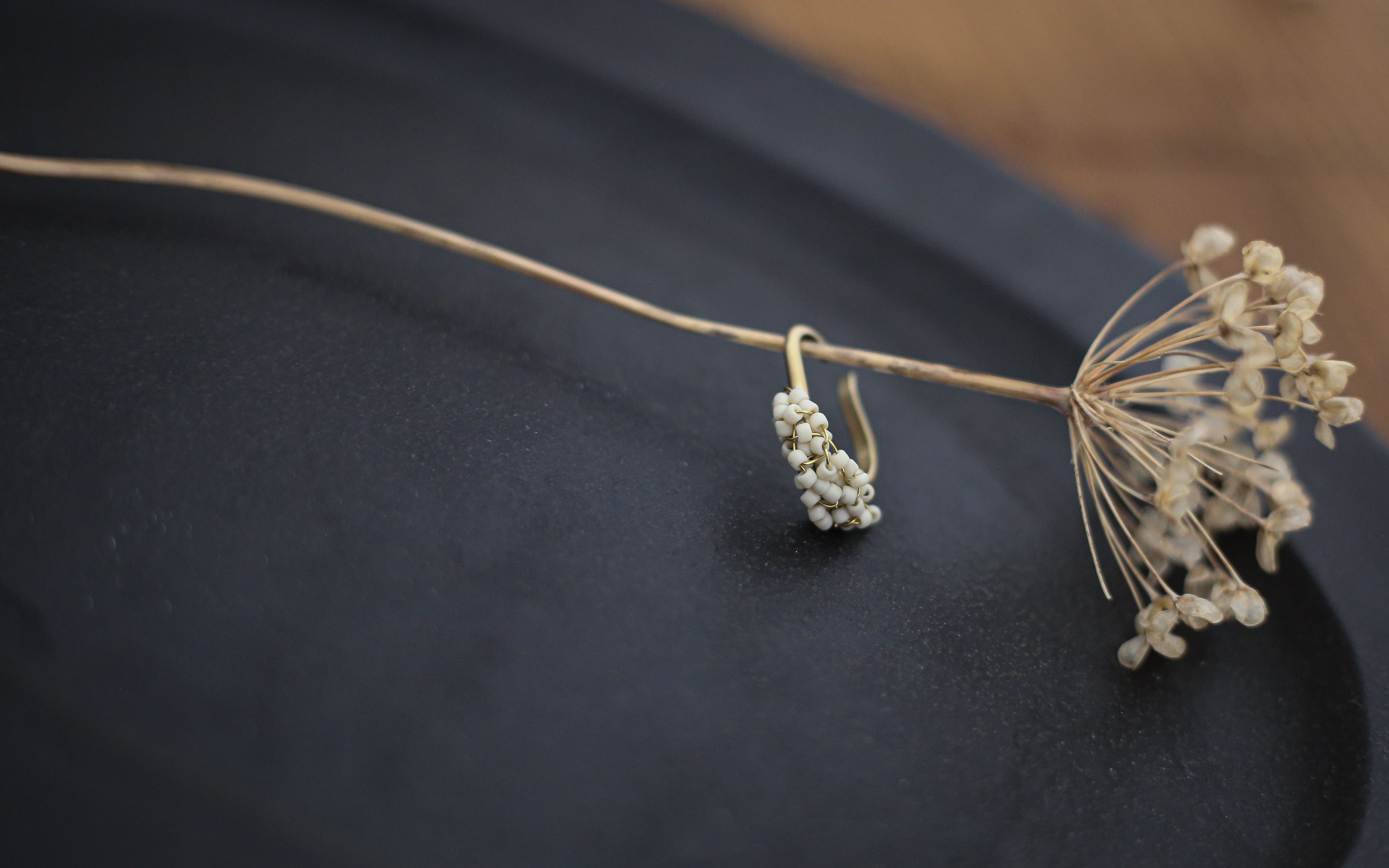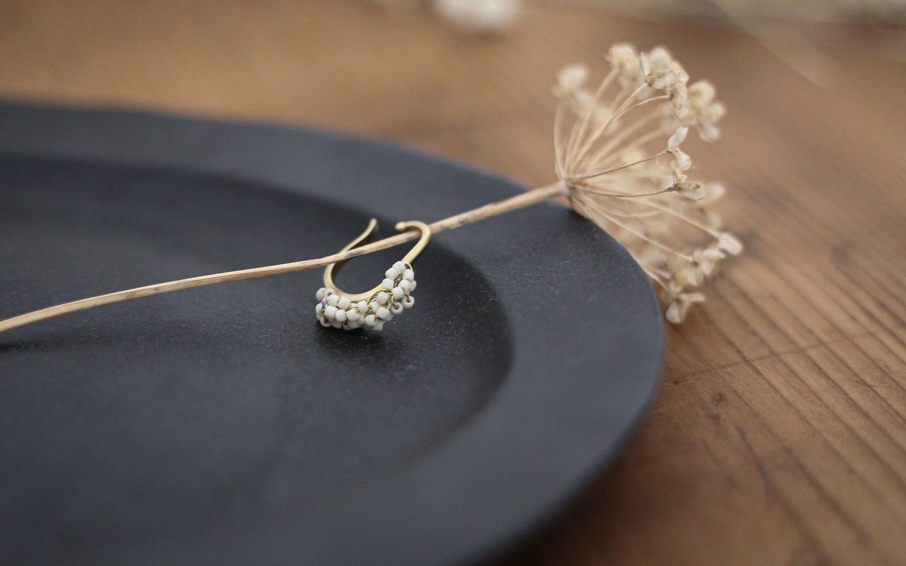 アイボリービーズにゴールドのワイヤーで仕立ております。