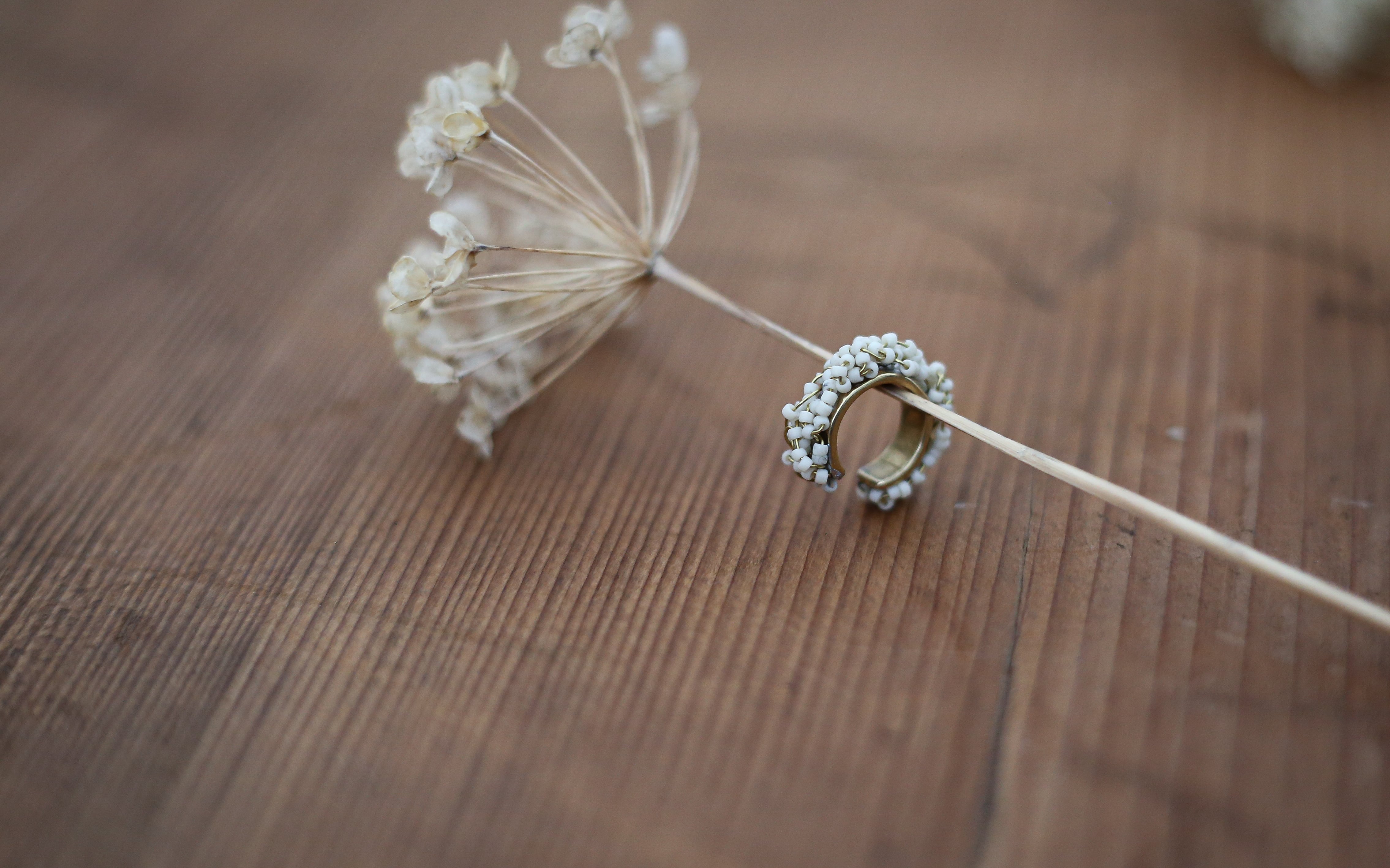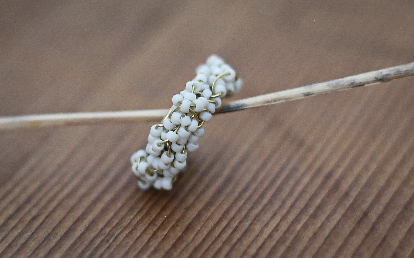 極小1ミリの艶消し乳白色ビーズにゴールドのワイヤーで仕立ております。