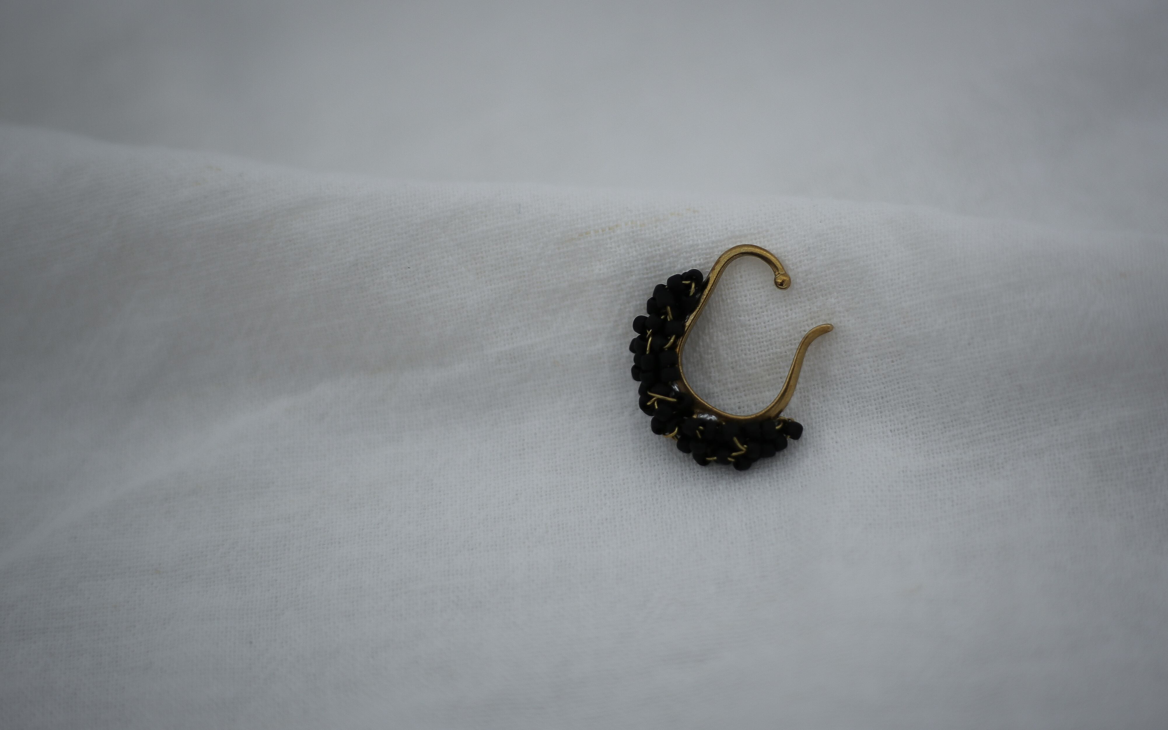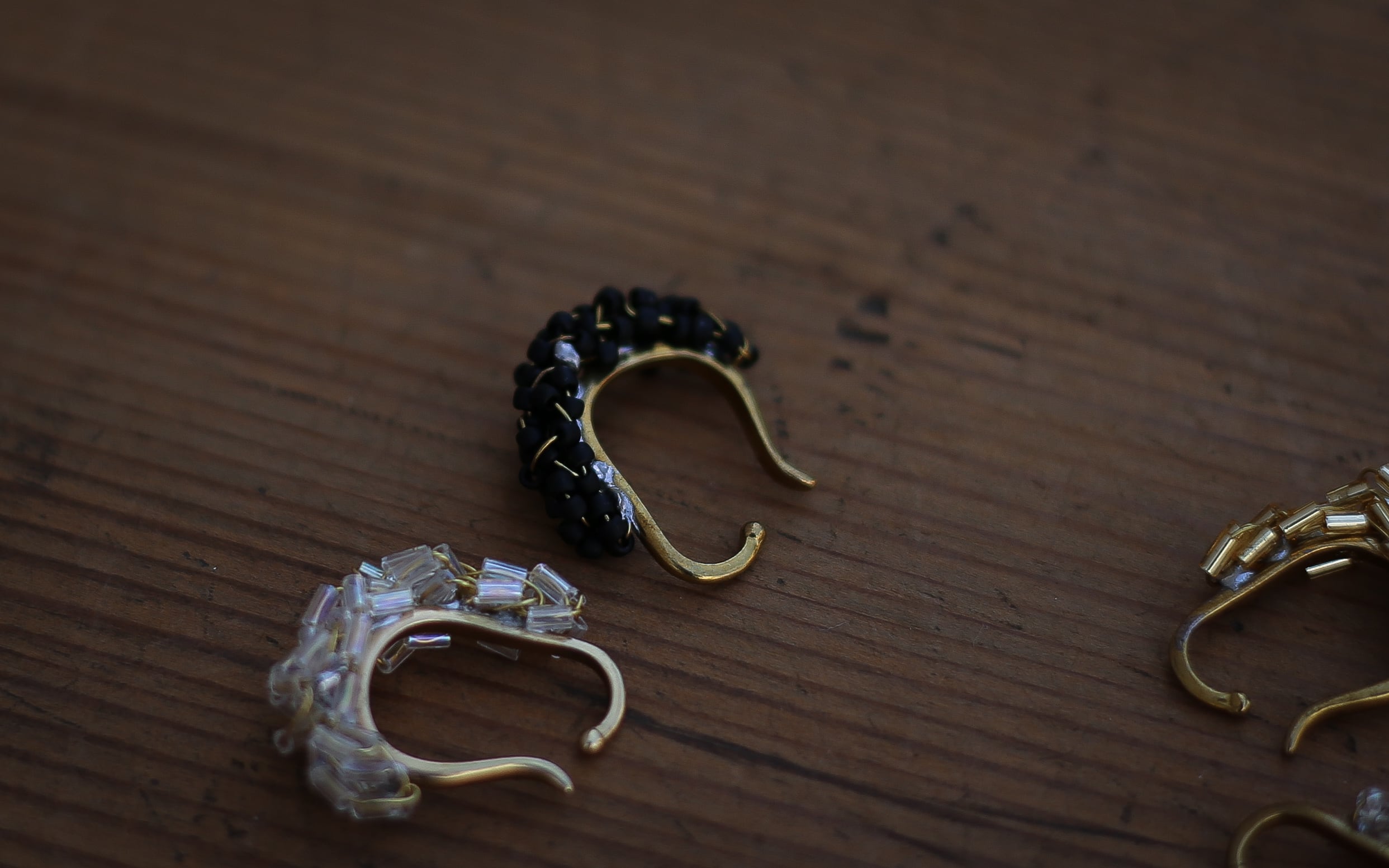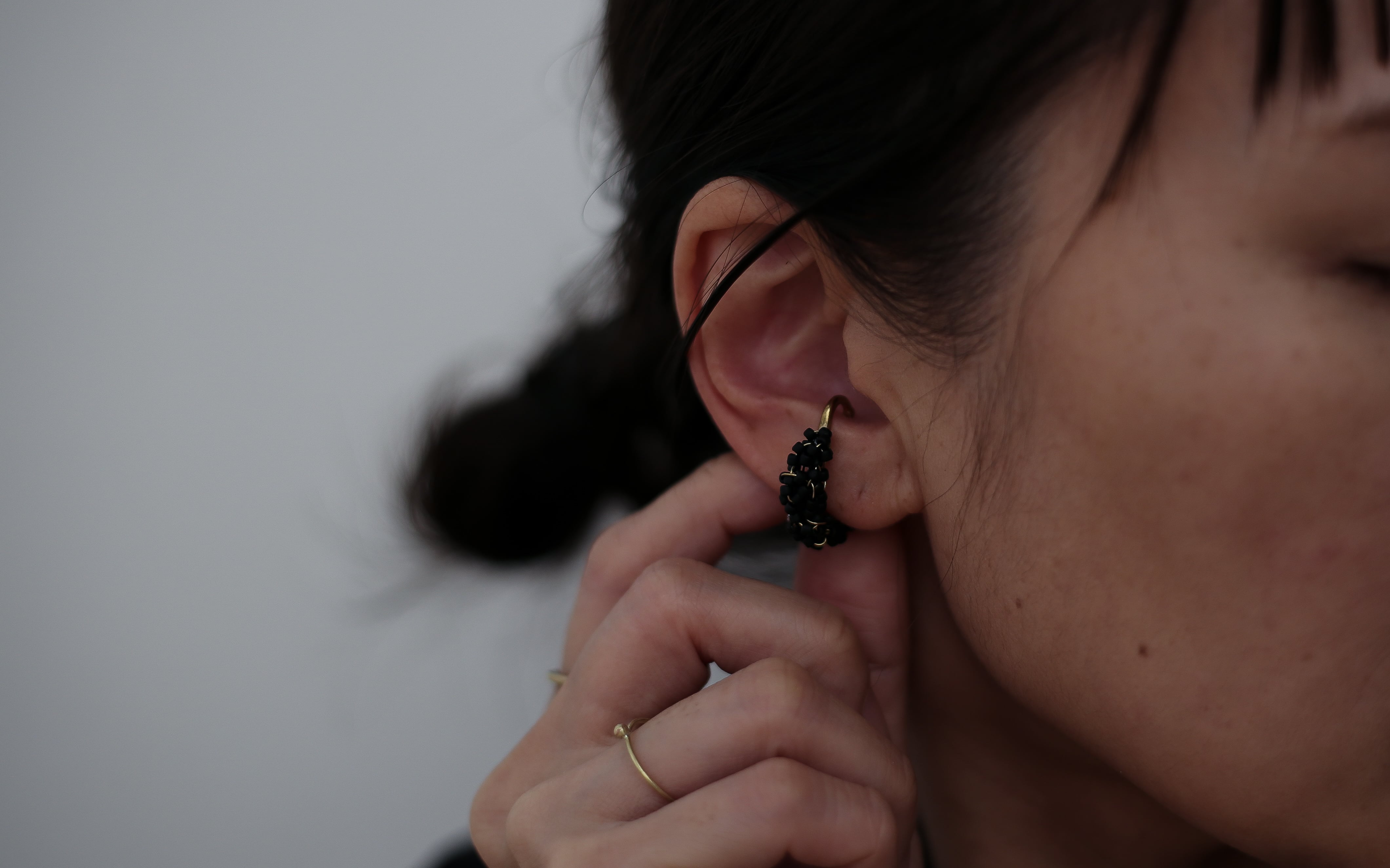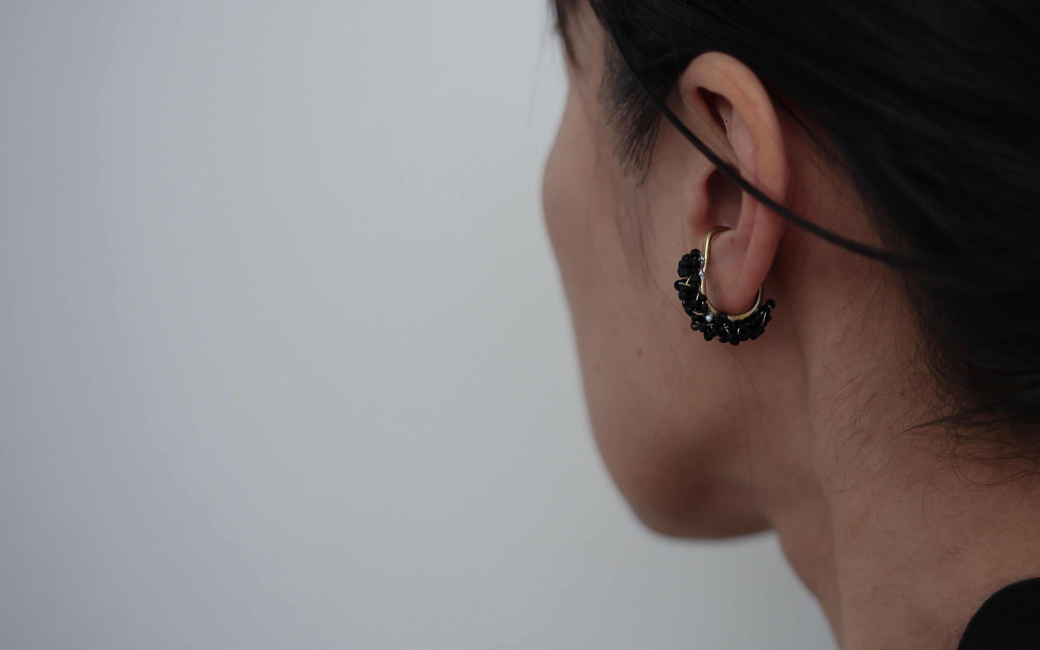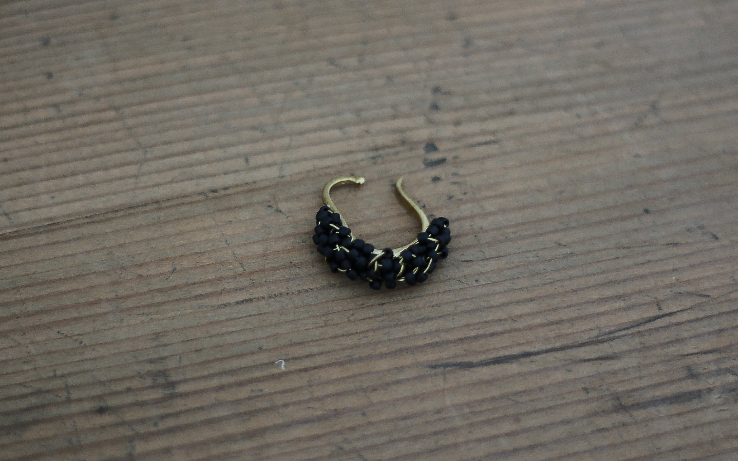 艶消しの黒のビーズをゴールドの真鍮ワイヤーで仕立てております。