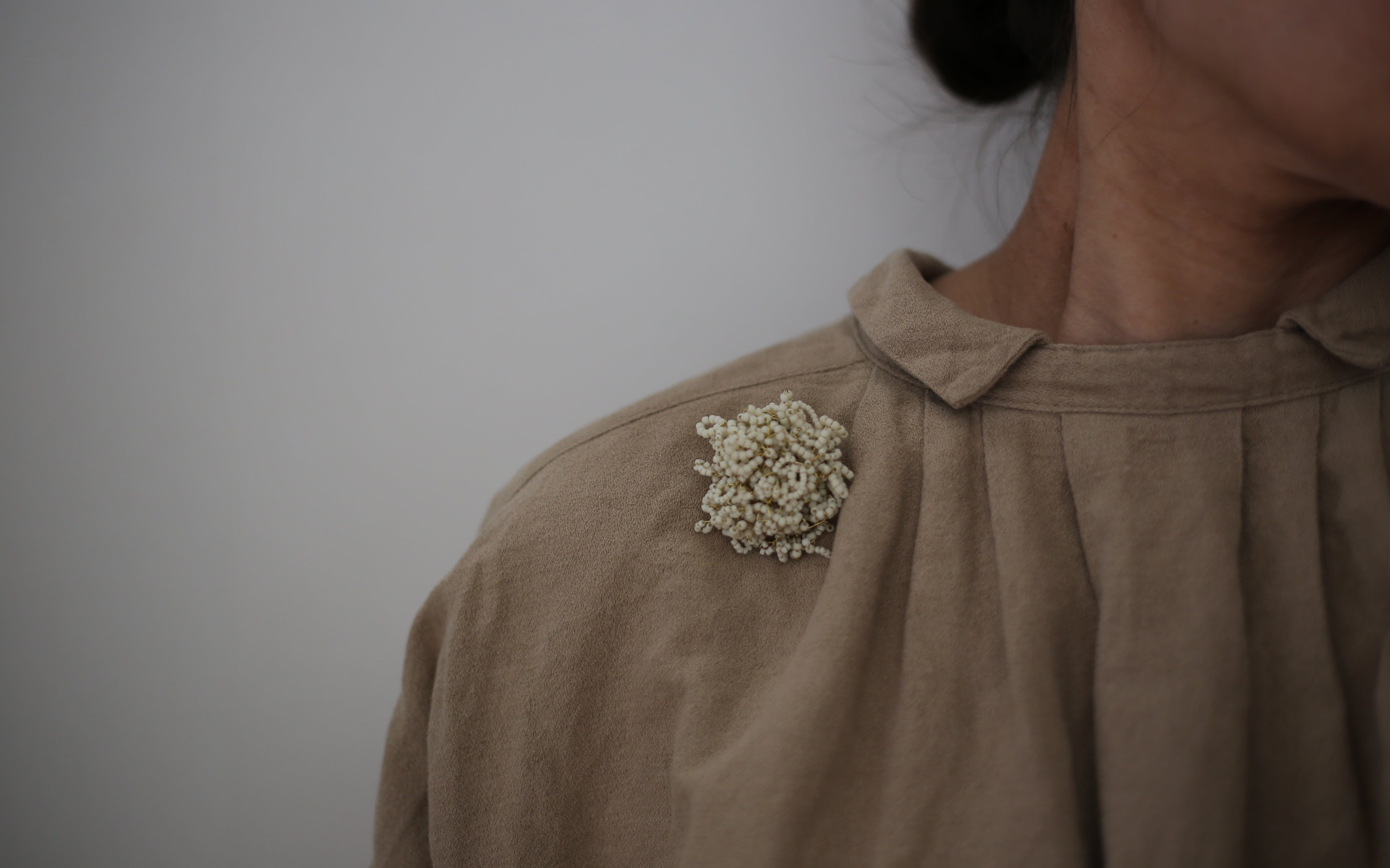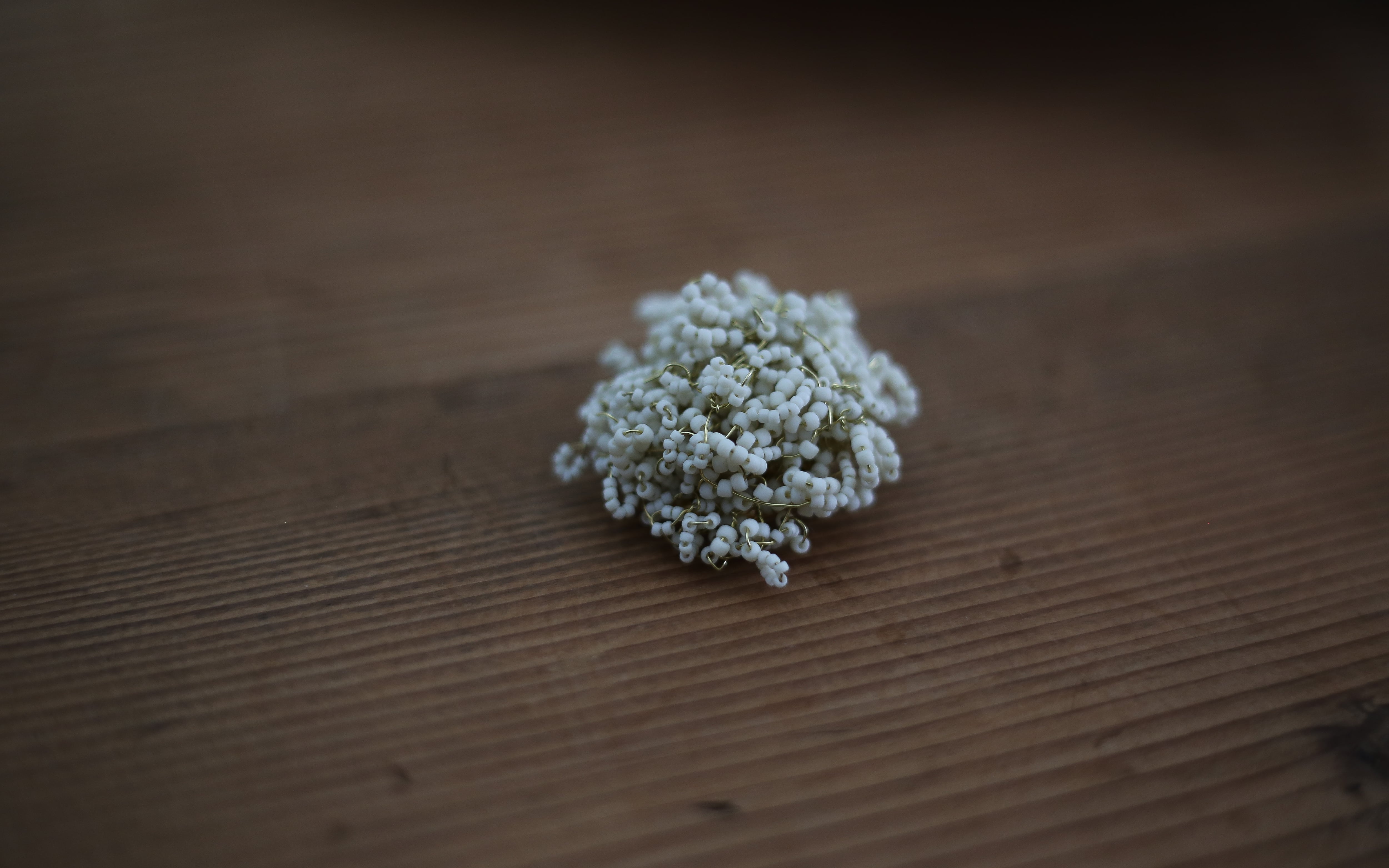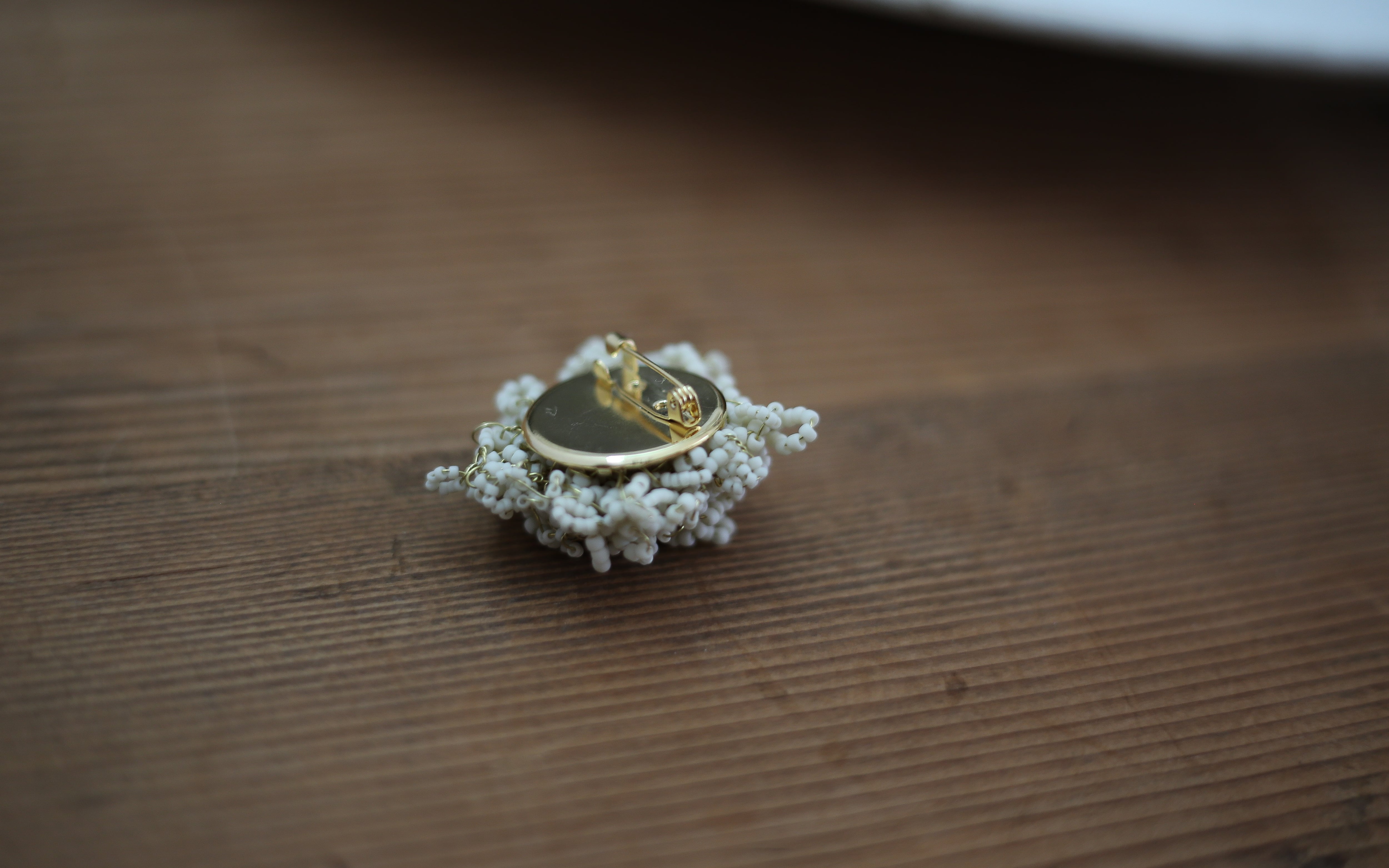 アイボリーのFog定番のビーズと極小1ミリのビーズの2種使用し、ゴールドの真鍮ワイヤーで仕立ております。