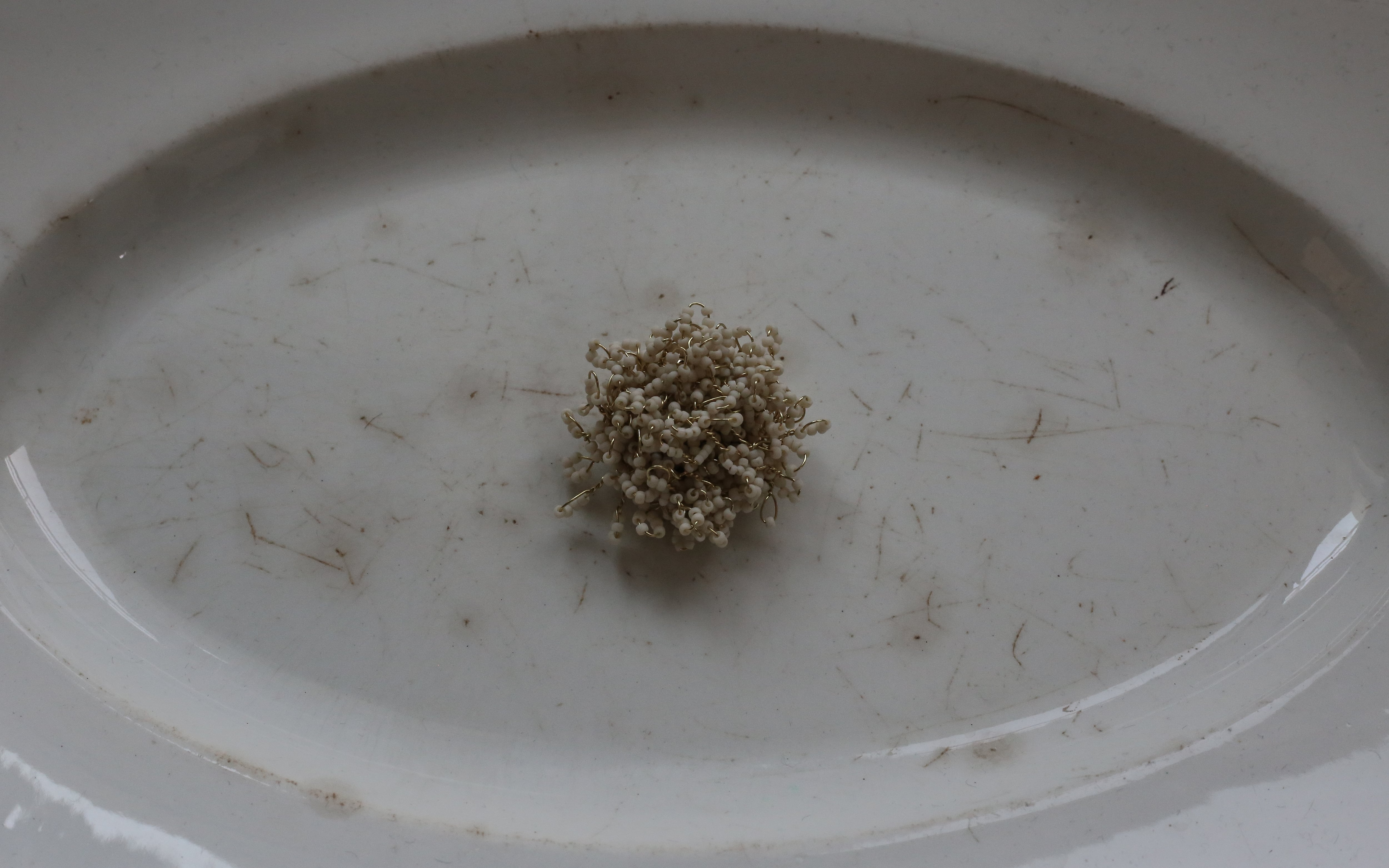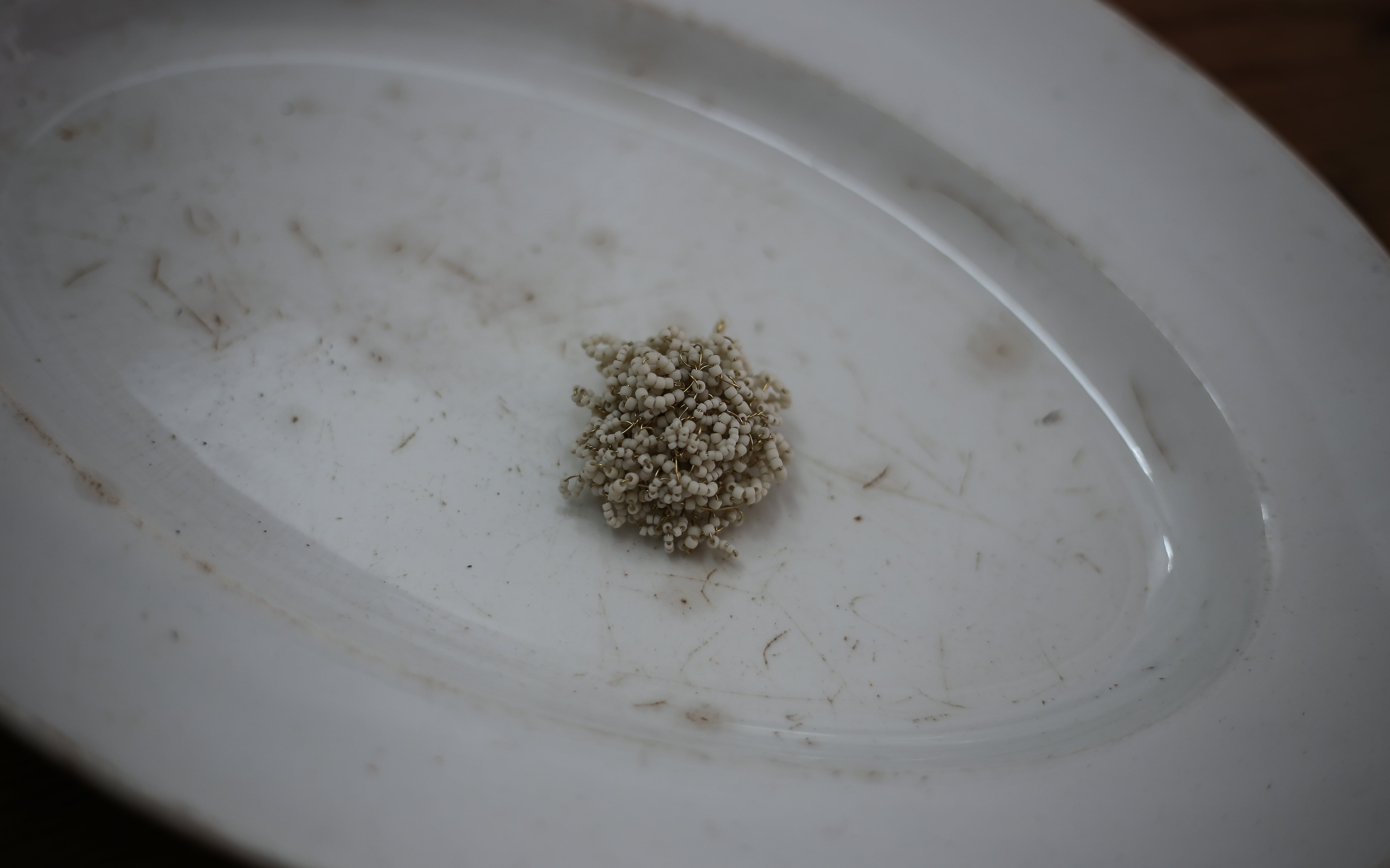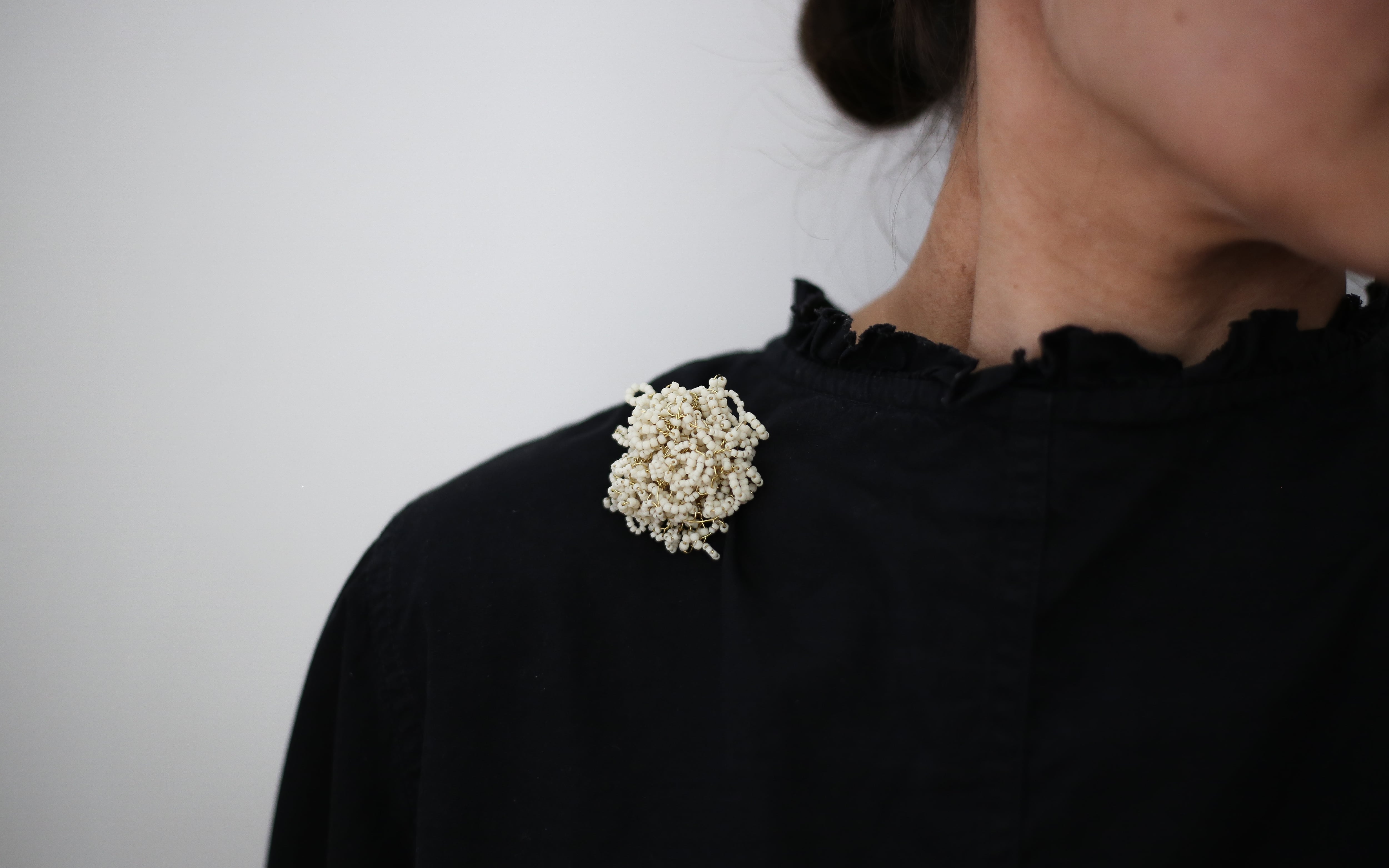 アイボリーのFog定番のビーズと極小1ミリのビーズの2種使用し、ゴールドの真鍮ワイヤーで仕立ております。