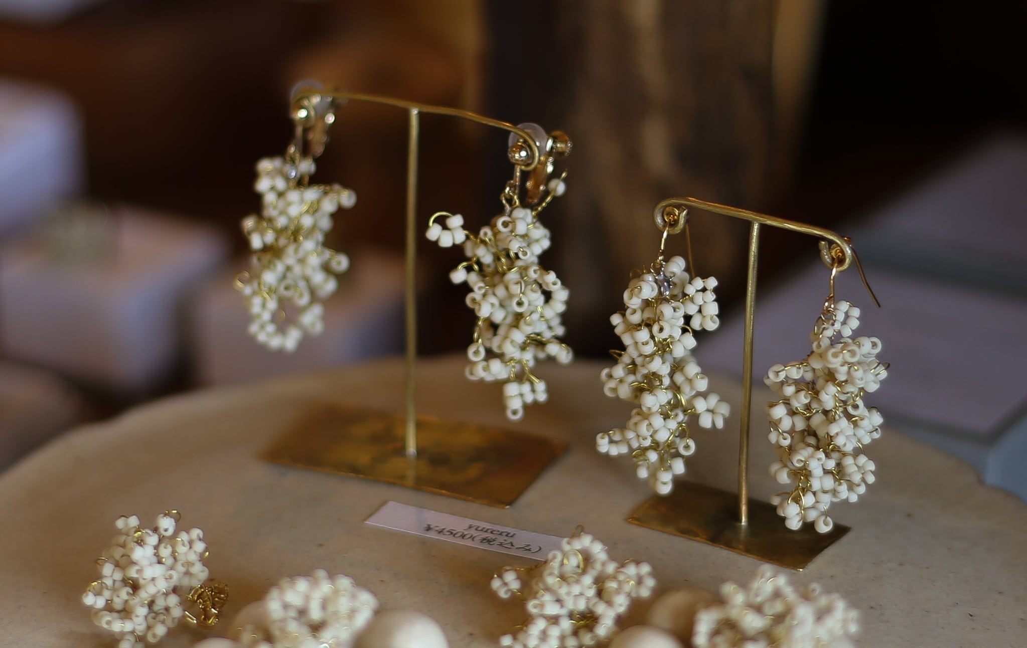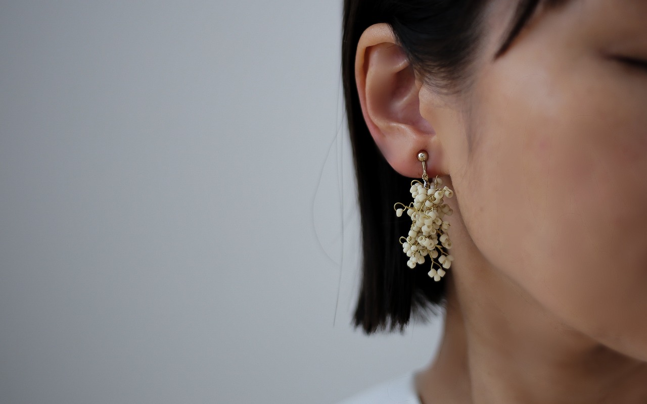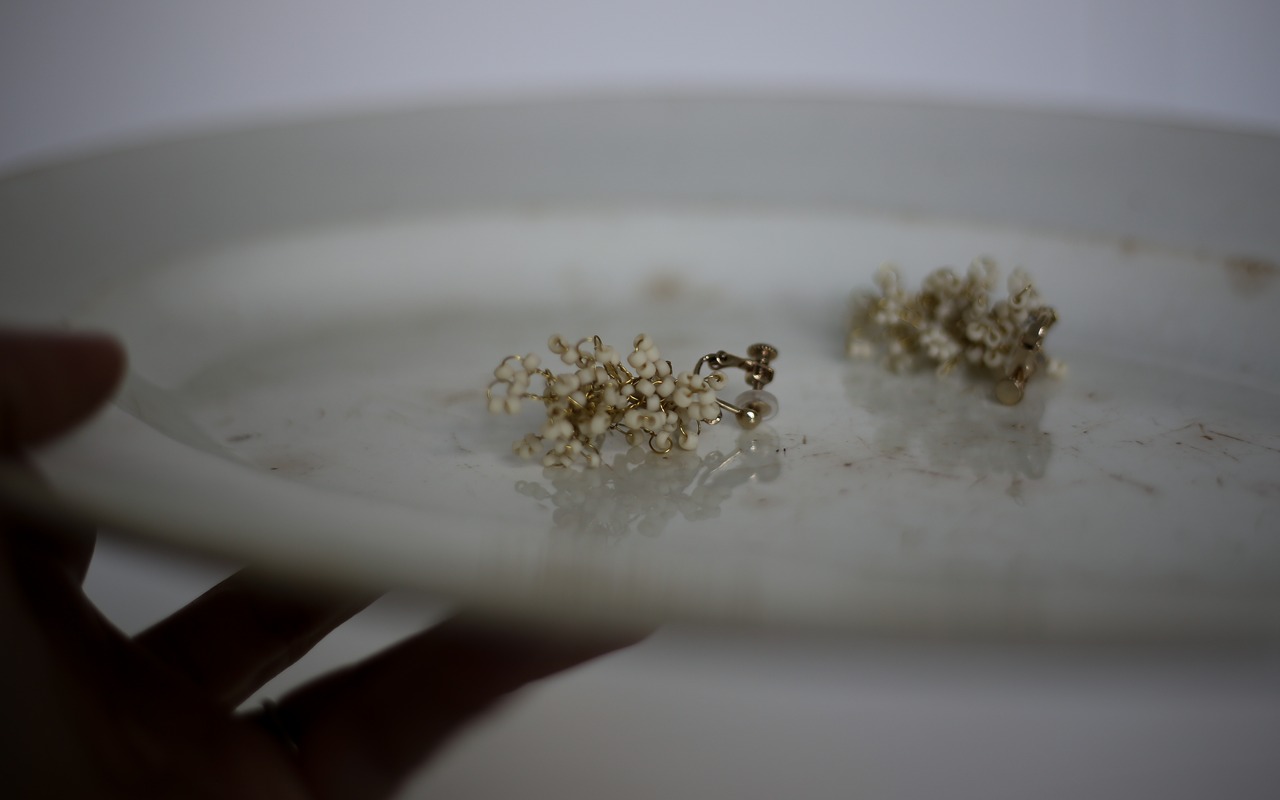 乳白色のビーズにゴールドのワイヤーでパーツを仕立ております。