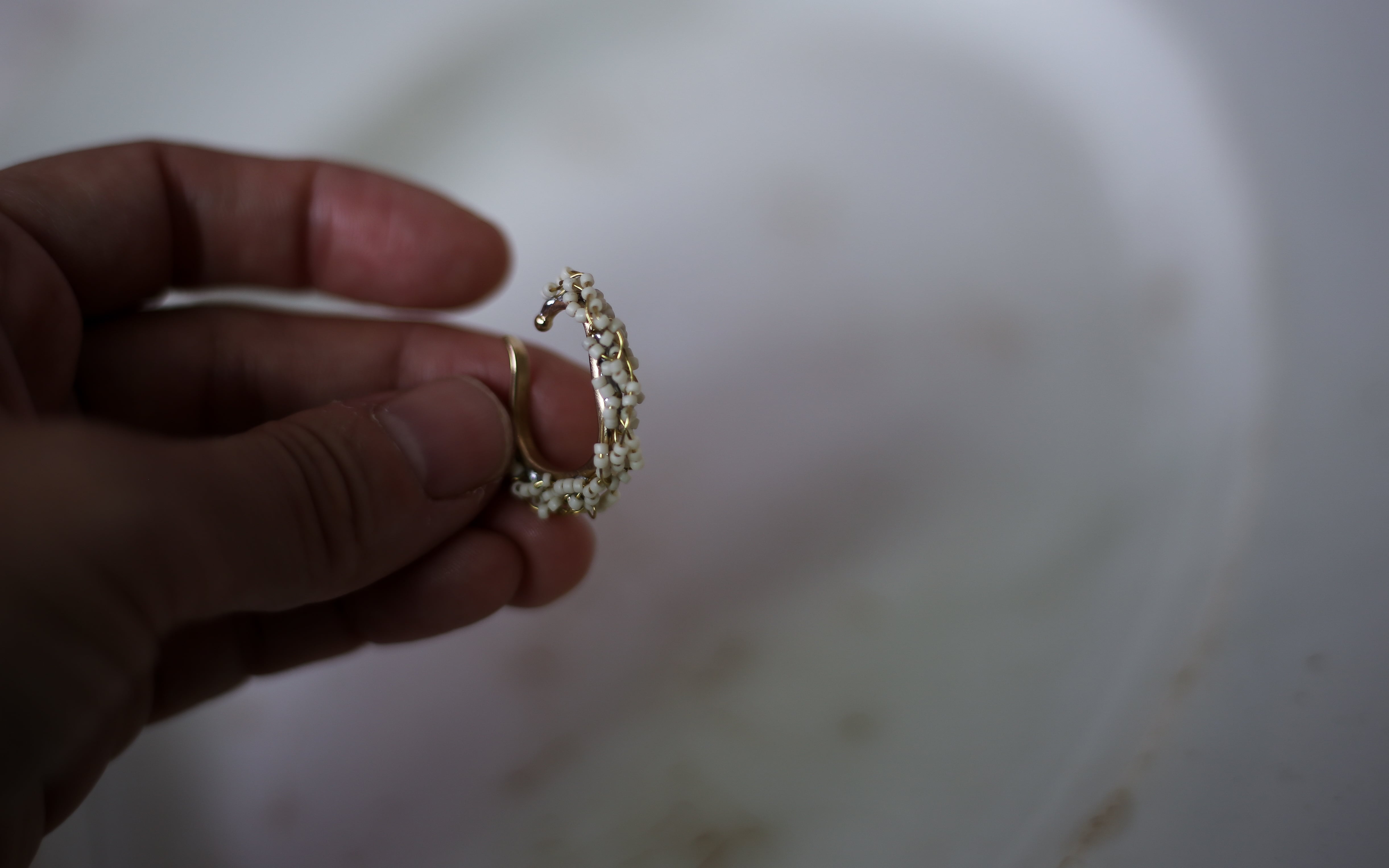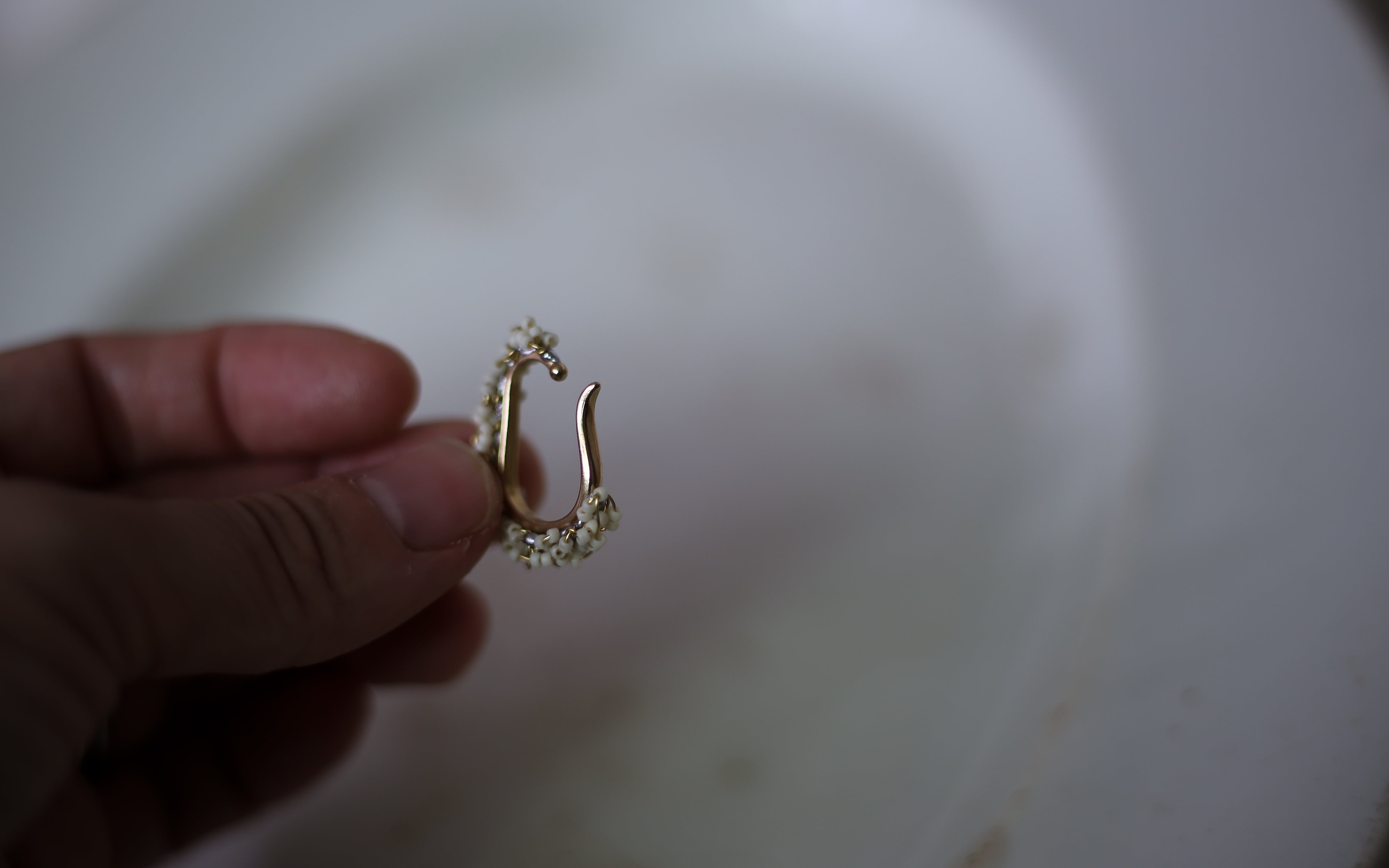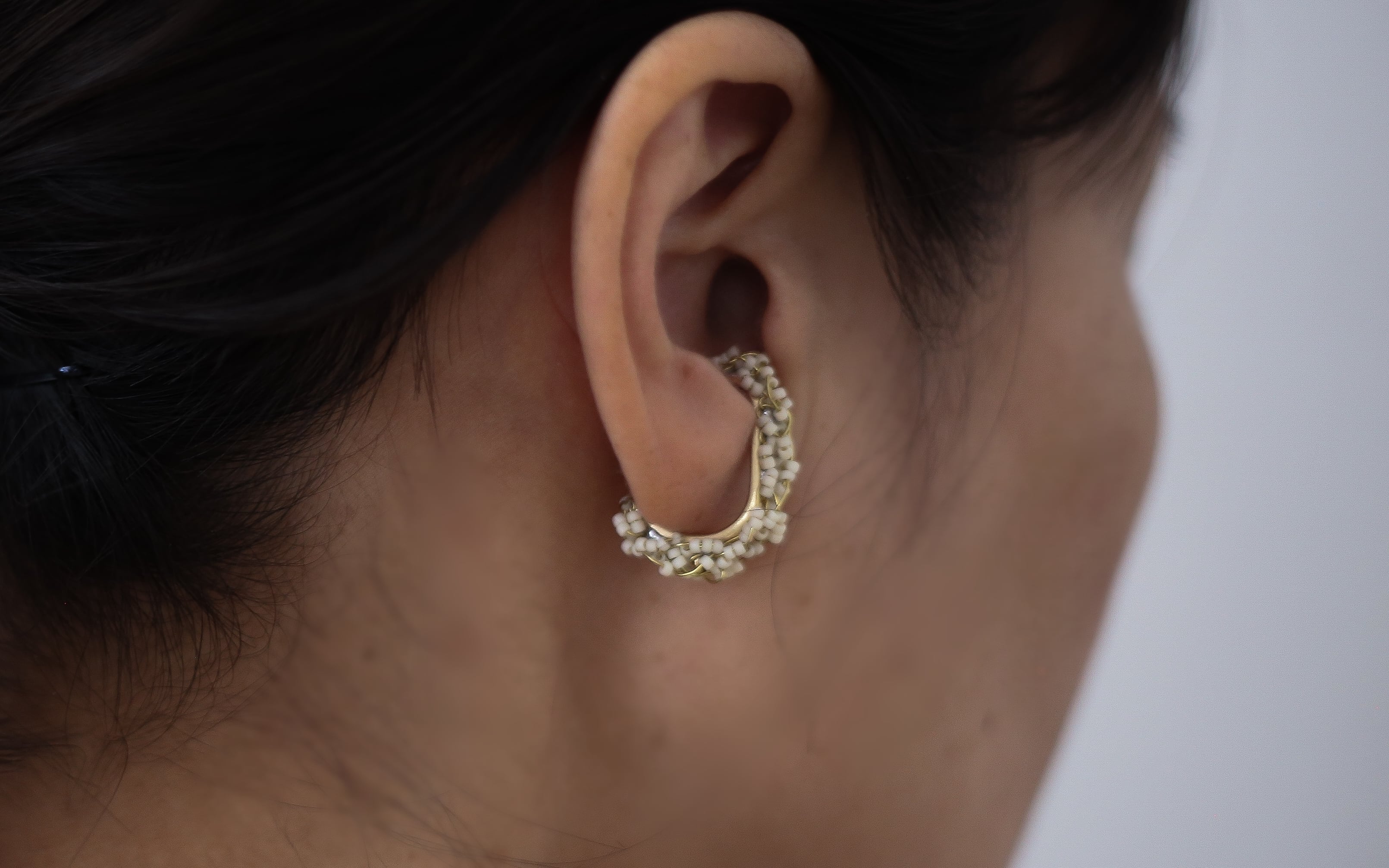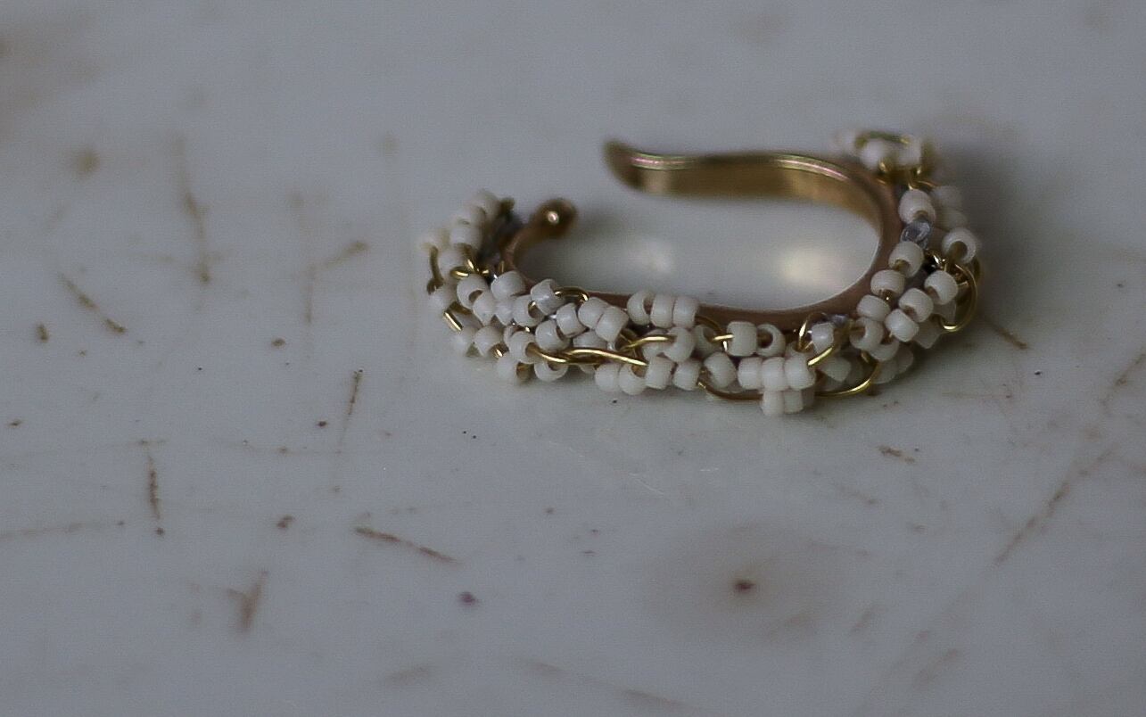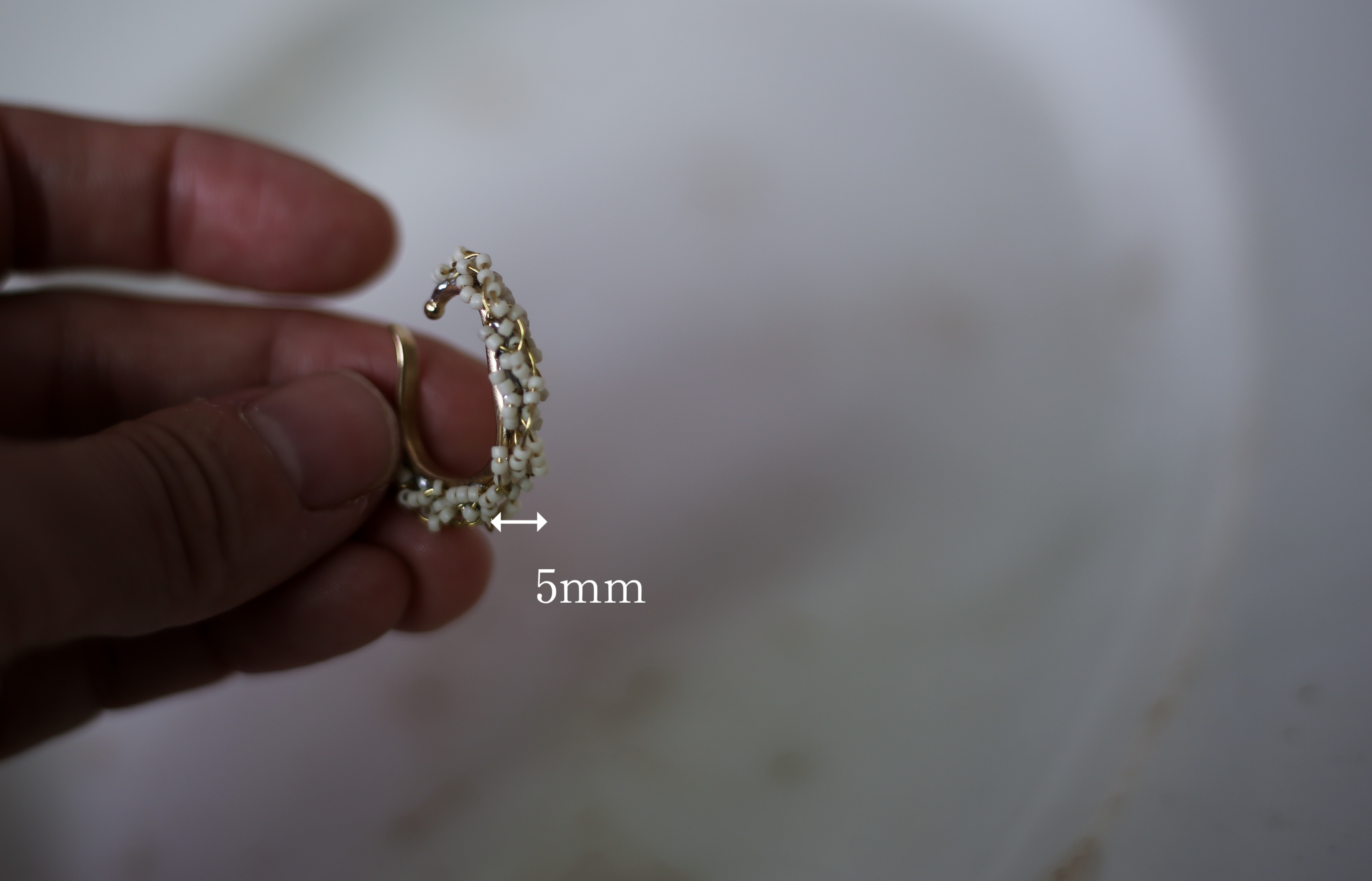 艶消しのアイボリーのビーズをゴールドの真鍮ワイヤーで仕立てております。