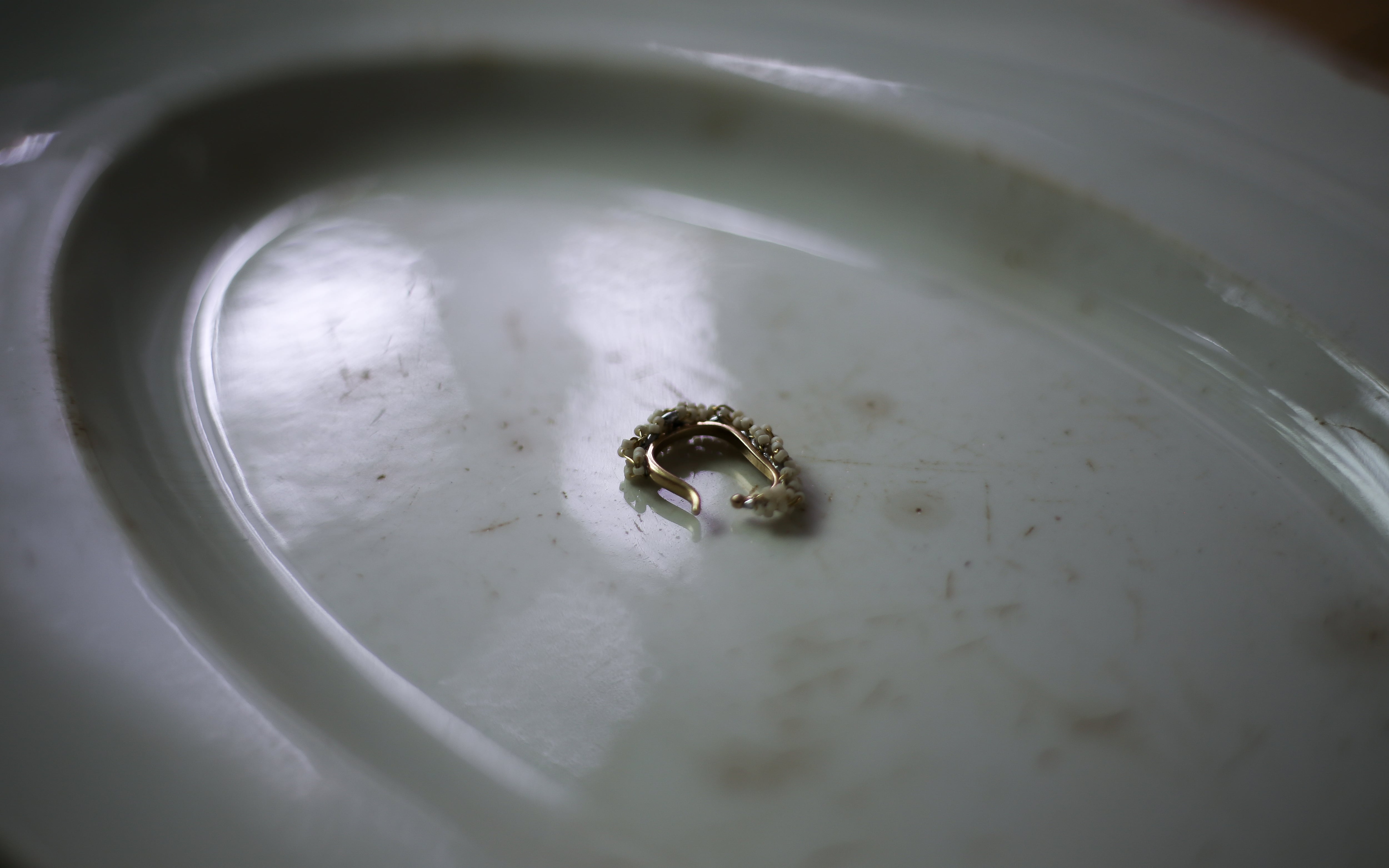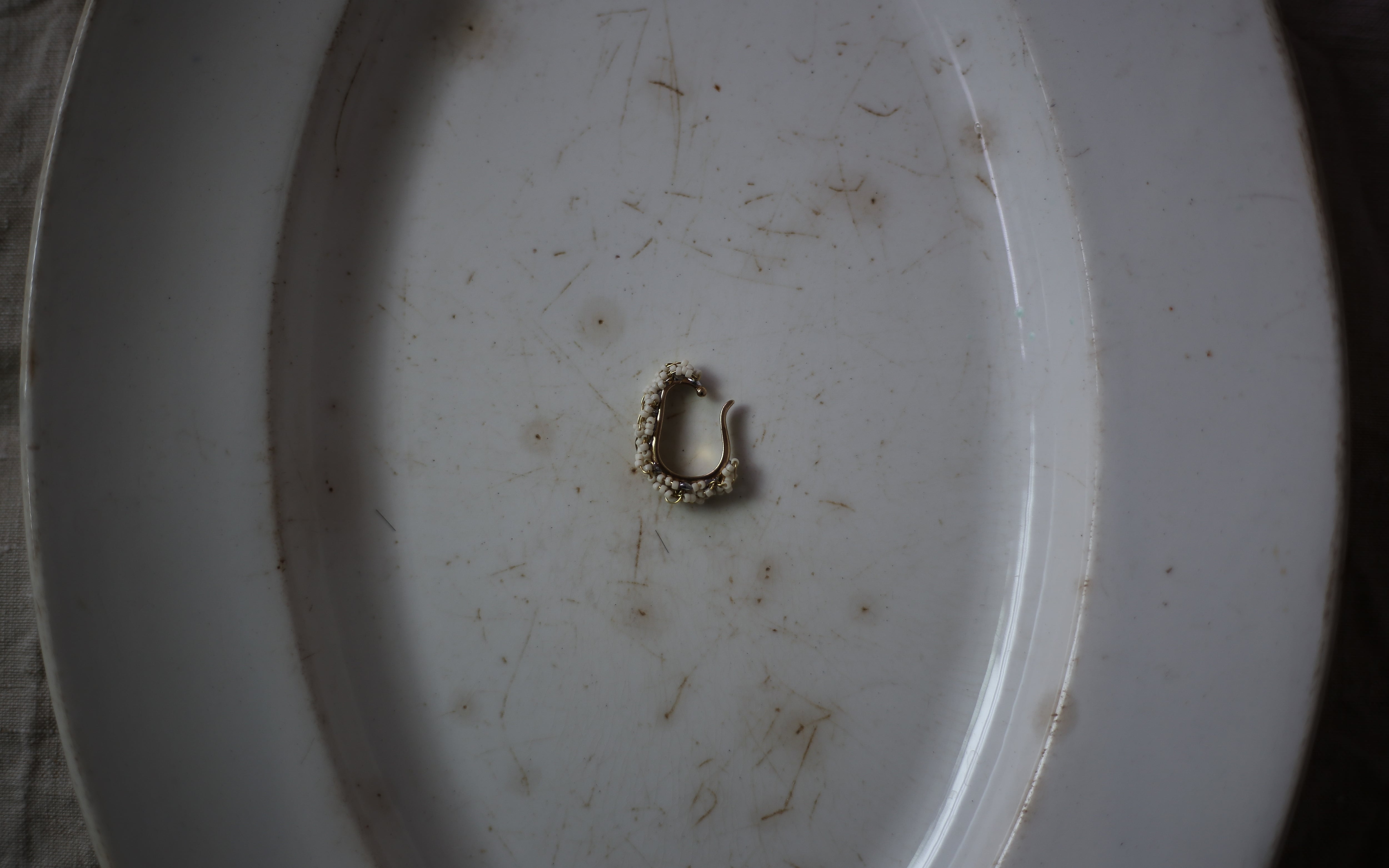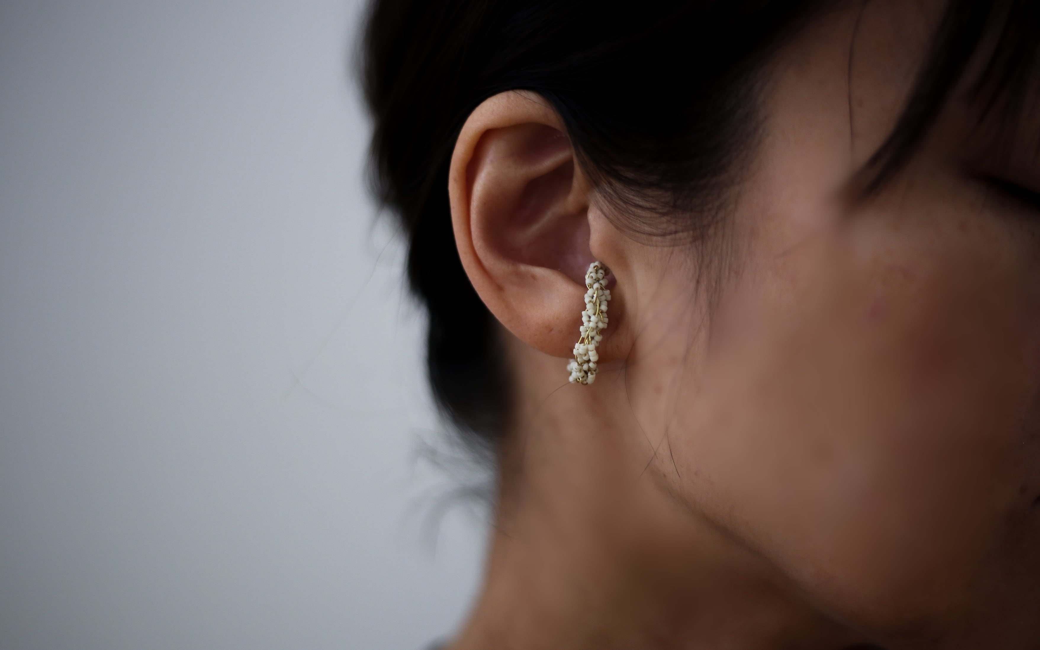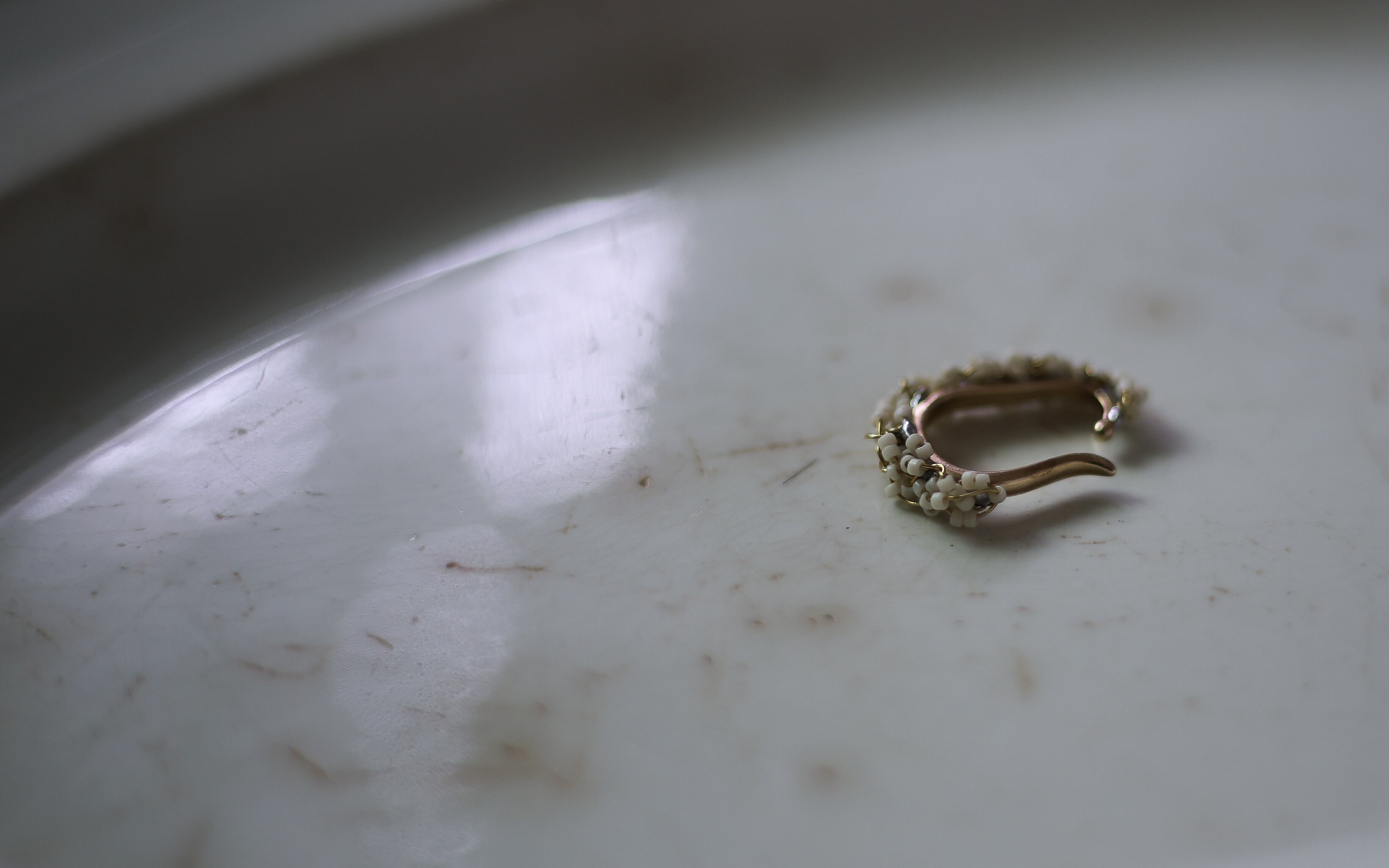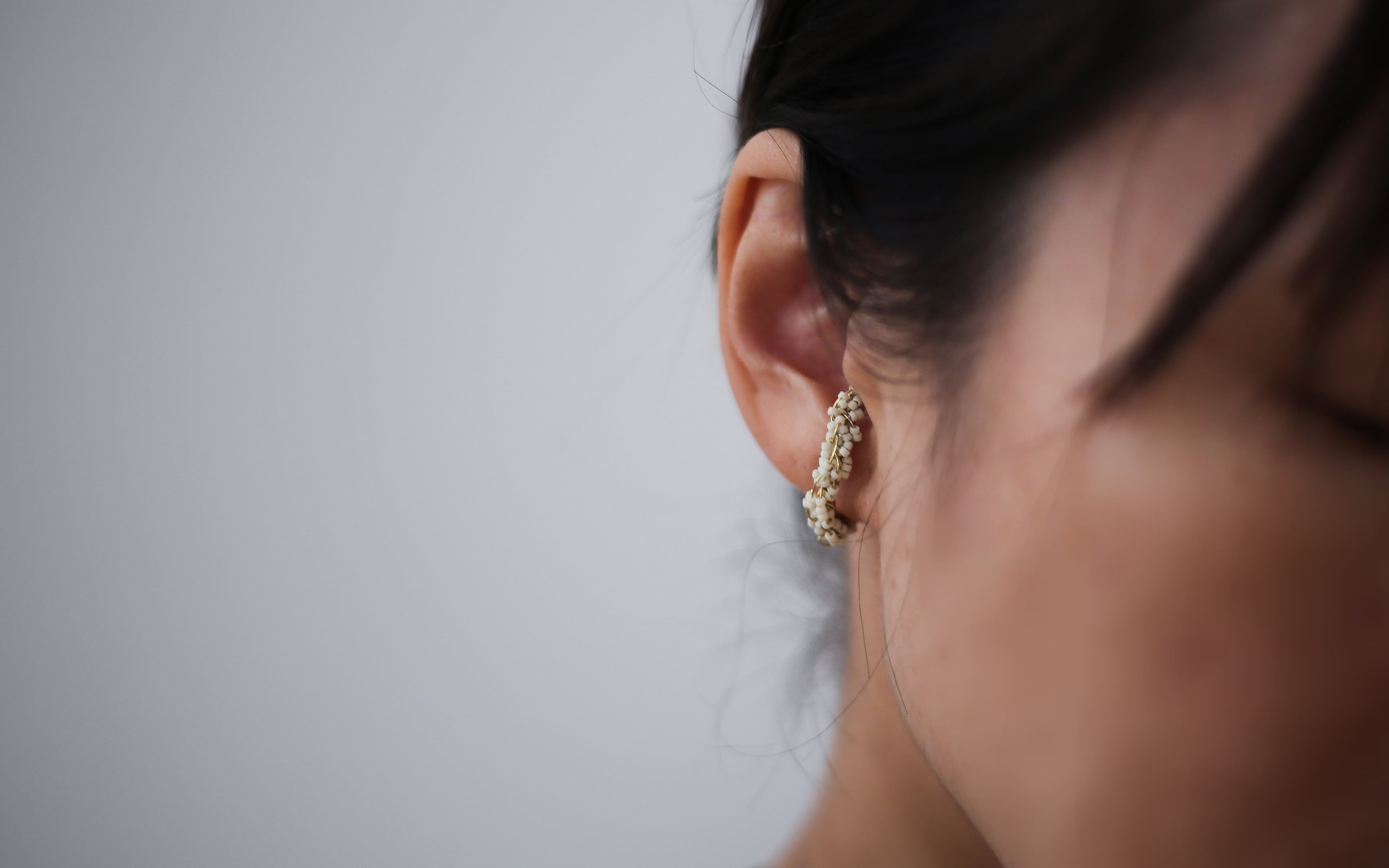 艶消しのアイボリーのビーズをゴールドの真鍮ワイヤーで仕立てております。