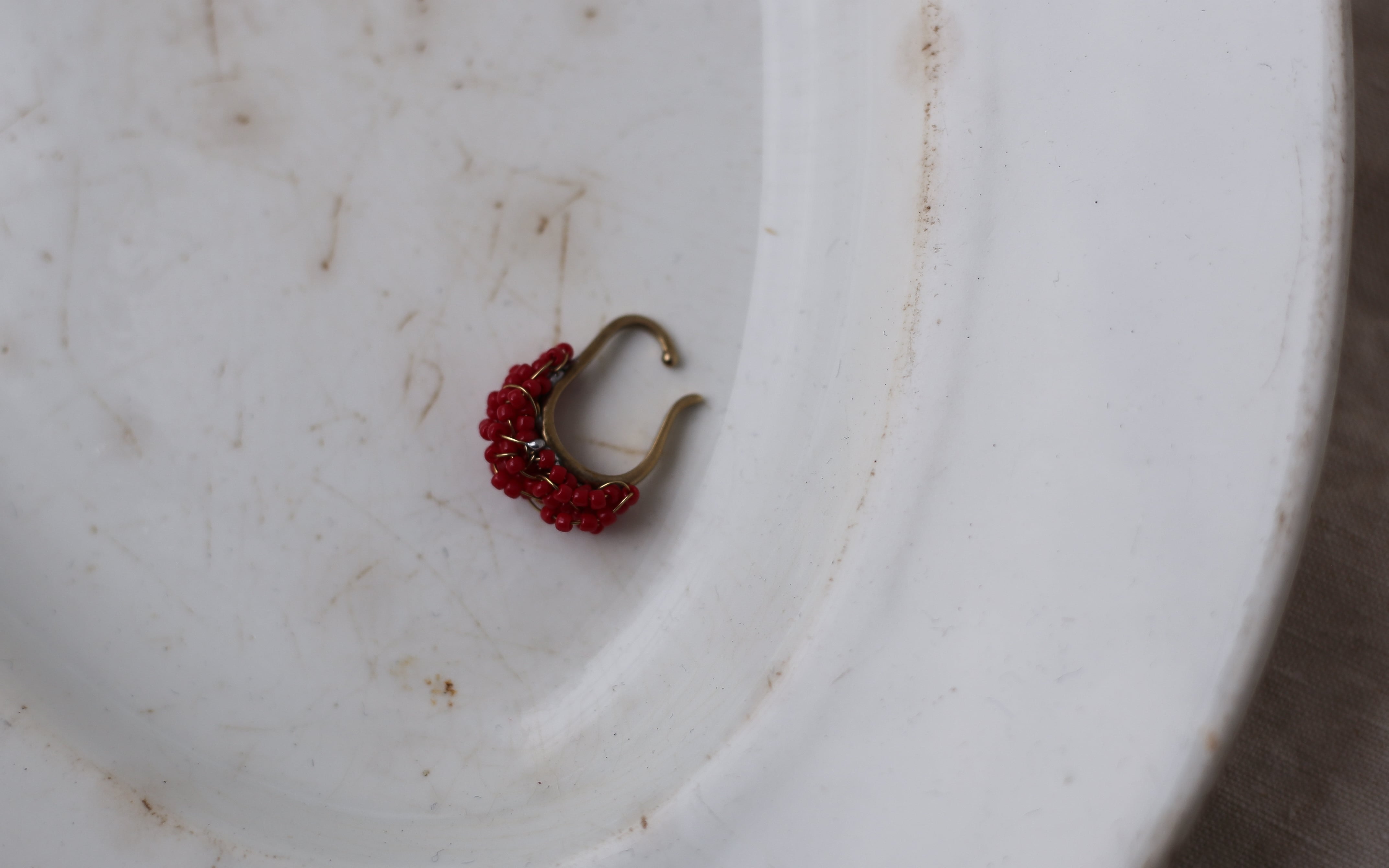 赤の艶のあるビーズをゴールドの真鍮ワイヤーで仕立てております。